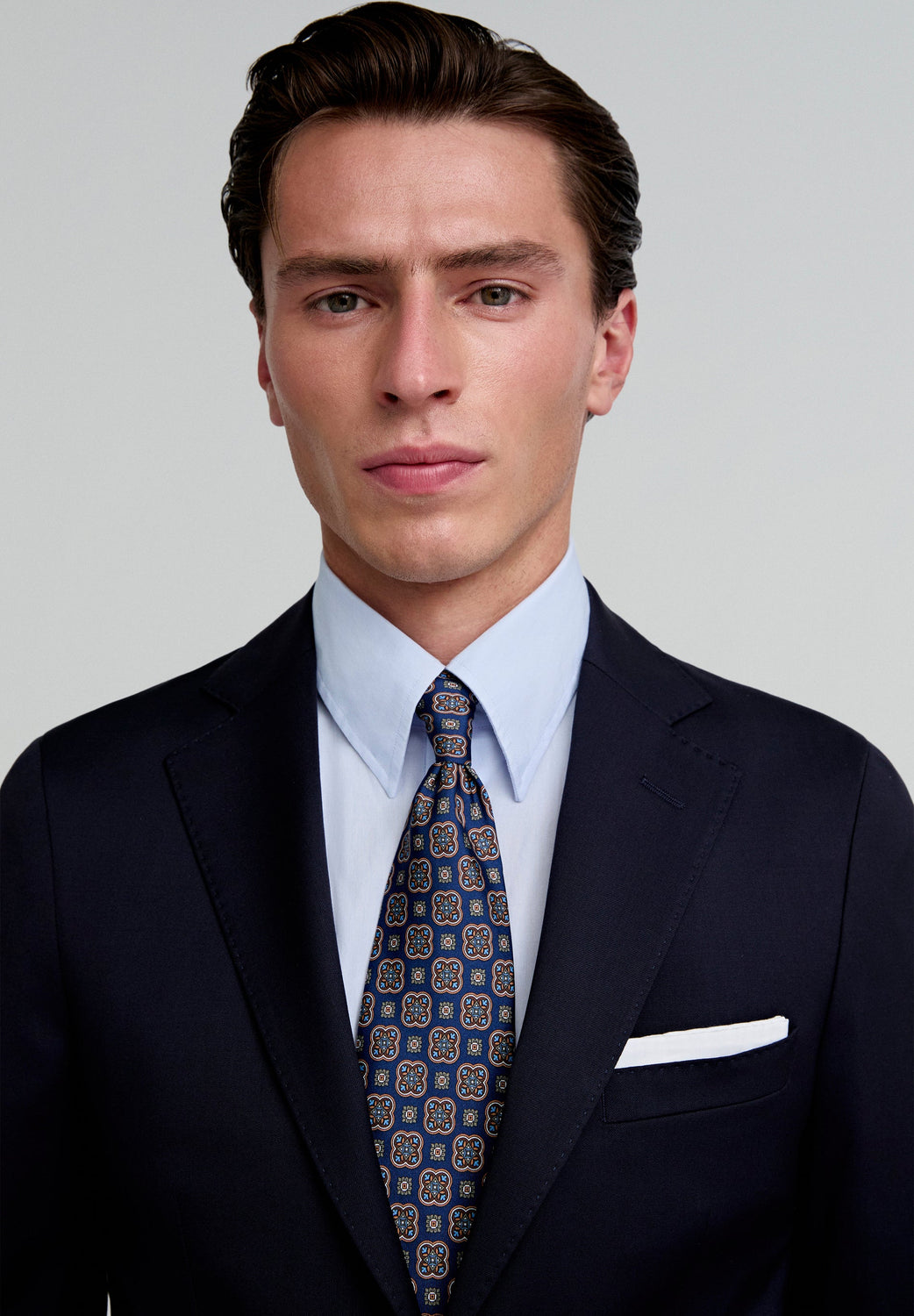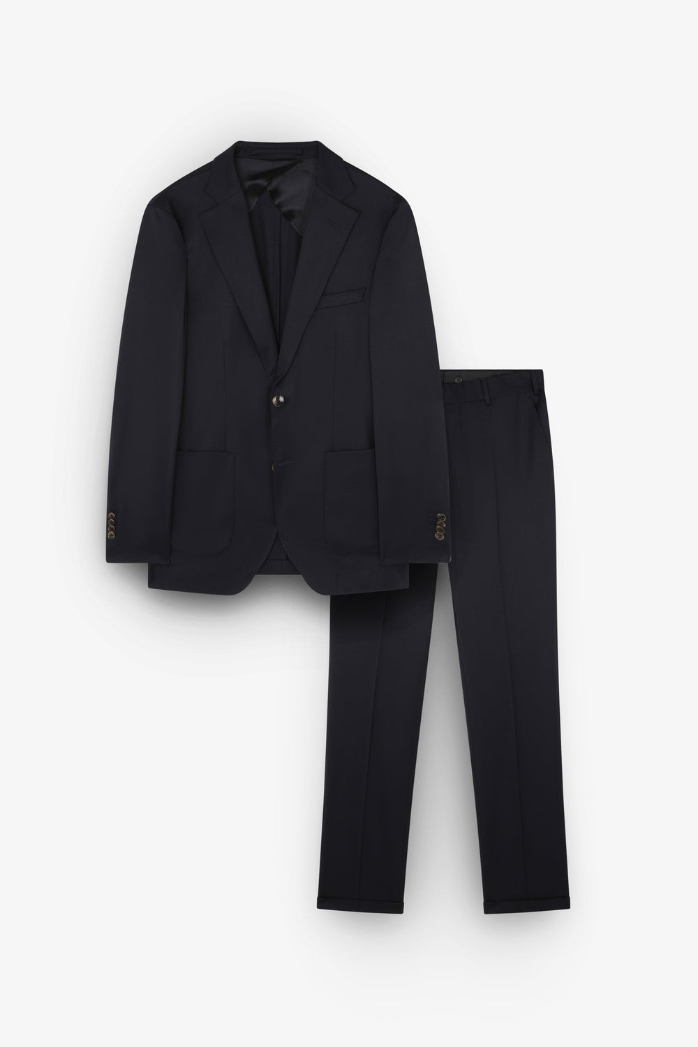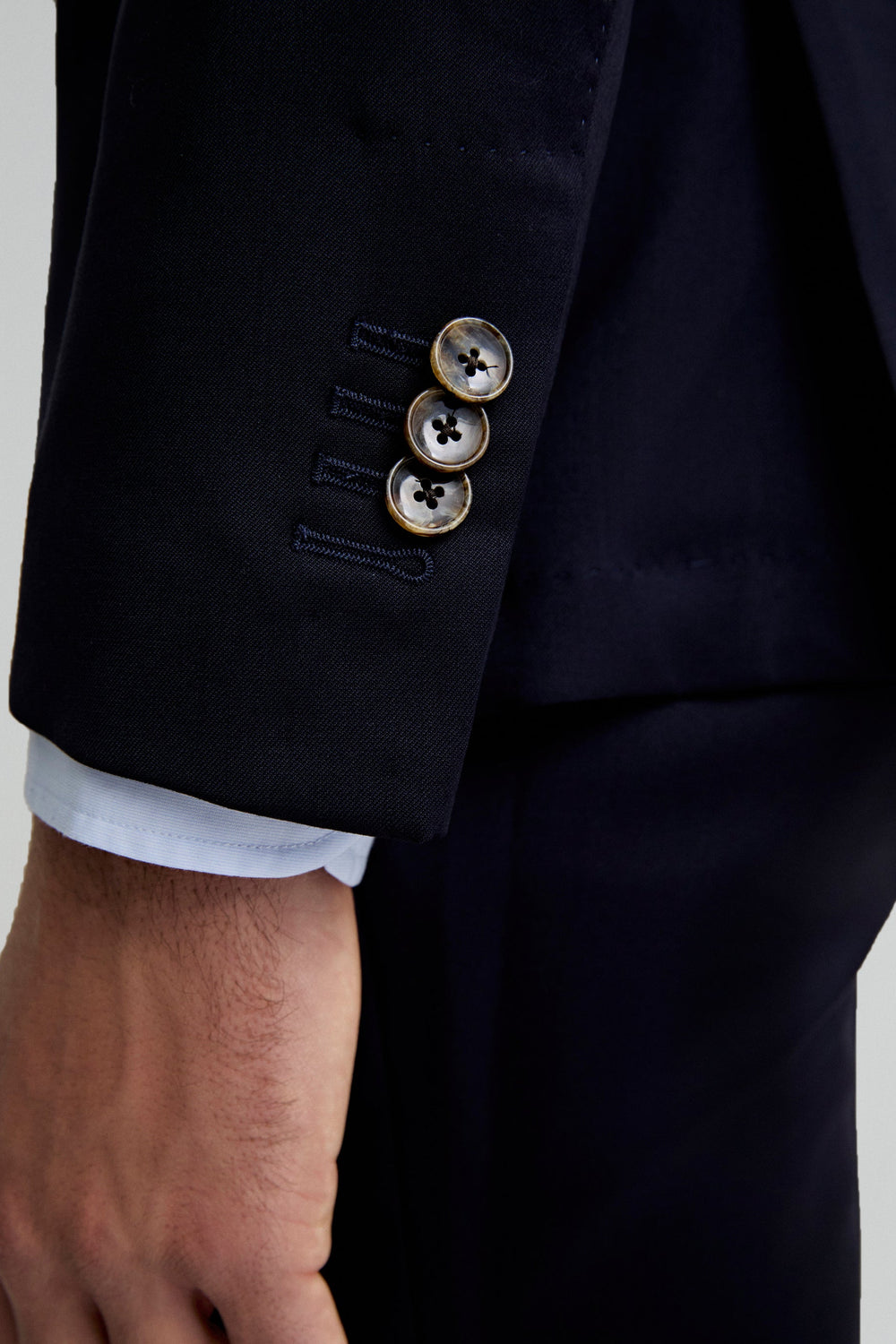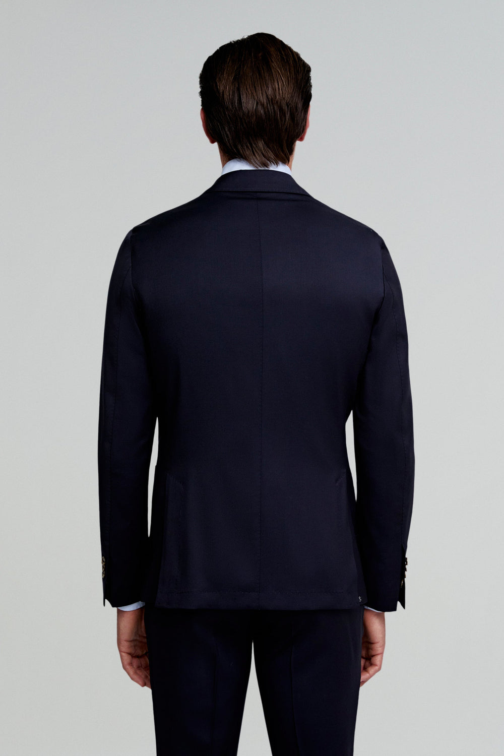 - Semi-structured blazer with no lining, notched lapel collar and button fastening. Long sleeves with one workable cuff and one closed one. Patch pockets