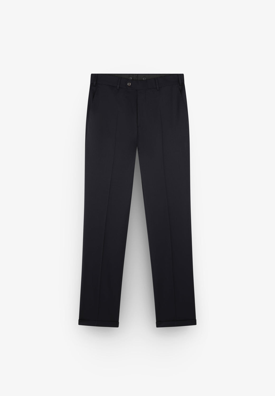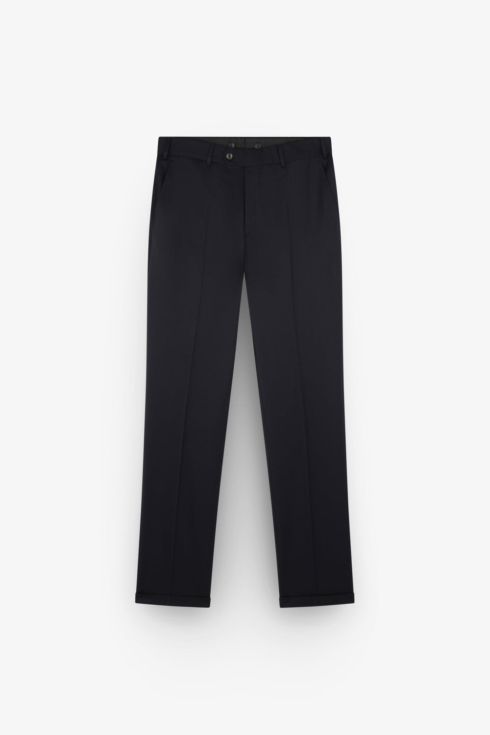 - Straight trousers with an extended button-up fastening at the waist and a zip. Simple hems and belt loops at the waist.