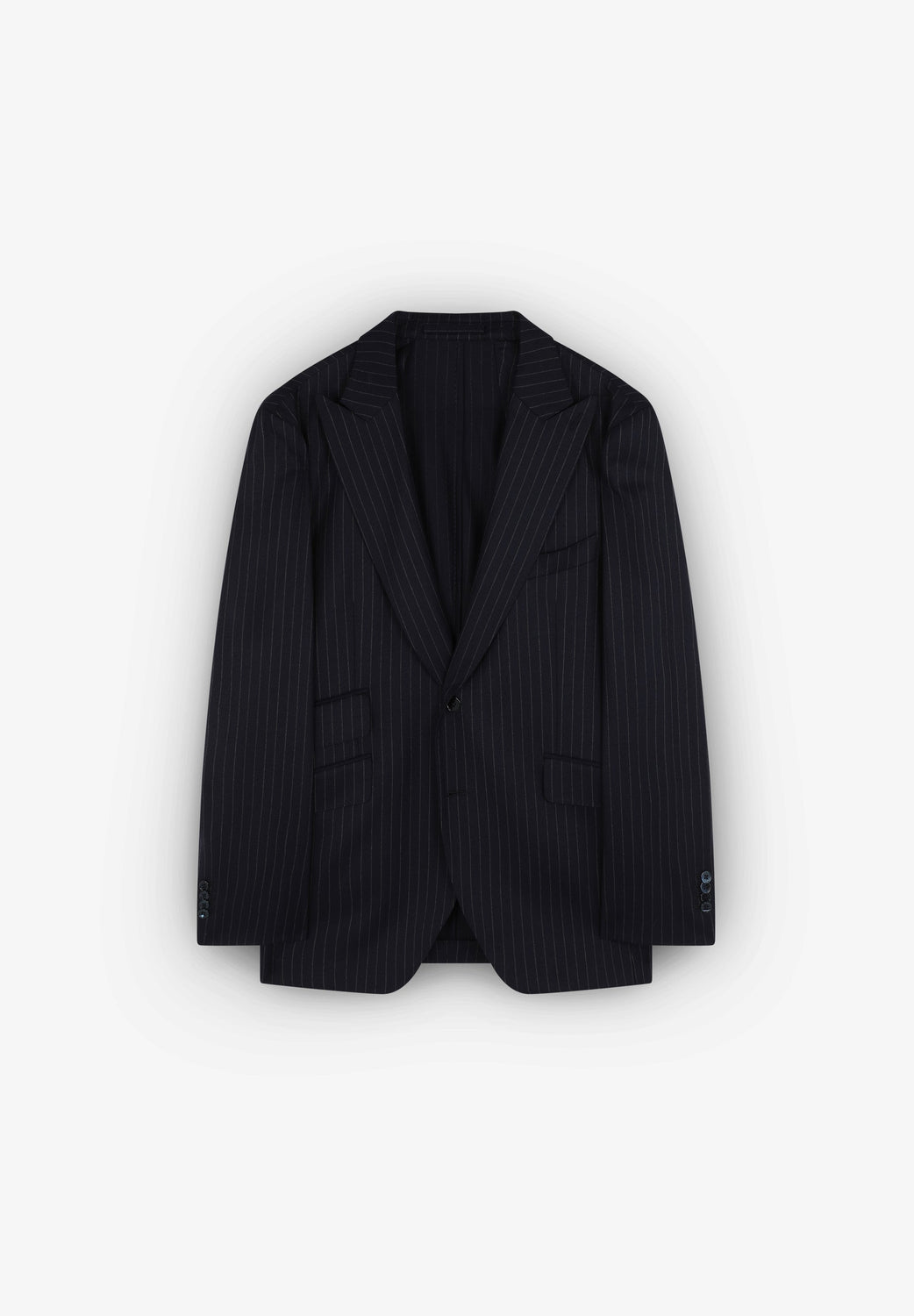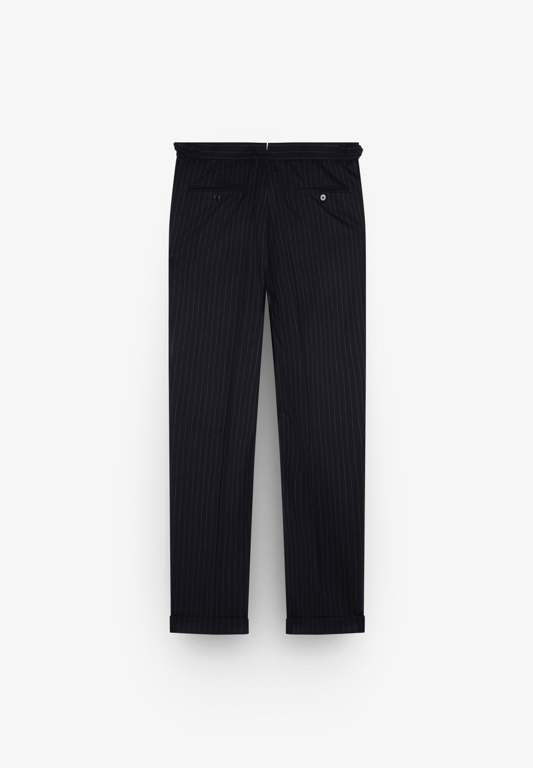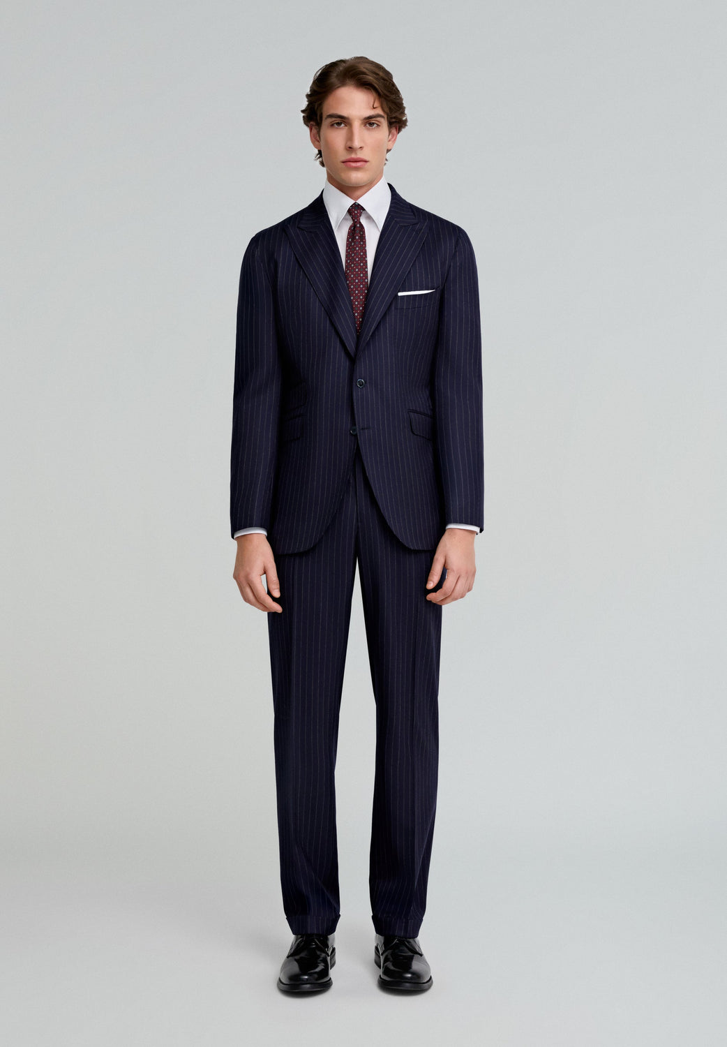 Traje confeccionado en 100% lana. Regular fit semi armada con medio forro, cuello con solapas de muesca y cierre con botones. Manga larga terminada en puño con botones practicables y uno cerrado y bolsillos con solapa. Pantalón recto con cierre de botón prolongado en cintura y cremallera. Trabillas en cintura y bajo sencillo