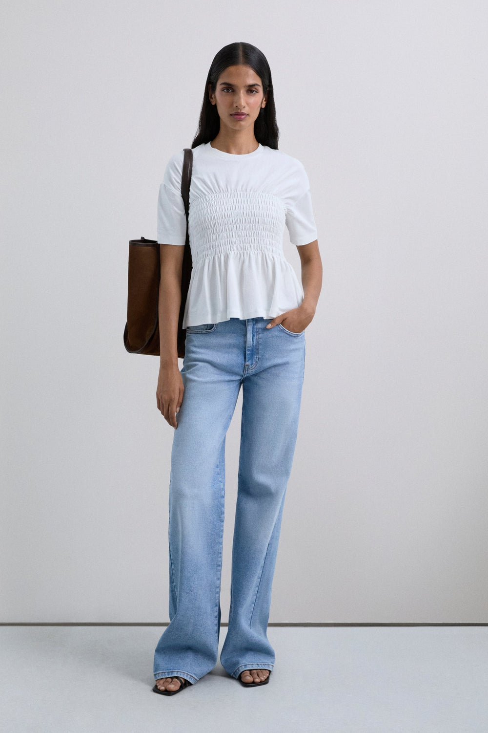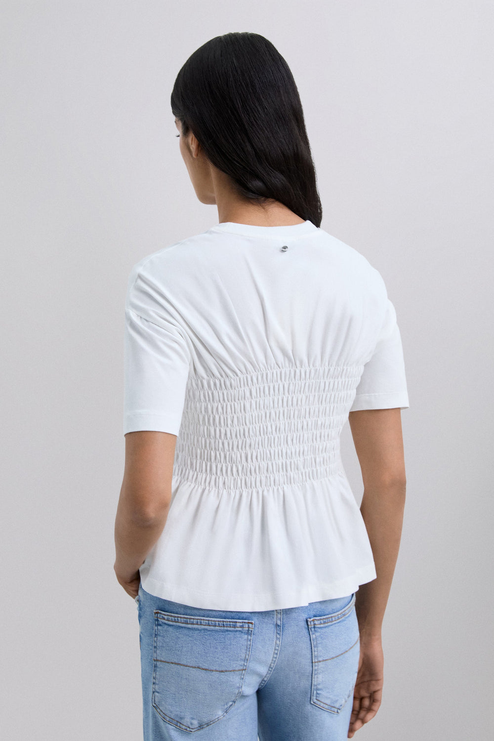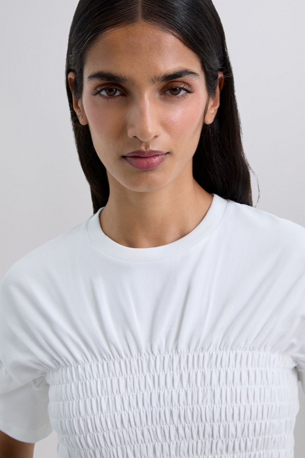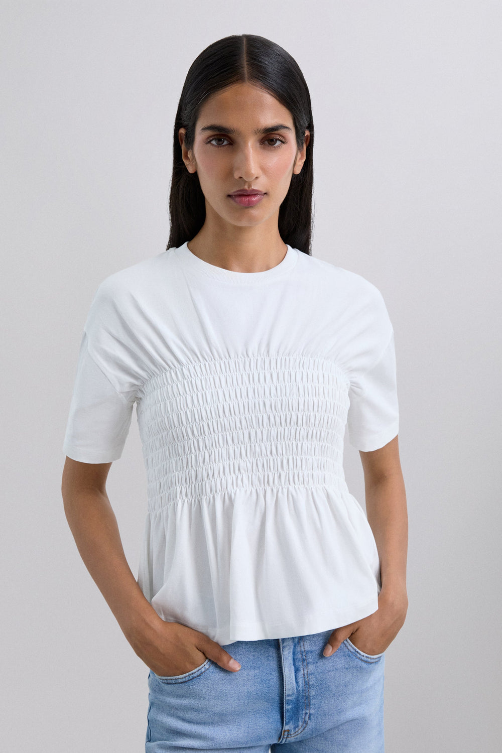 T-shirt made of slightly stretchy cotton blend fabric. Regular fit, round neck and short sleeves. Smocking detail at waist with ruffle on the hem.