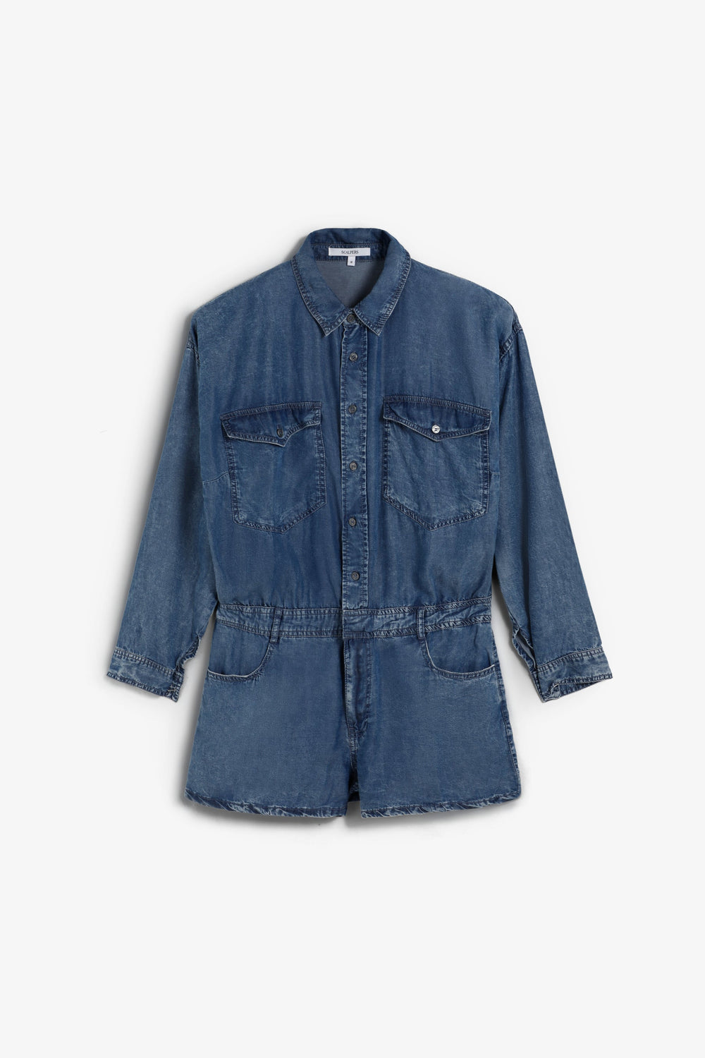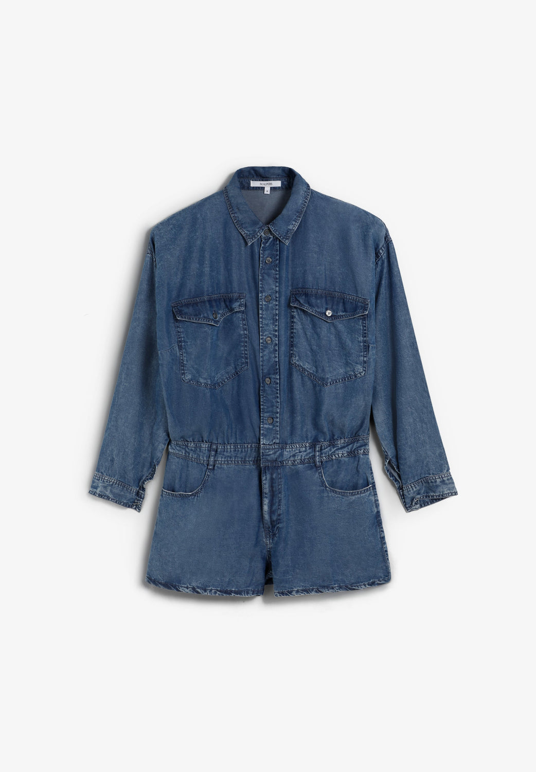Playsuit in a loose-fitting denim-effect fabric. Shirt collar. Long sleeves. Button fastening. Front and back pockets.
