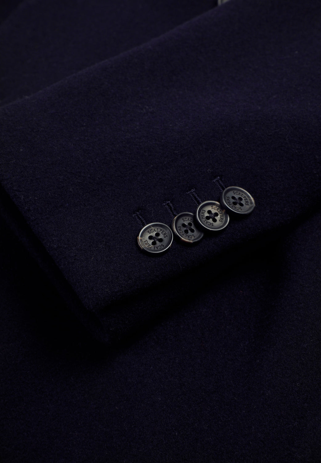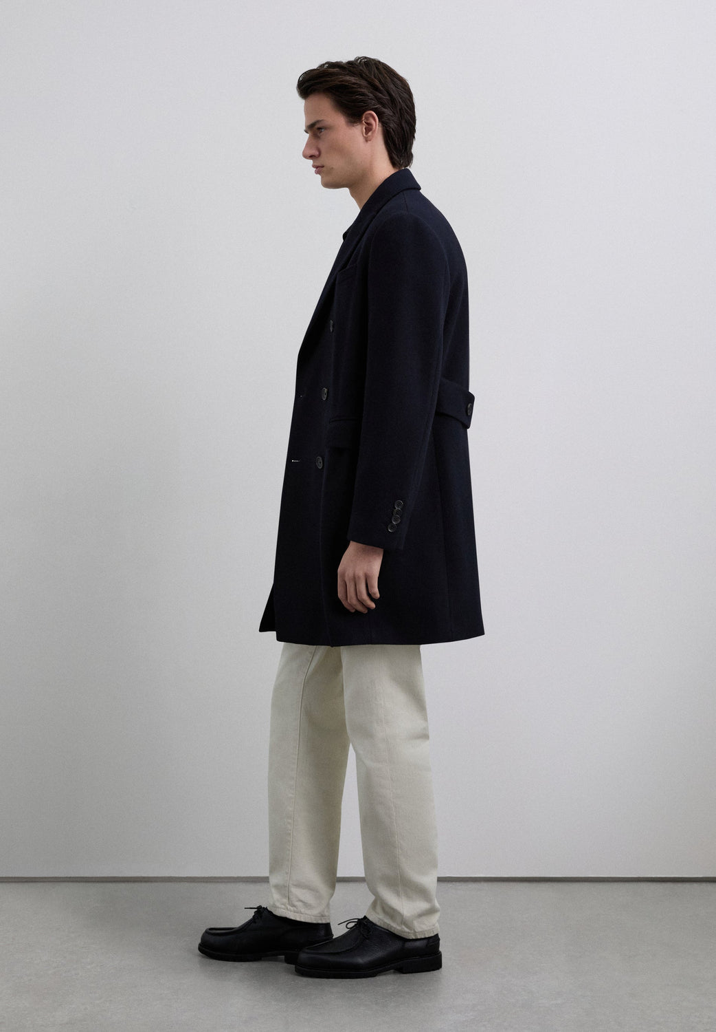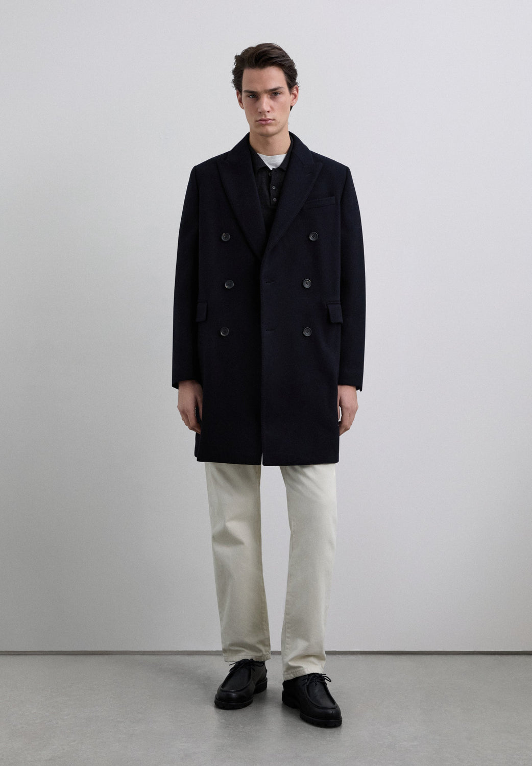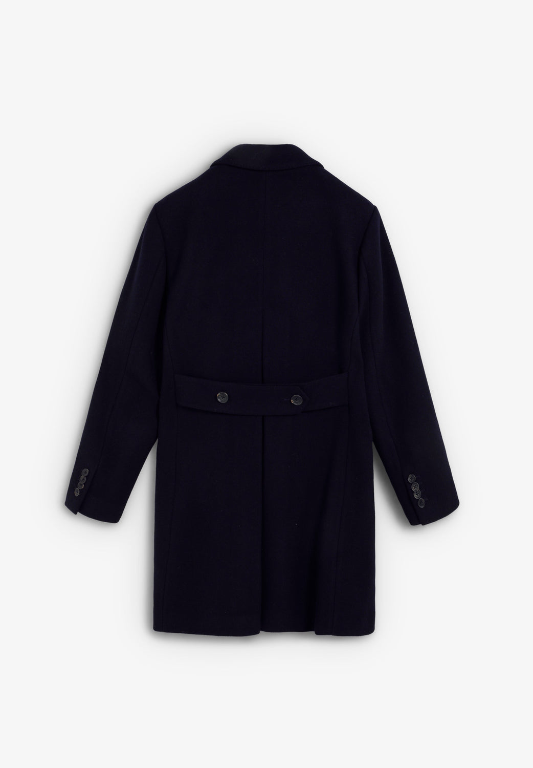 Coat made of a wool blend fabric. V-neck with peak lapels and long sleeves. Customised cuff buttons. Front buttoned flap pockets. Pleat in the centre back hem. Double-breasted button fastening.
