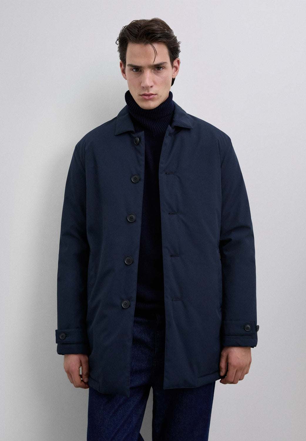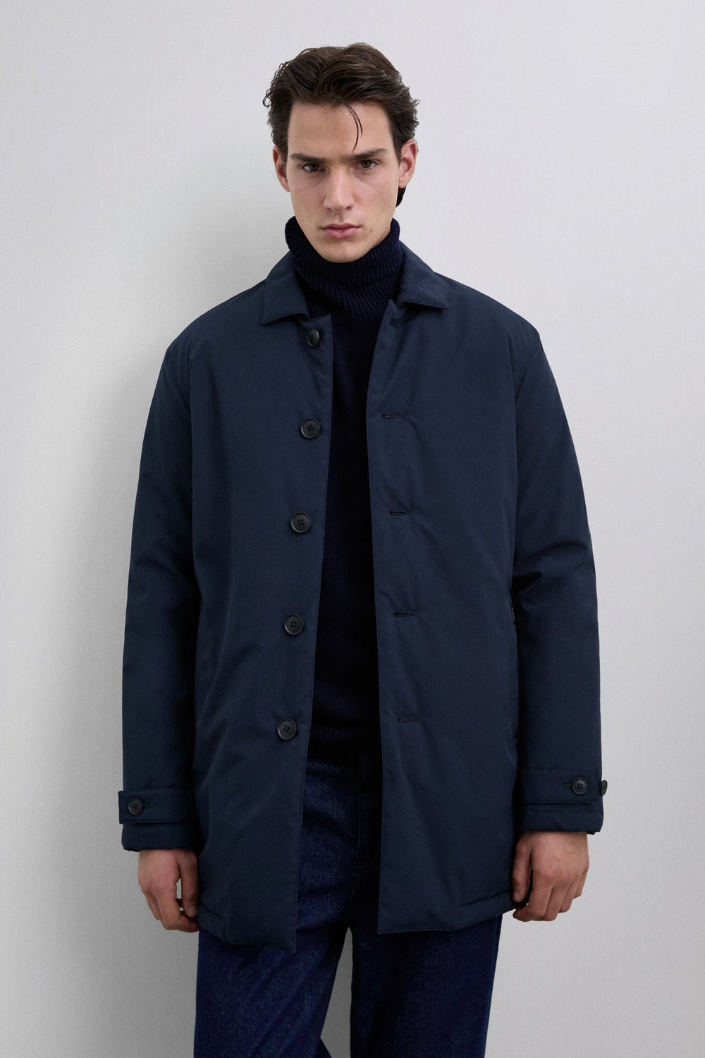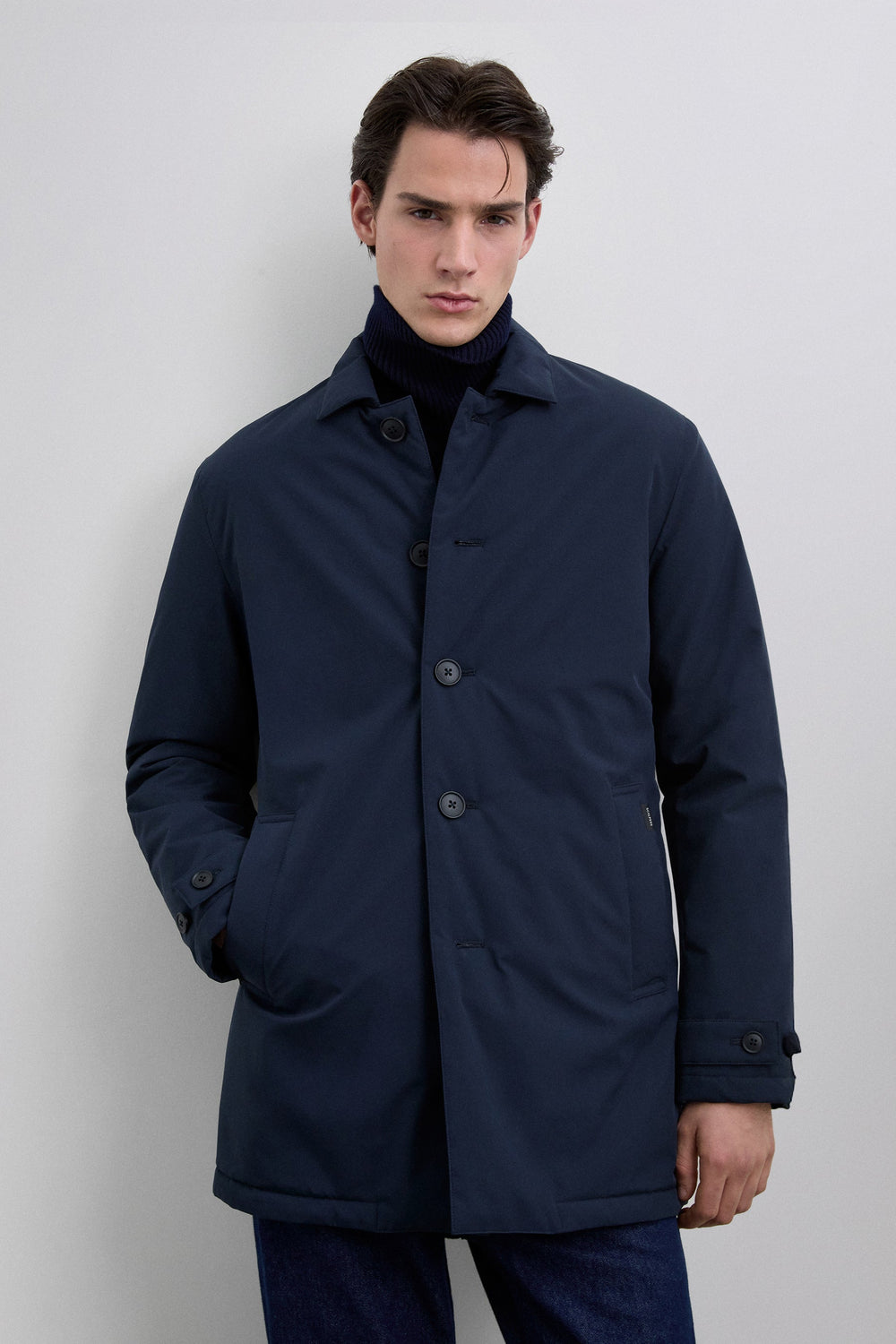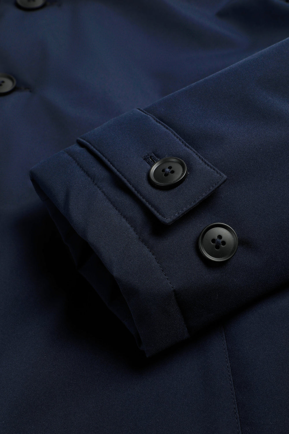 Trench coat in water-repellent and windproof fabric. Long sleeves with snap-button tabs on cuffs. Front button fastening. Side pockets. Engraved logo detail on the buttons.
