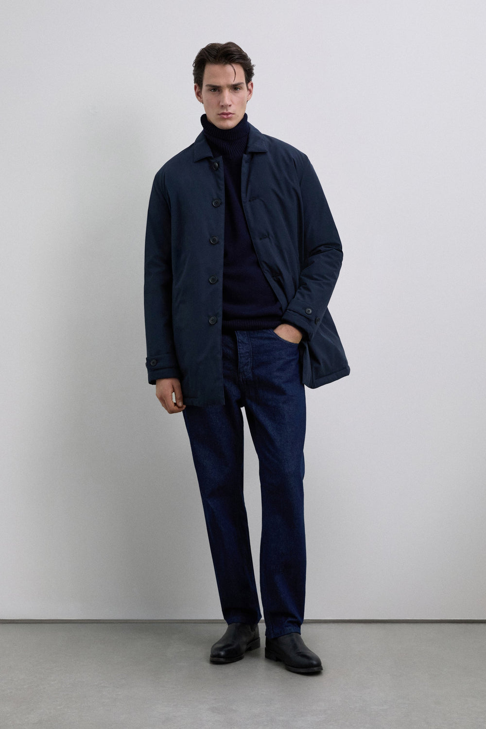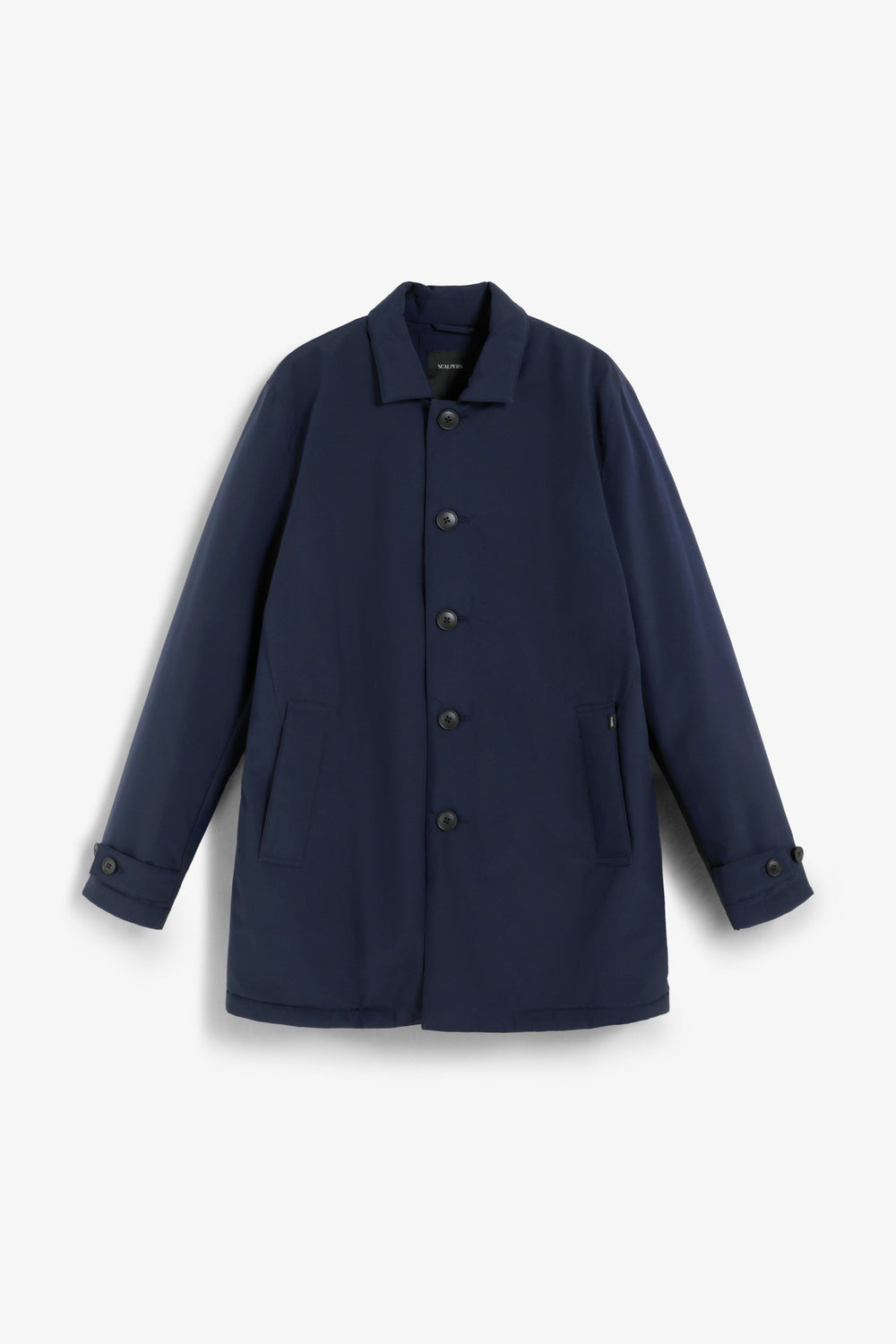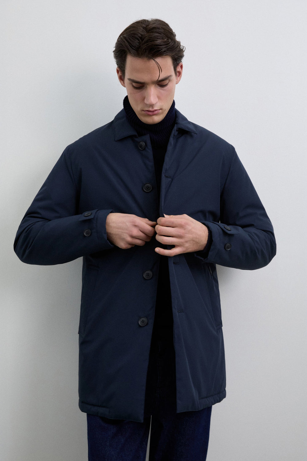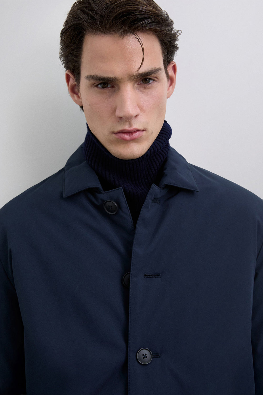 Trench coat in water-repellent and windproof fabric. Long sleeves with snap-button tabs on cuffs. Front button fastening. Side pockets. Engraved logo detail on the buttons.
