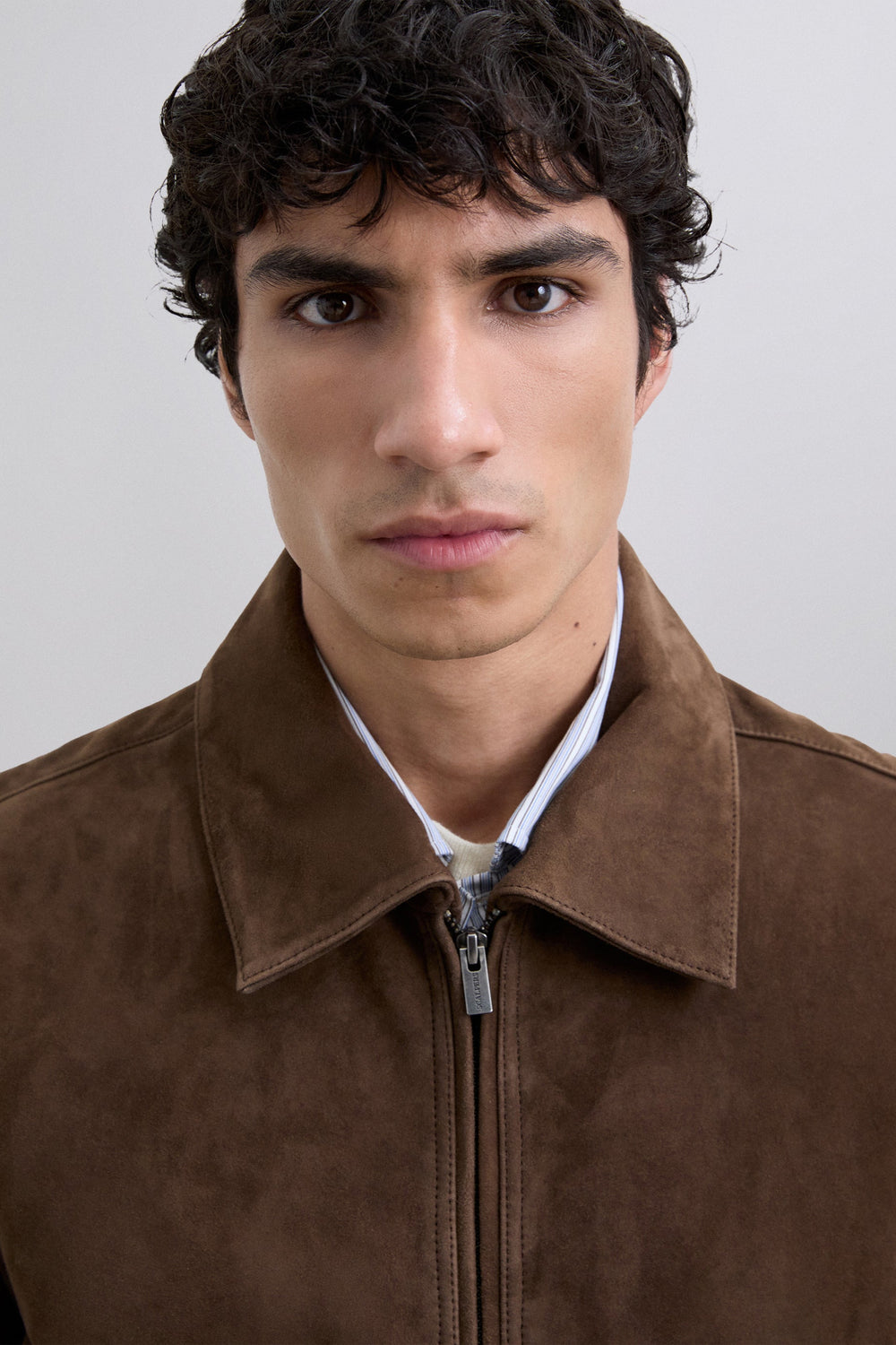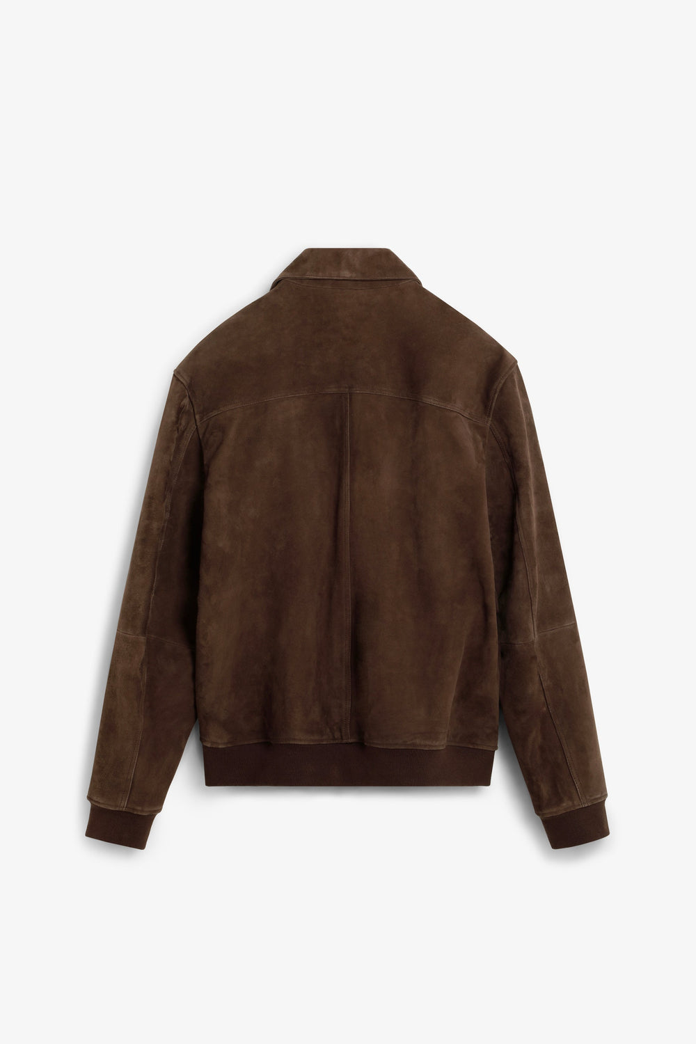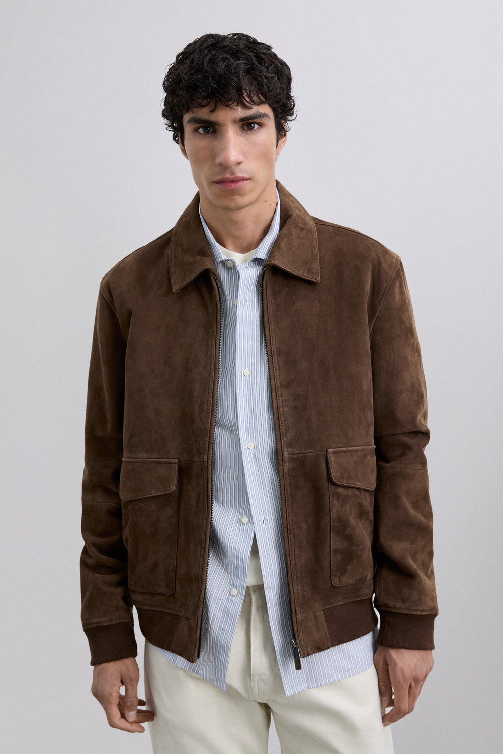 Suede jacket with shirt collar. Double front zip fastening. Ribbed cuffs and hem. Two front pockets with flap fastening.