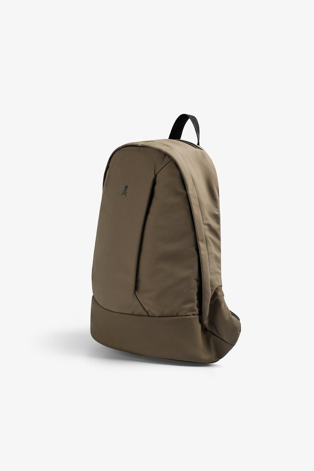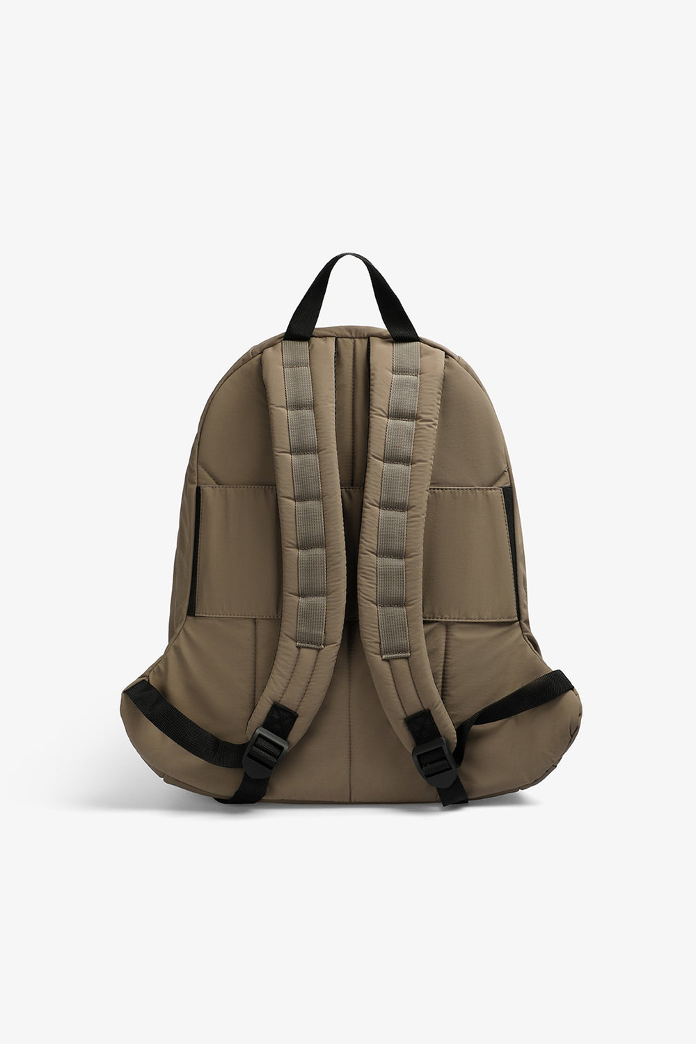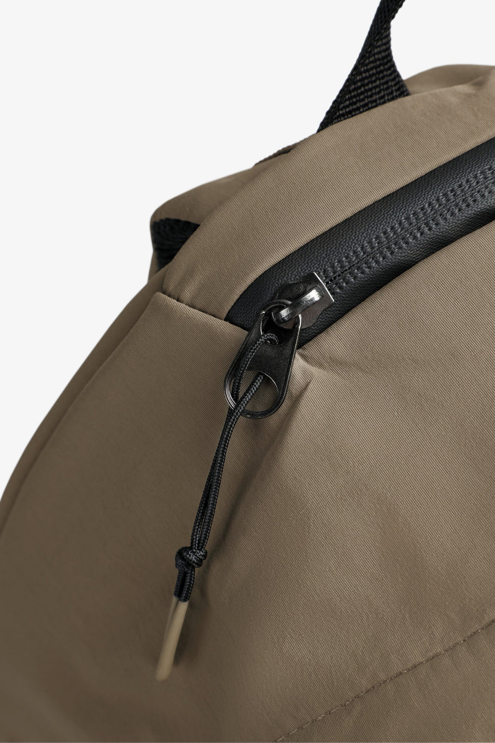 Backpack made of a technical fabric. Top handle. Additional pockets on top and front. Matching logo on the front. Inner compartment for laptop.
