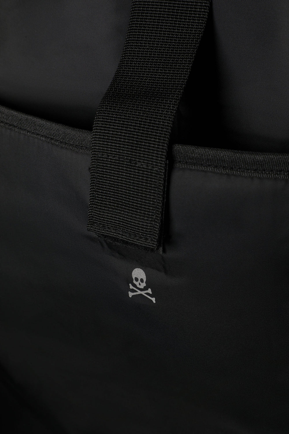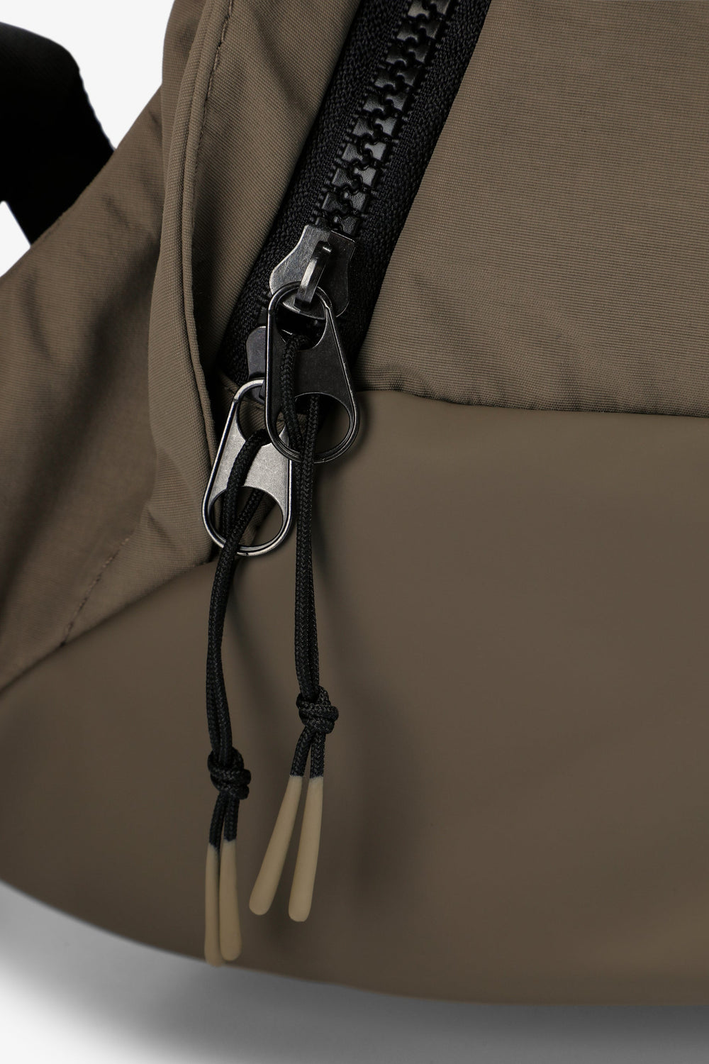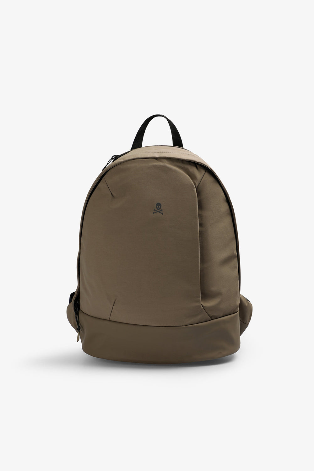 Backpack made of a technical fabric. Top handle. Additional pockets on top and front. Matching logo on the front. Inner compartment for laptop.
