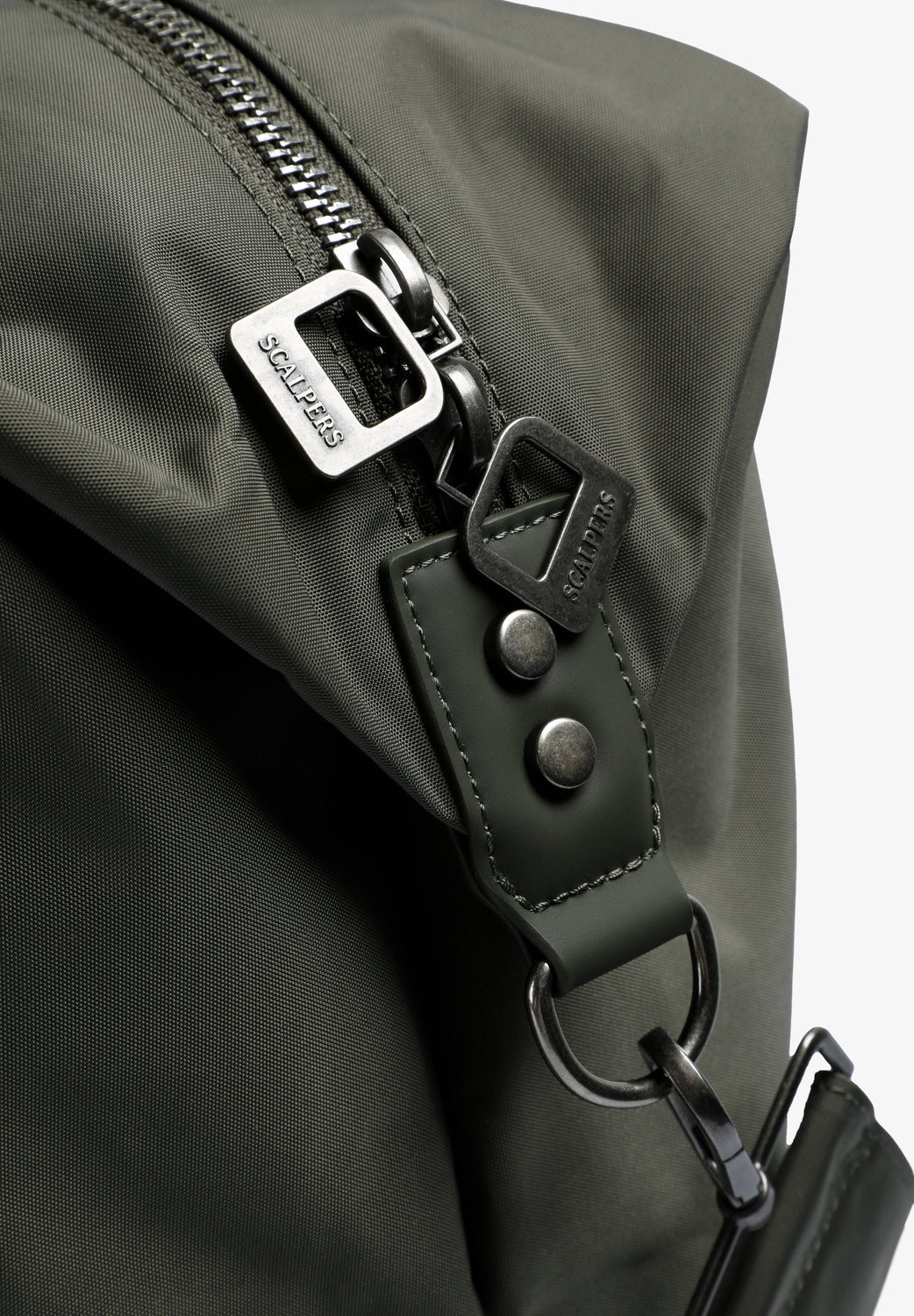 Nylon travel bag, PU base and handle, rubberised patch with matching lettering. Customised appliqués. Top handle. Shoulder strap.
