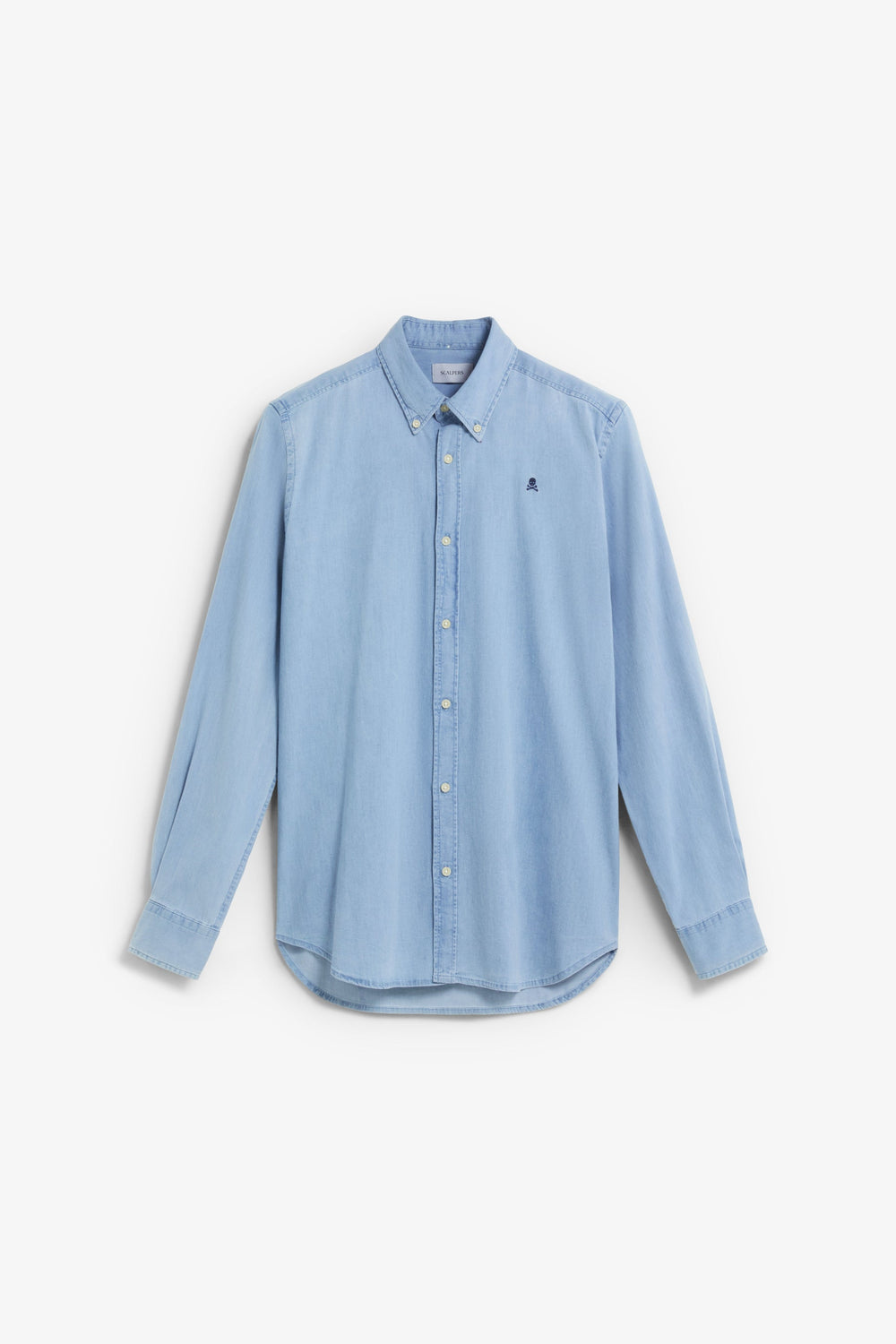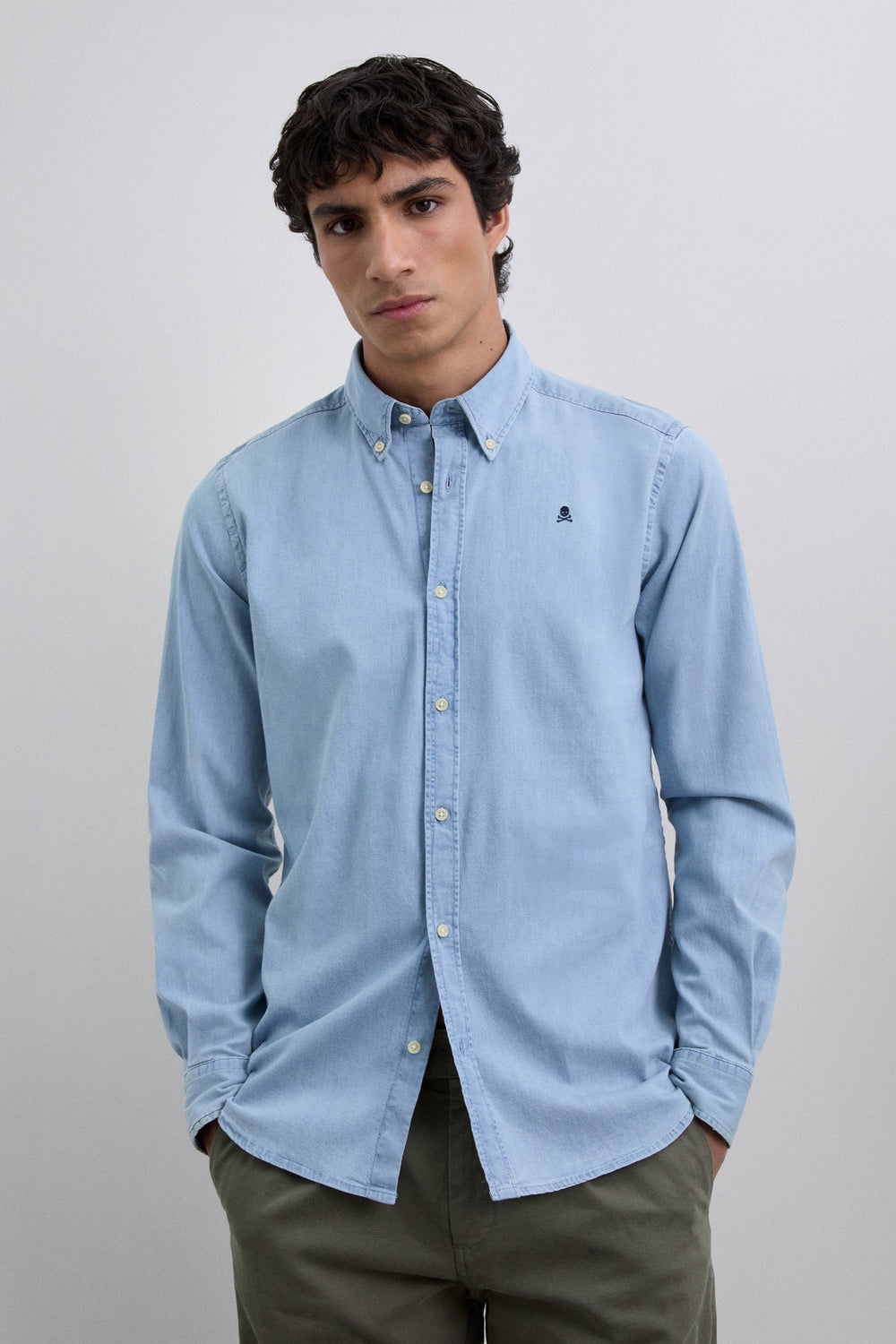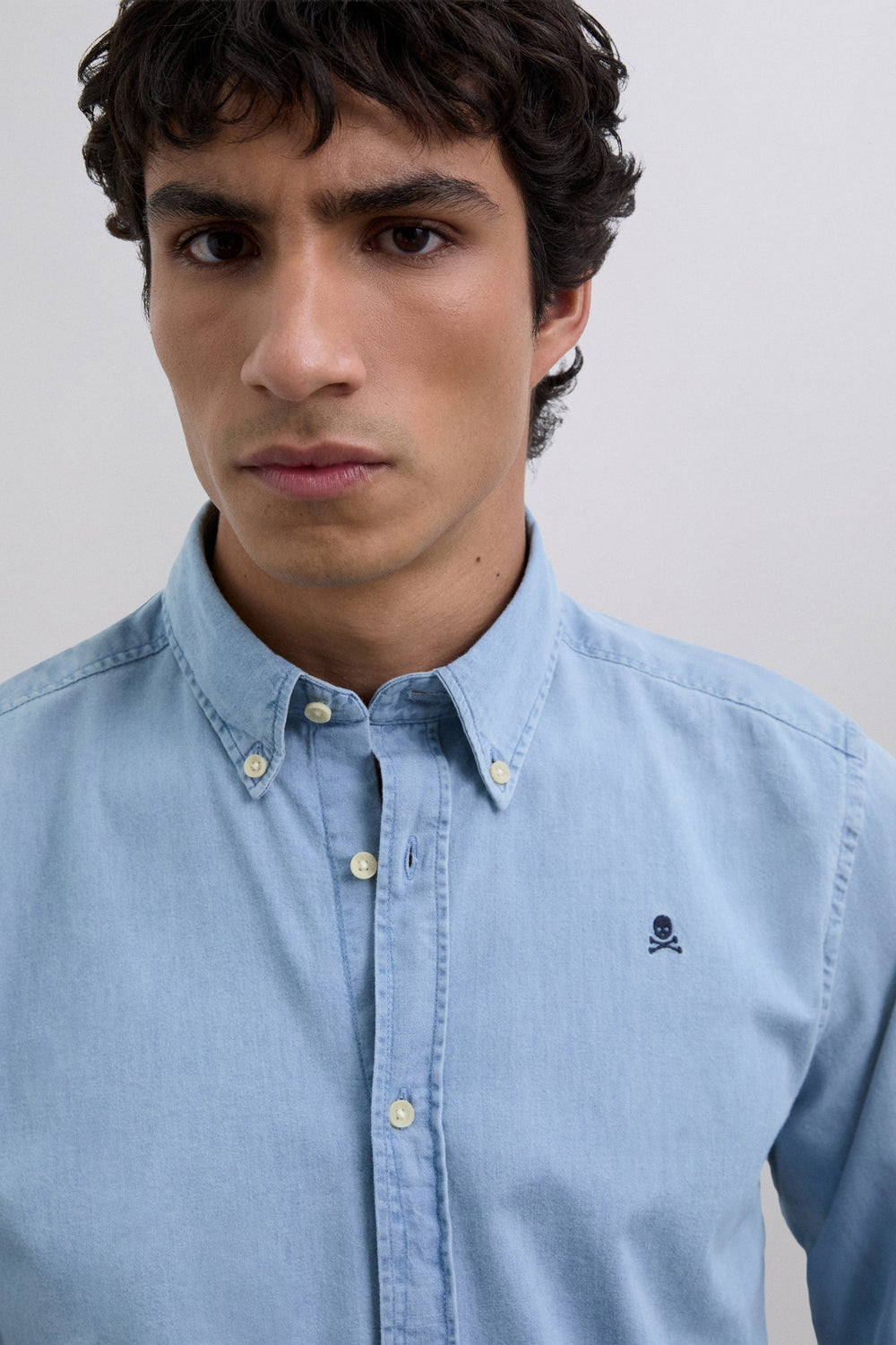 Denim shirt made of a cotton blend. Regular fit, collar with buttons and button fastening. Long sleeves with buttoned cuffs and contrast embroidered skull on the chest.