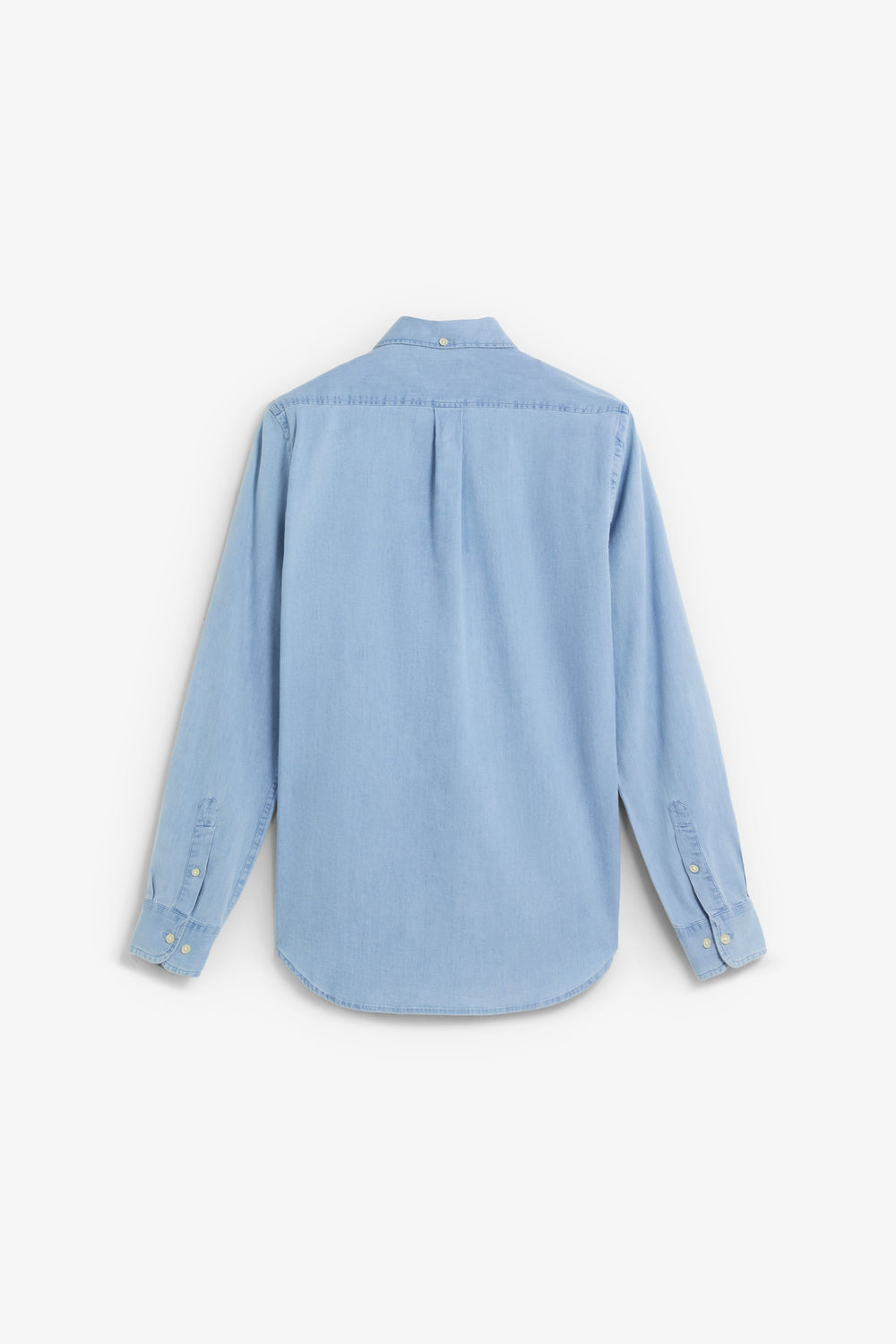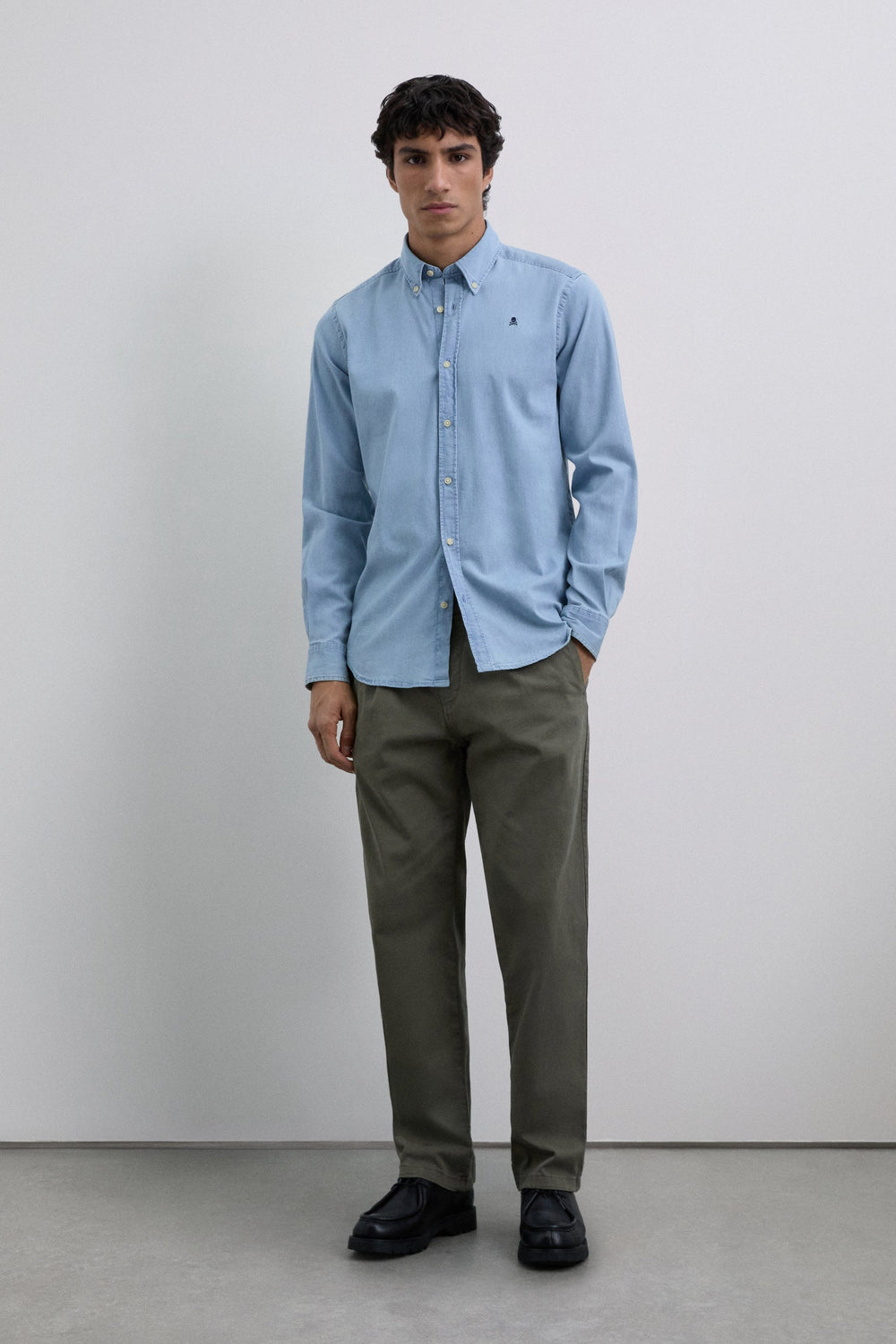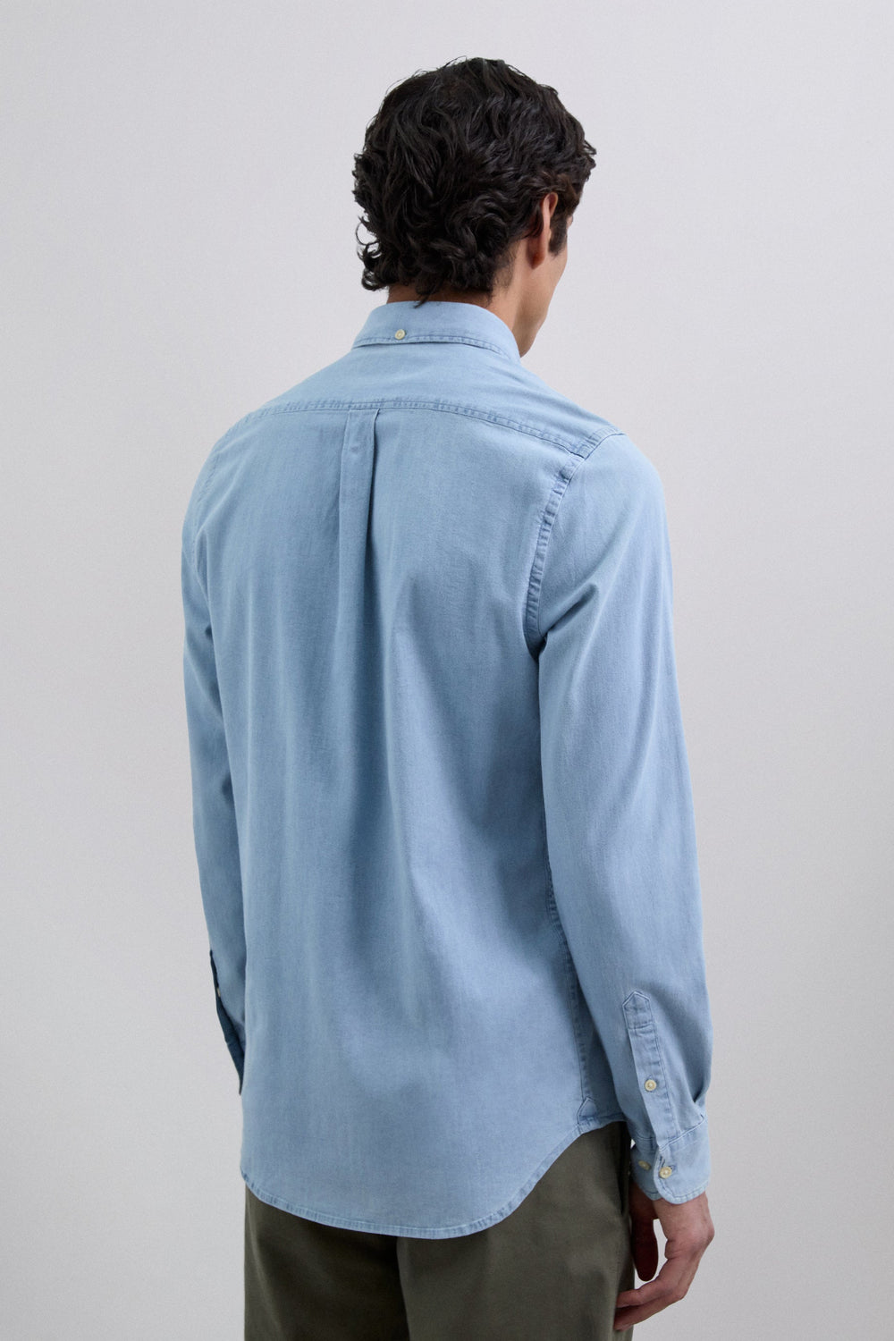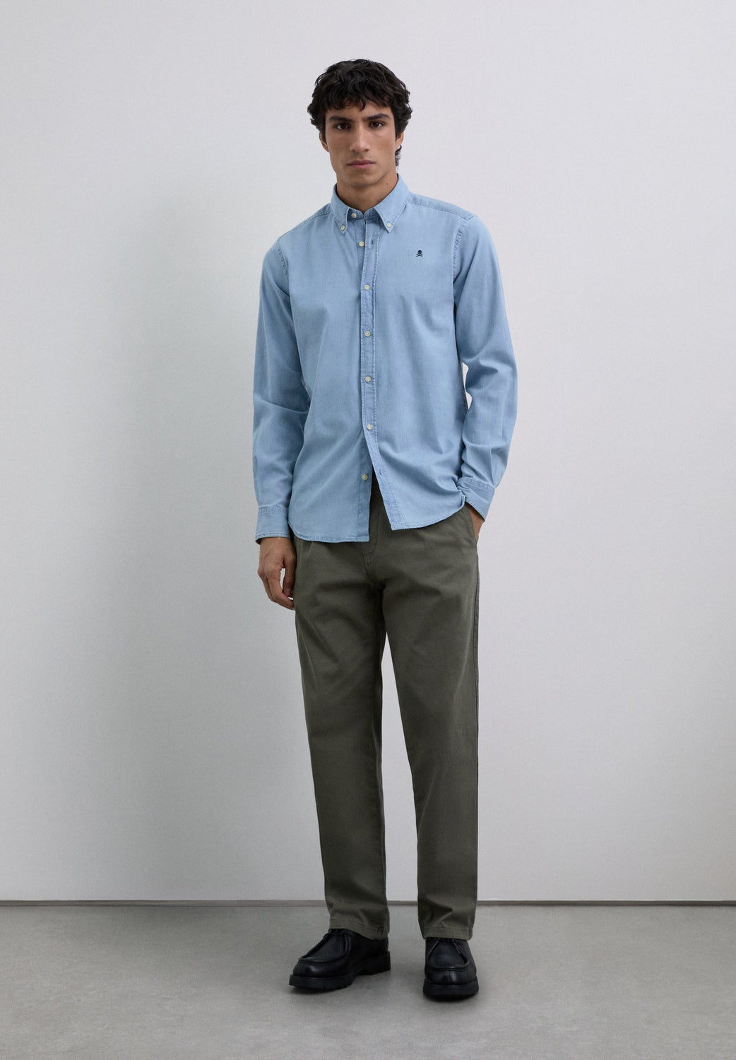 Denim shirt made of a cotton blend. Regular fit, collar with buttons and button fastening. Long sleeves with buttoned cuffs and contrast embroidered skull on the chest.