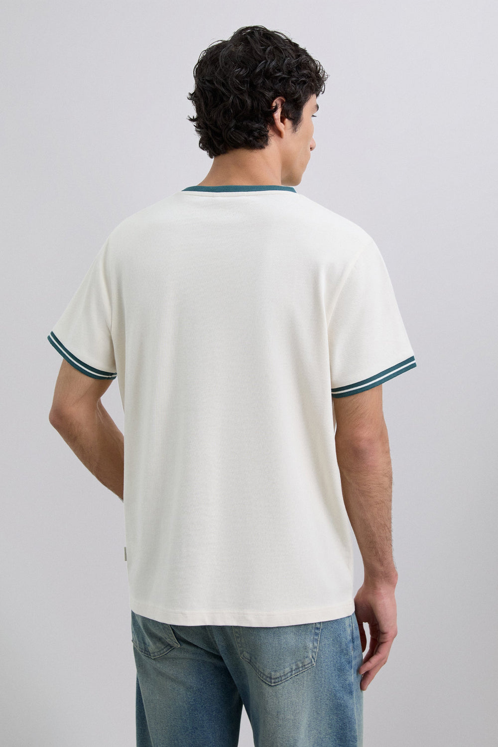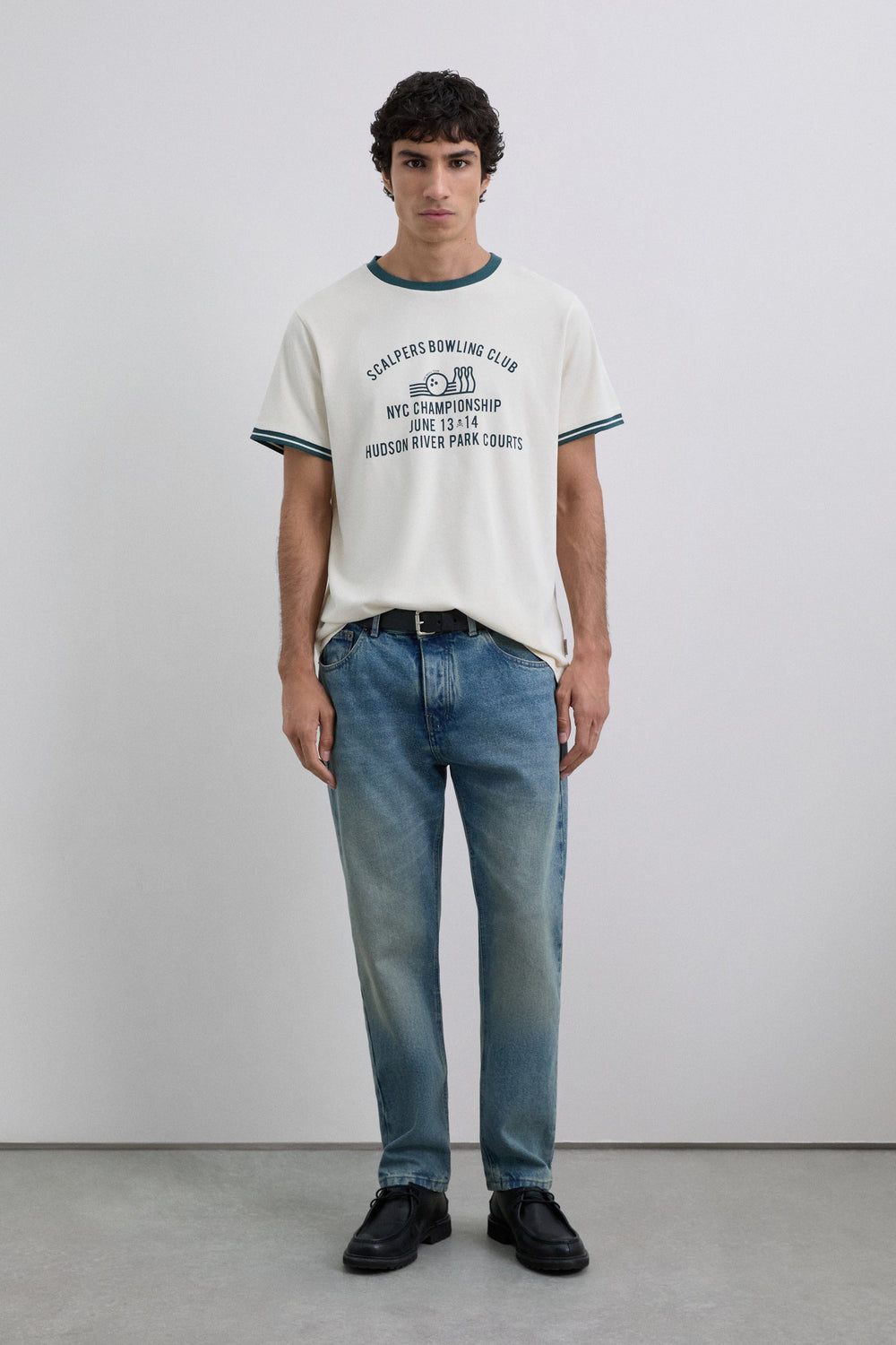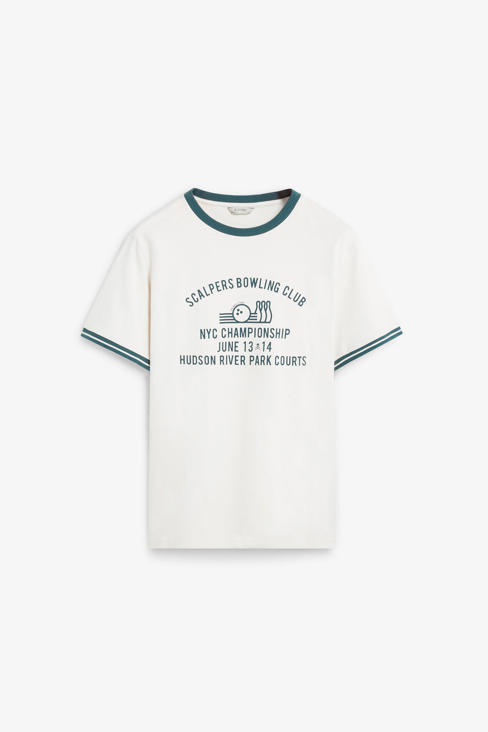 T-shirt made of 100% BCI cotton. Short sleeve. Front print. Regular fit. Contrast ribbed trim on collar and cuffs.