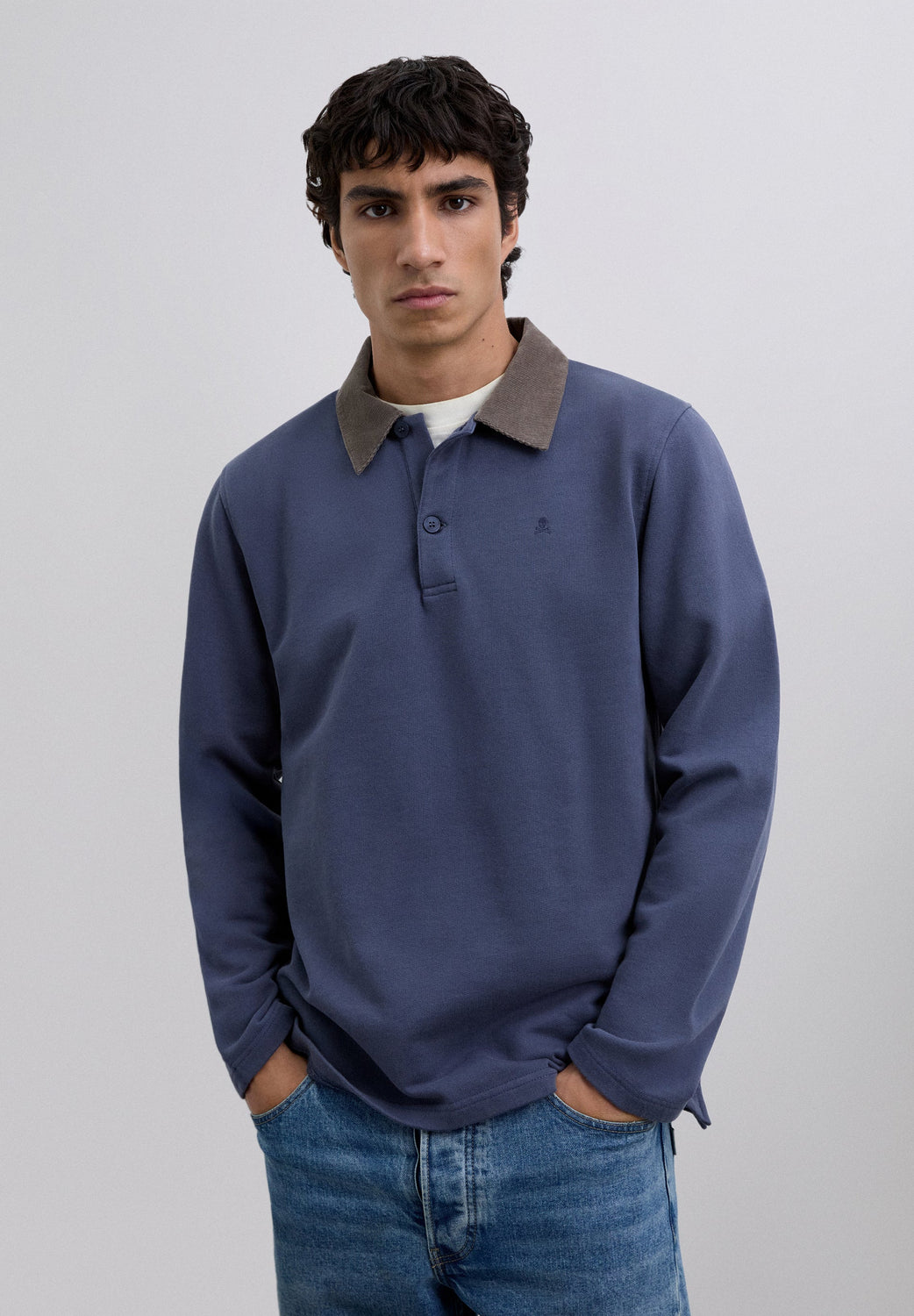 Polo shirt made of 100% BCI cotton. Contrast corduroy collar with button fastening. Long sleeves. Matching embroidered logo on the chest.