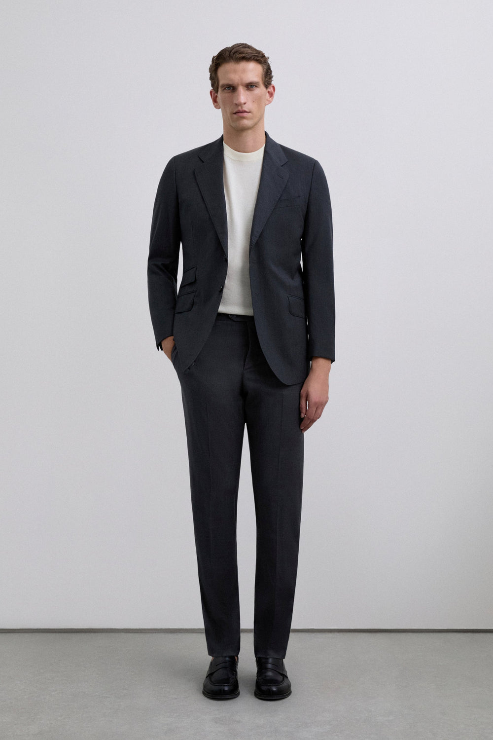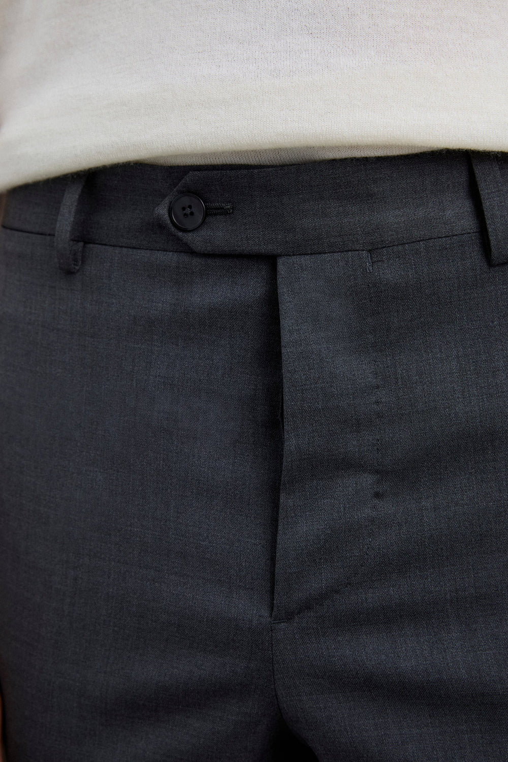 Darted smart trousers made of a slightly stretchy wool blend. Regular fit with concealed zip and button fastening on extended waistband with belt loops. Front slanted and back pockets with button.