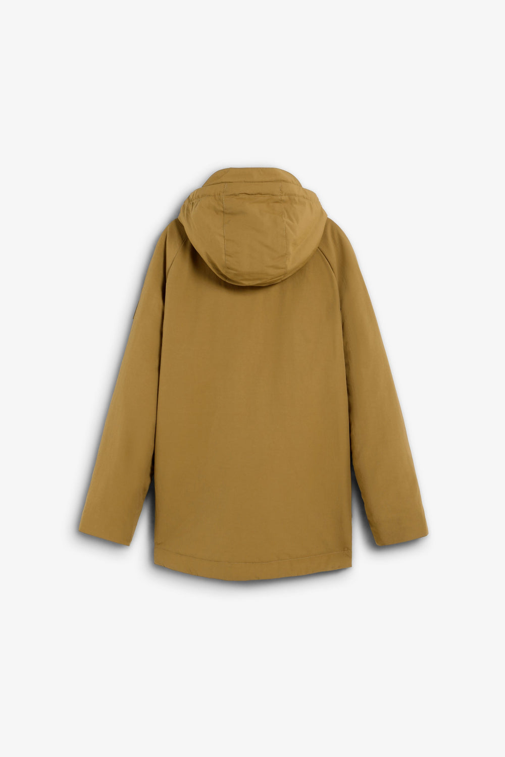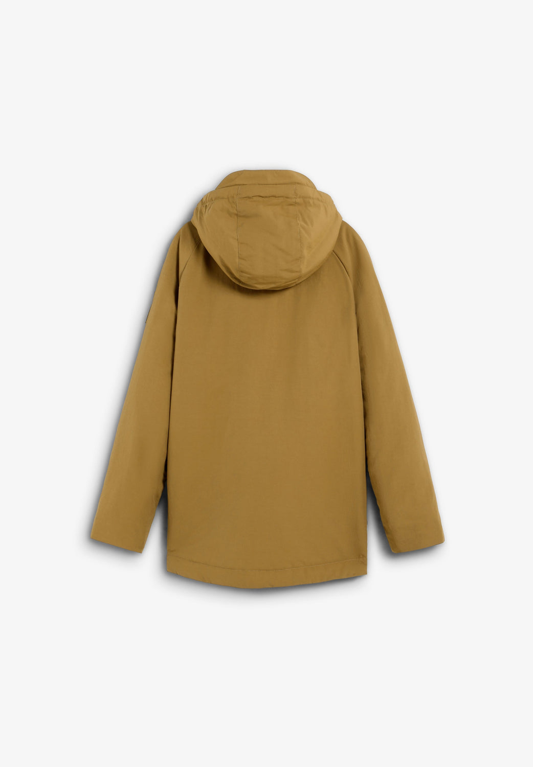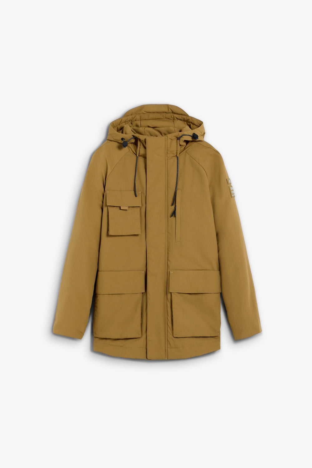 Long sleeve jacket with adjustable drawstring hood. Four front pockets: two on the chest and two lower flap pockets. Front button and zip fastening. Contrast rubber logo patch detail and skull on the sleeve.