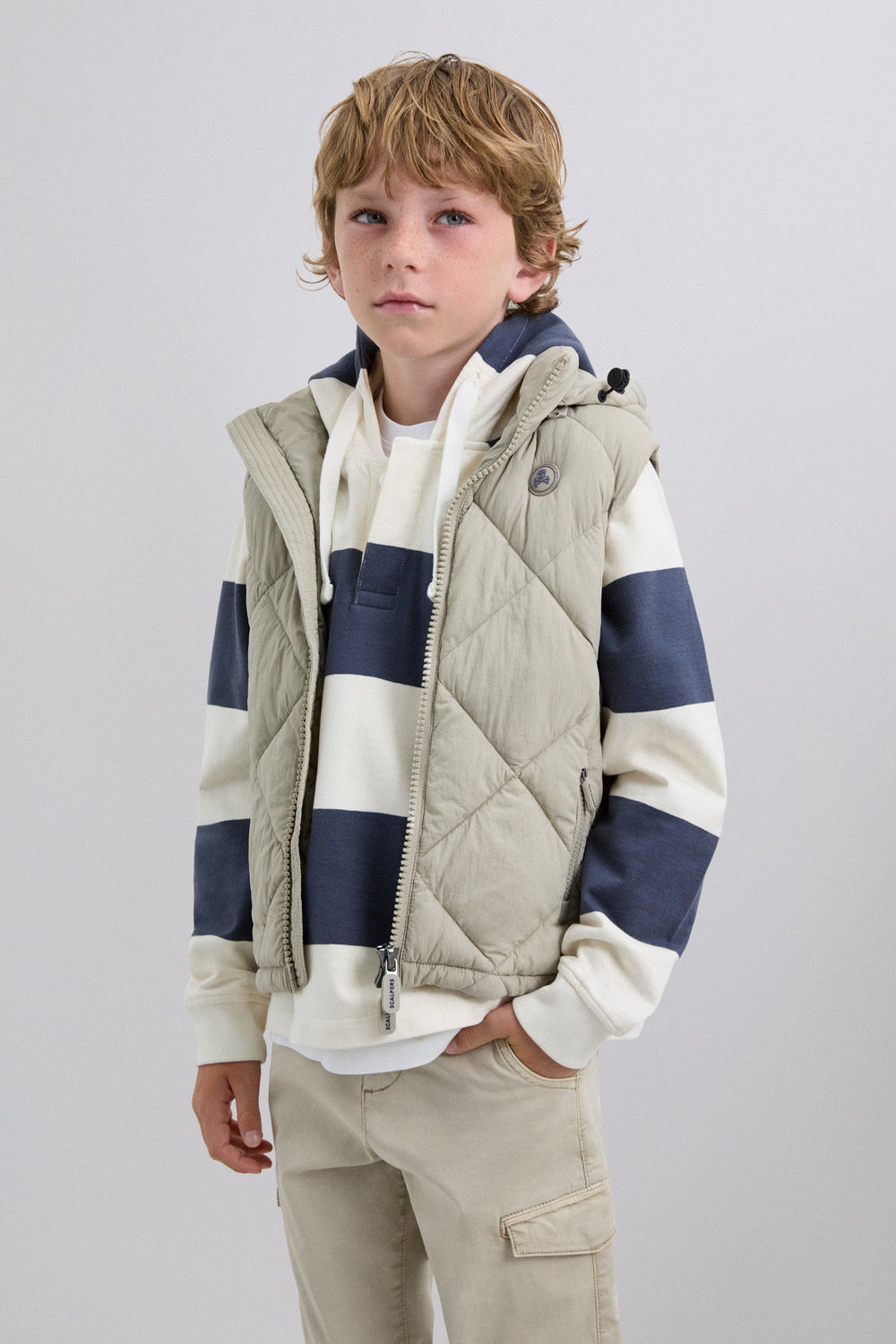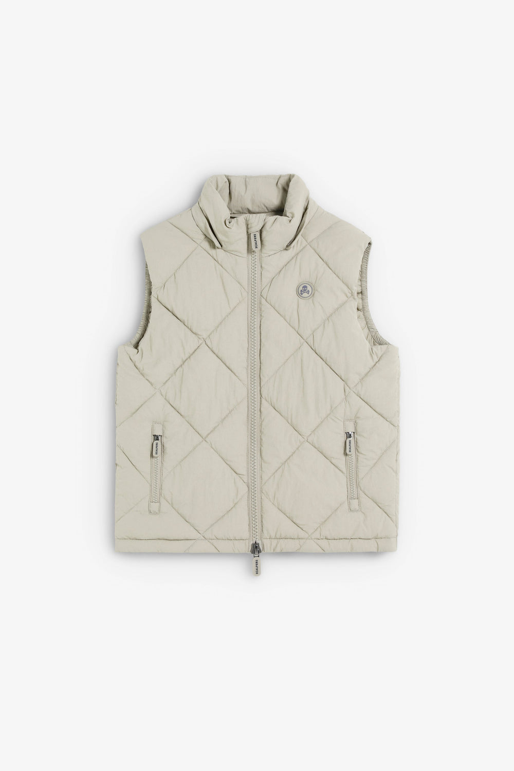 Heavy-duty padded waistcoat with adjustable hood. Double slider zip fastening. Rubberised skull detail on chest. Zip pockets and an inner pocket