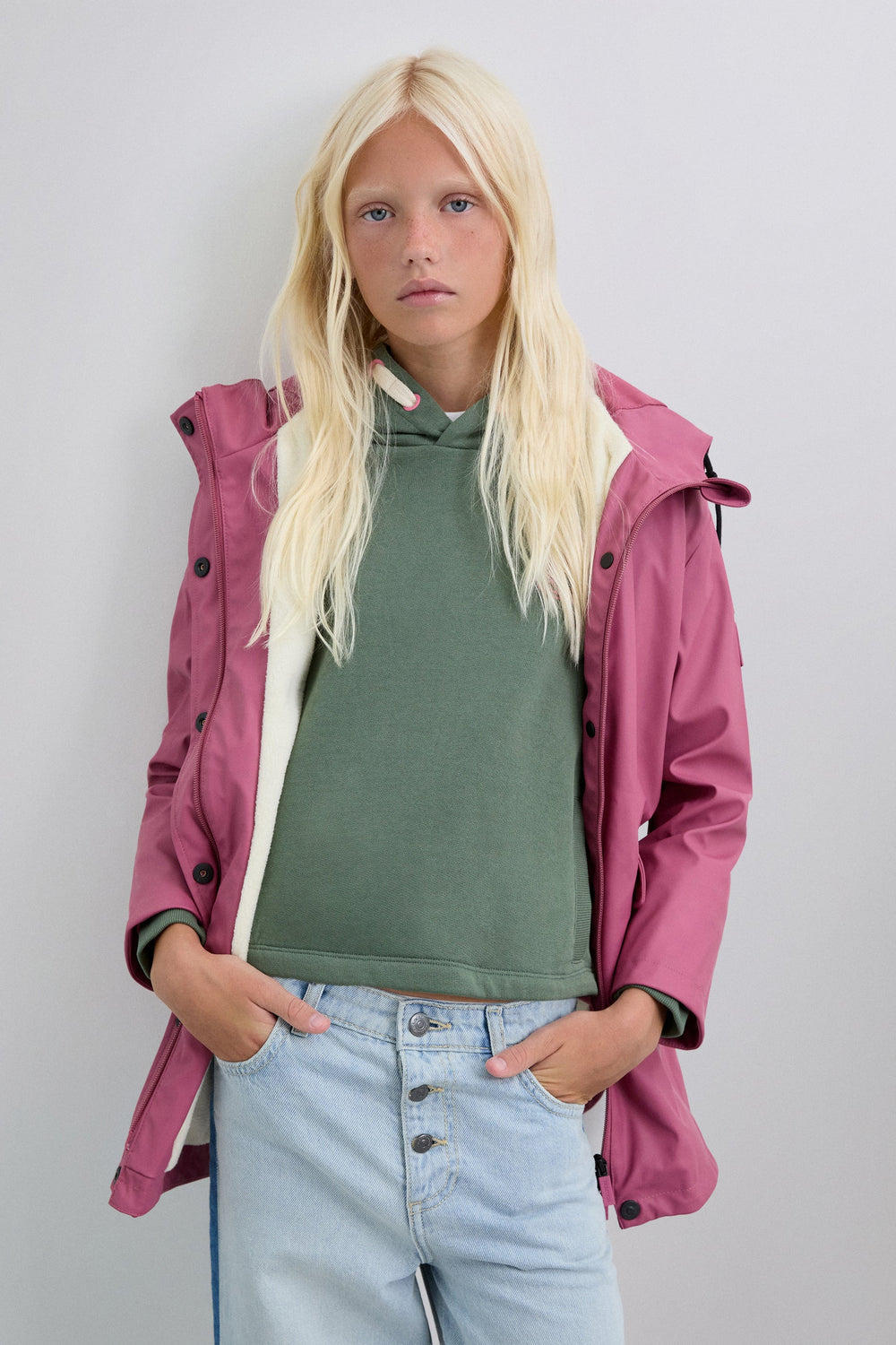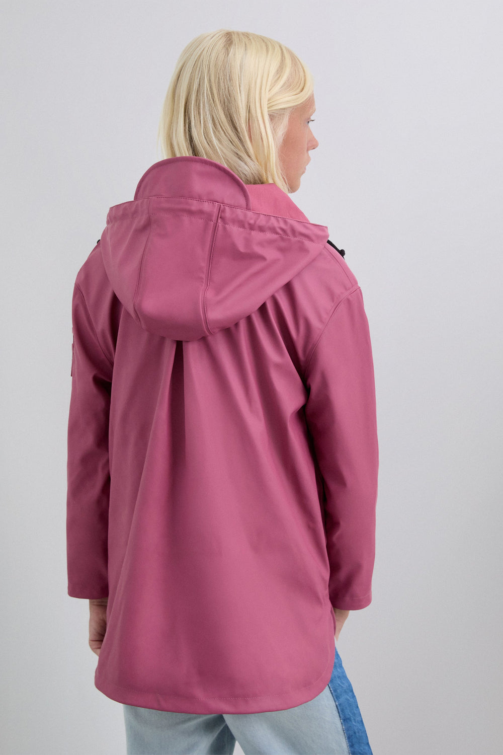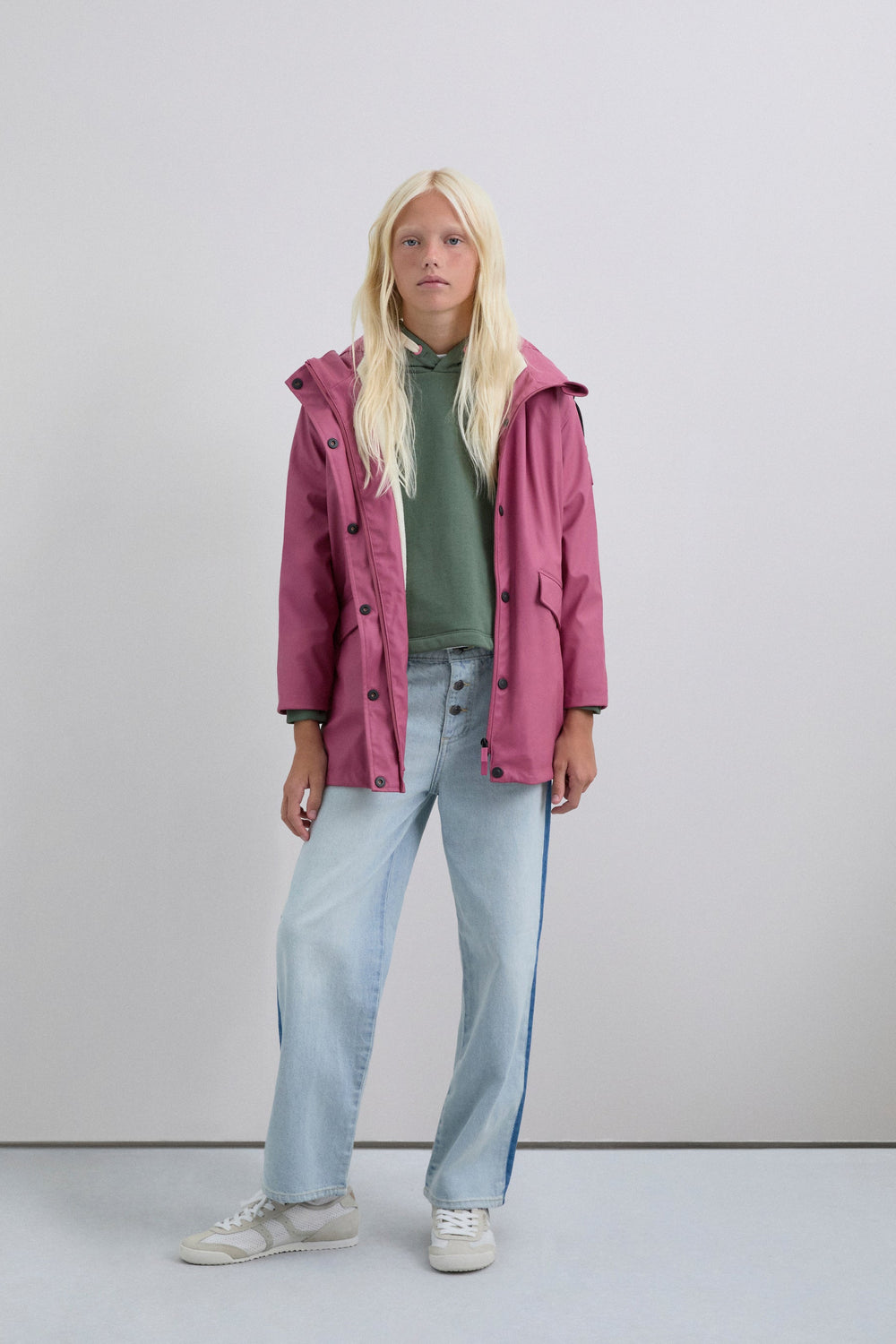 Waterproof jacket. Long sleeves. Adjustable drawstring hood. Two front pockets. Rubberised skull and logo patch detail on sleeve. Button and zip fastening.