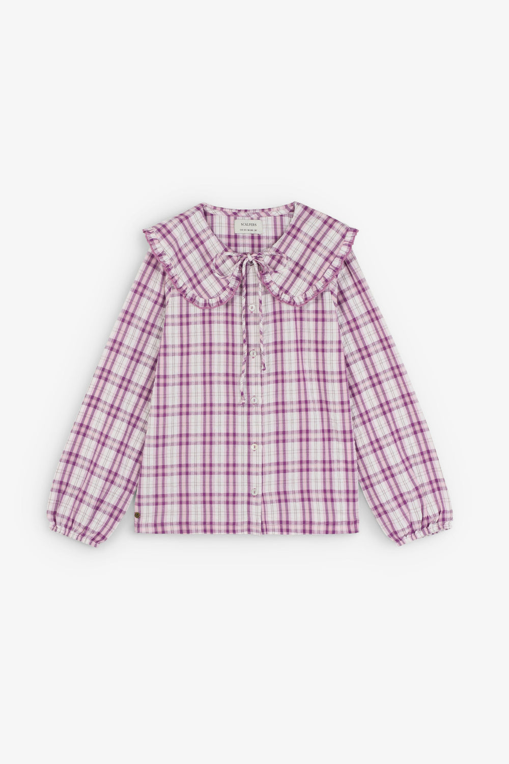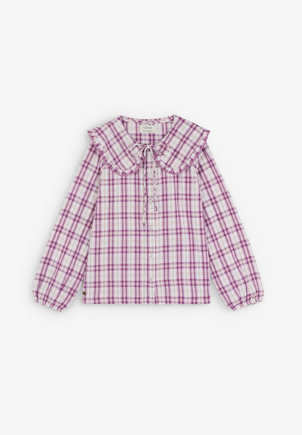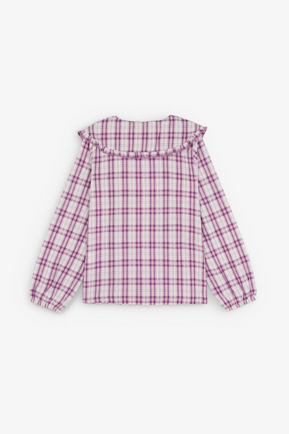 Shirt made of 100% BCI cotton. Ruffle collar with tie detail. Front button fastening. Check print.