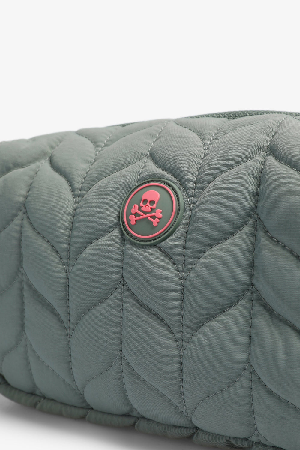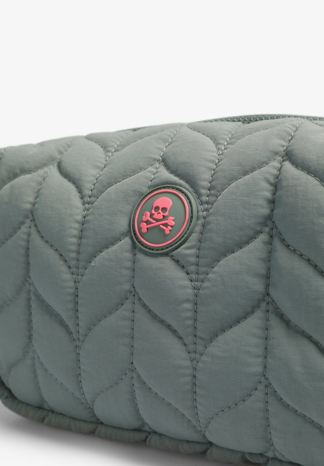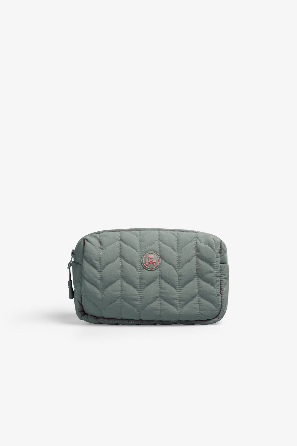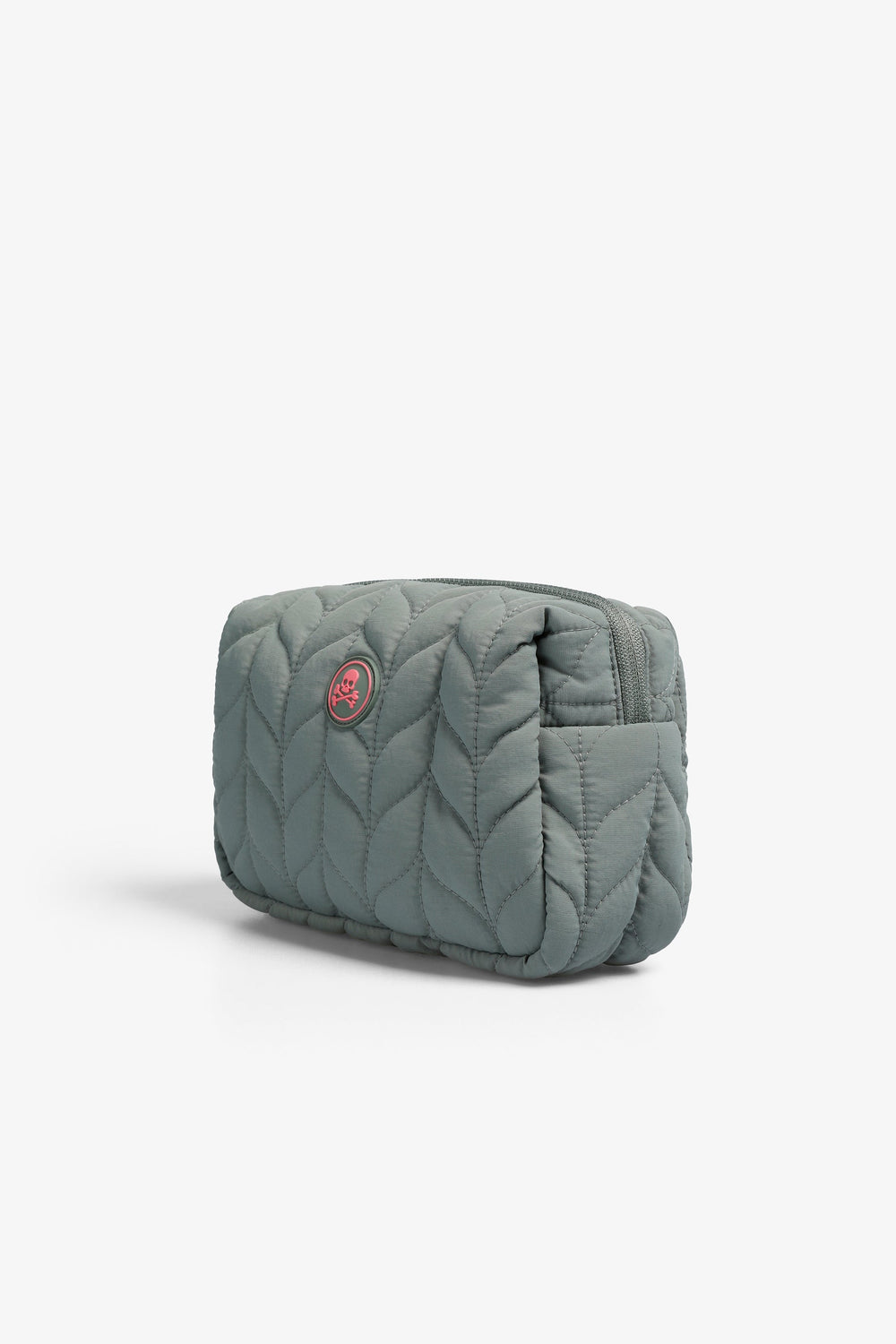 Synthetic toiletry bag. Front rubberised skull patch detail. Zip fastening.