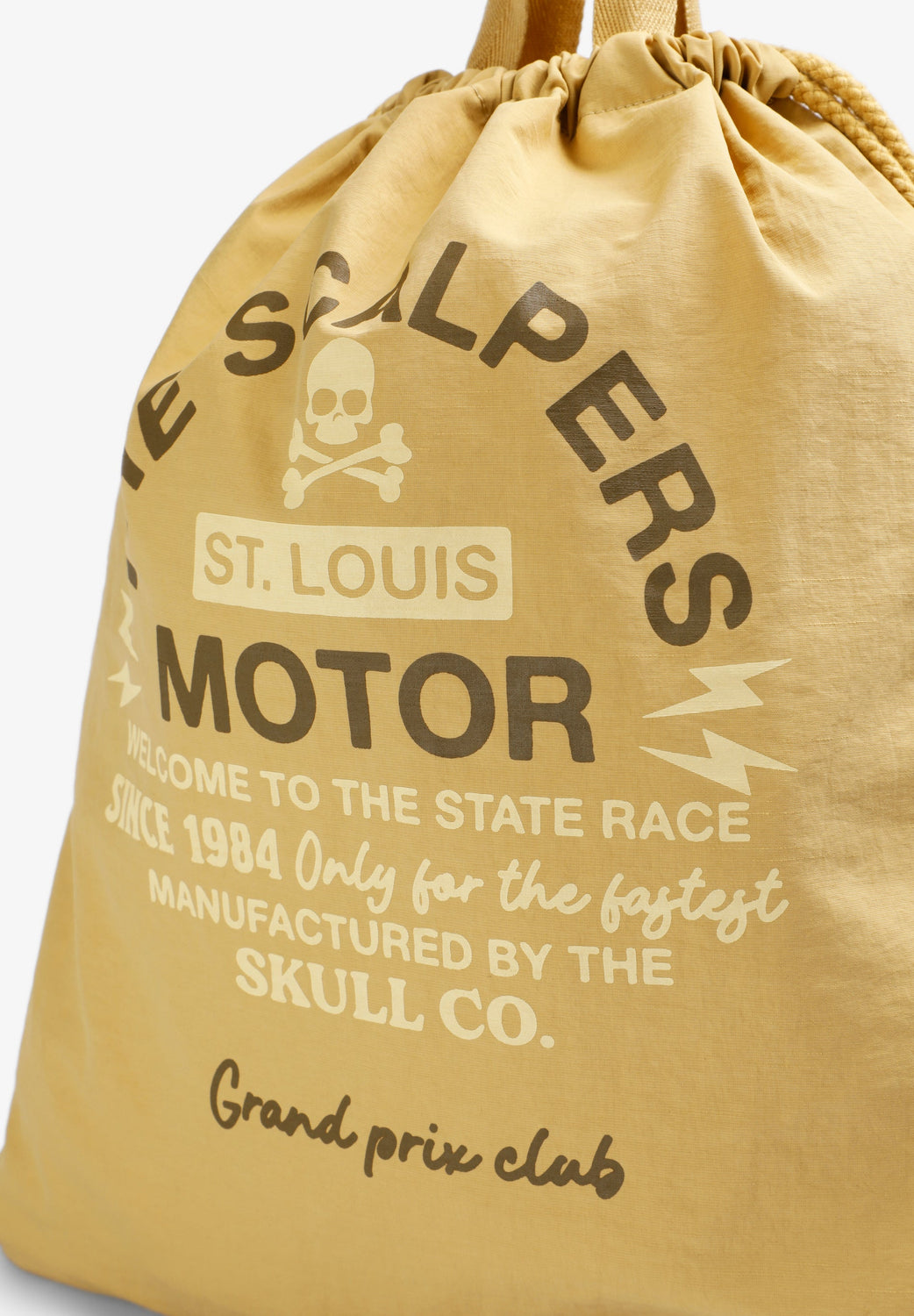 Lightweight synthetic bag. Handle. Double handle on back. Front logo print.