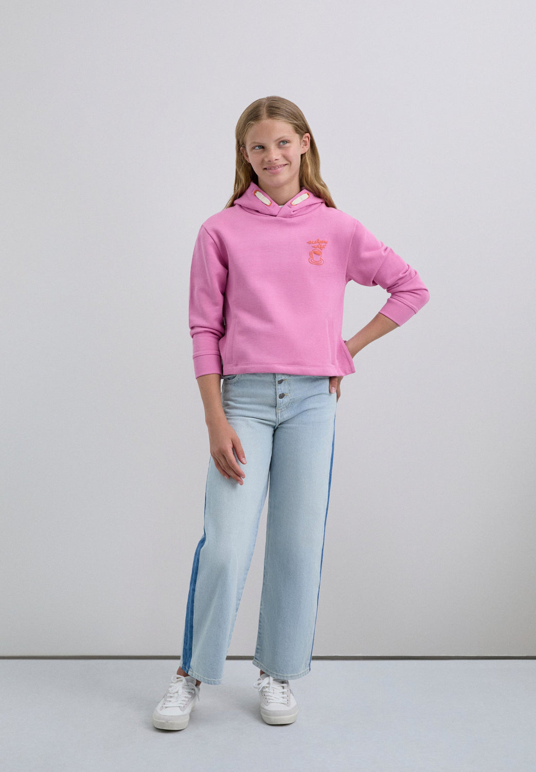 Sweatshirt with adjustable hood made of 100% BCI cotton. Long sleeves with cuffs and front pouch pockets. Print detail on the chest and back.