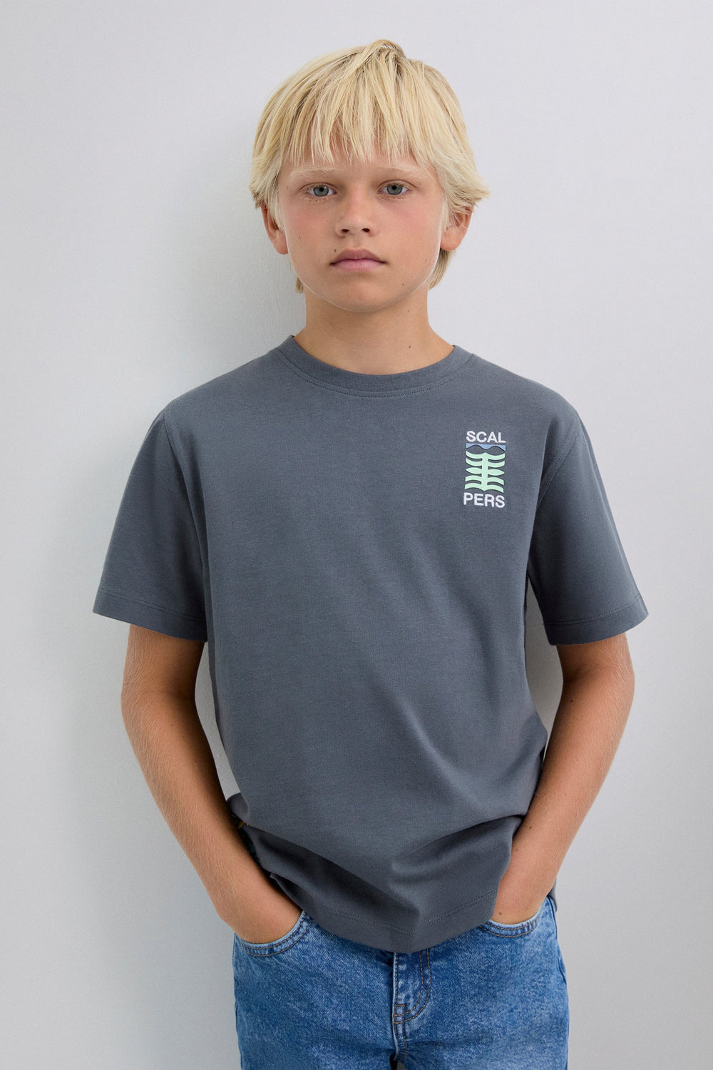 T-shirt made of 100% BCI cotton. Regular fit, short sleeves and round neck. Contrast print on front and bottom right side with embroidered logo.