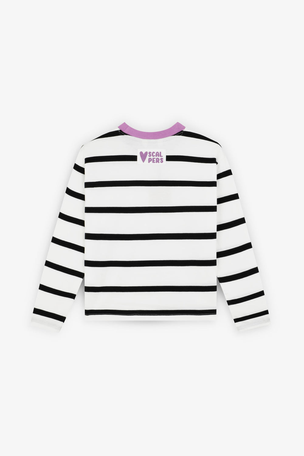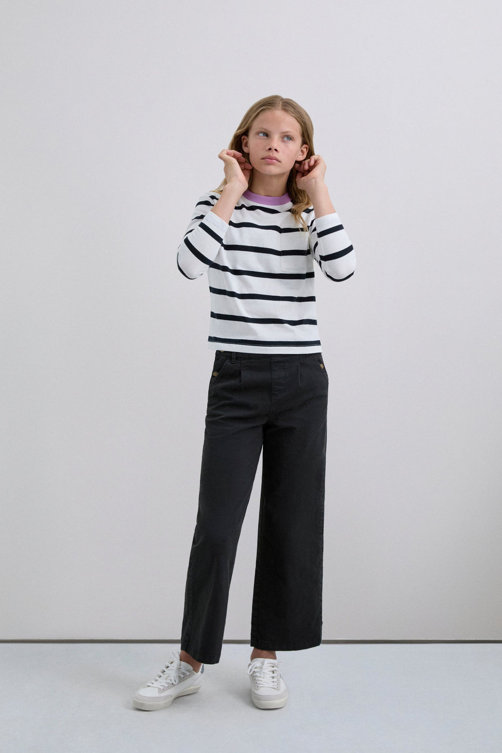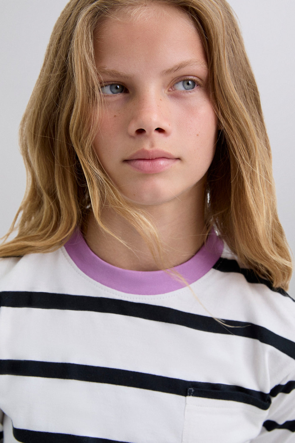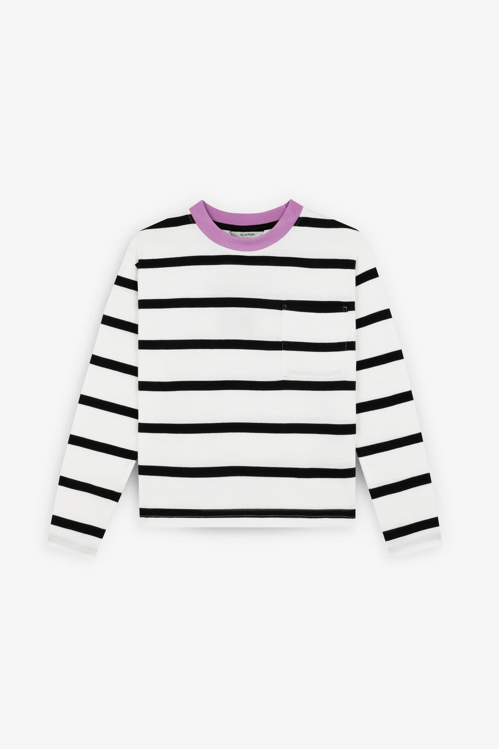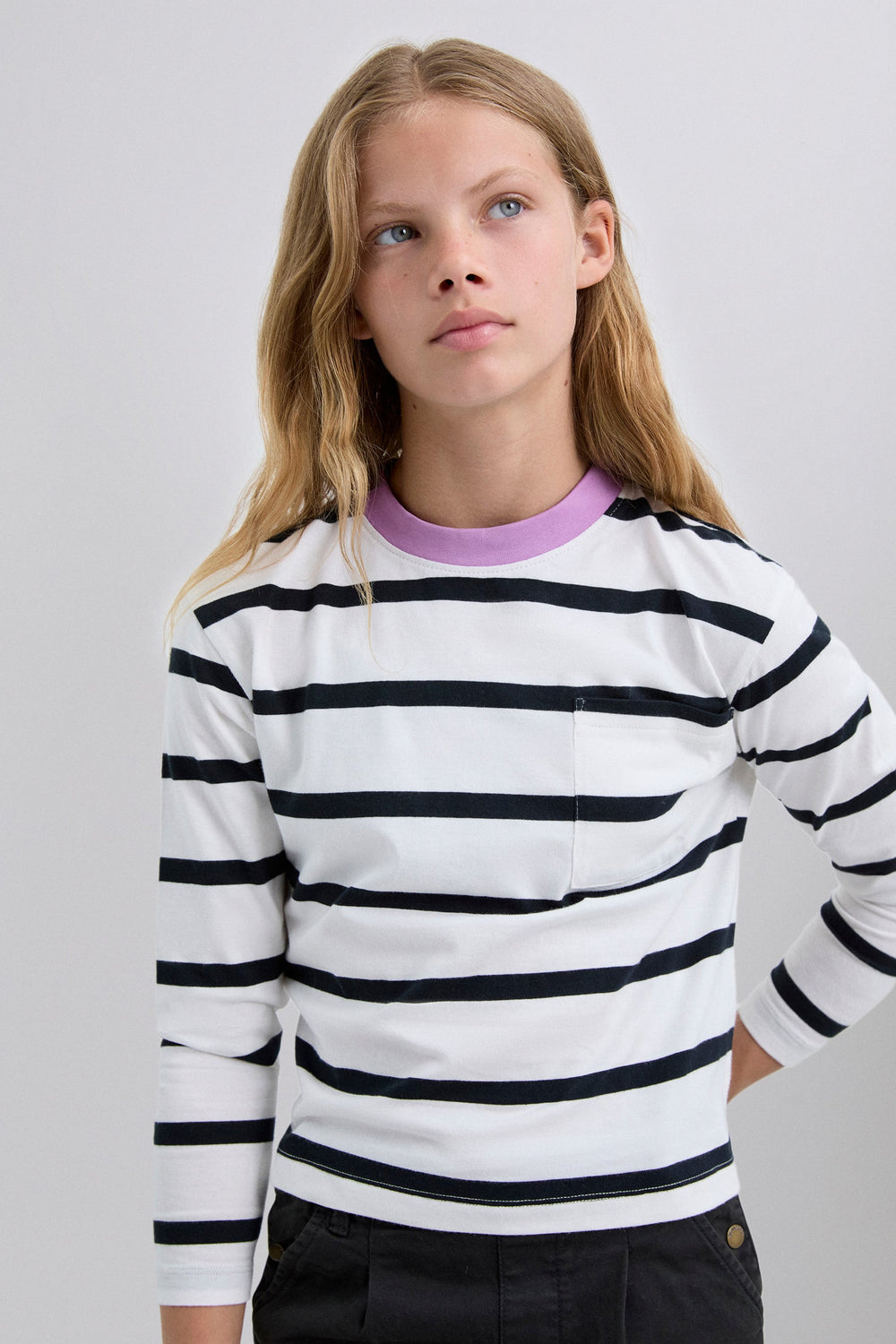 Striped T-shirt made of 100% BCI cotton. Regular fit, contrast round neck and long sleeves. Chest pocket detail and logo label on back.