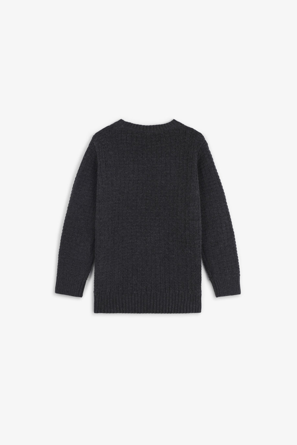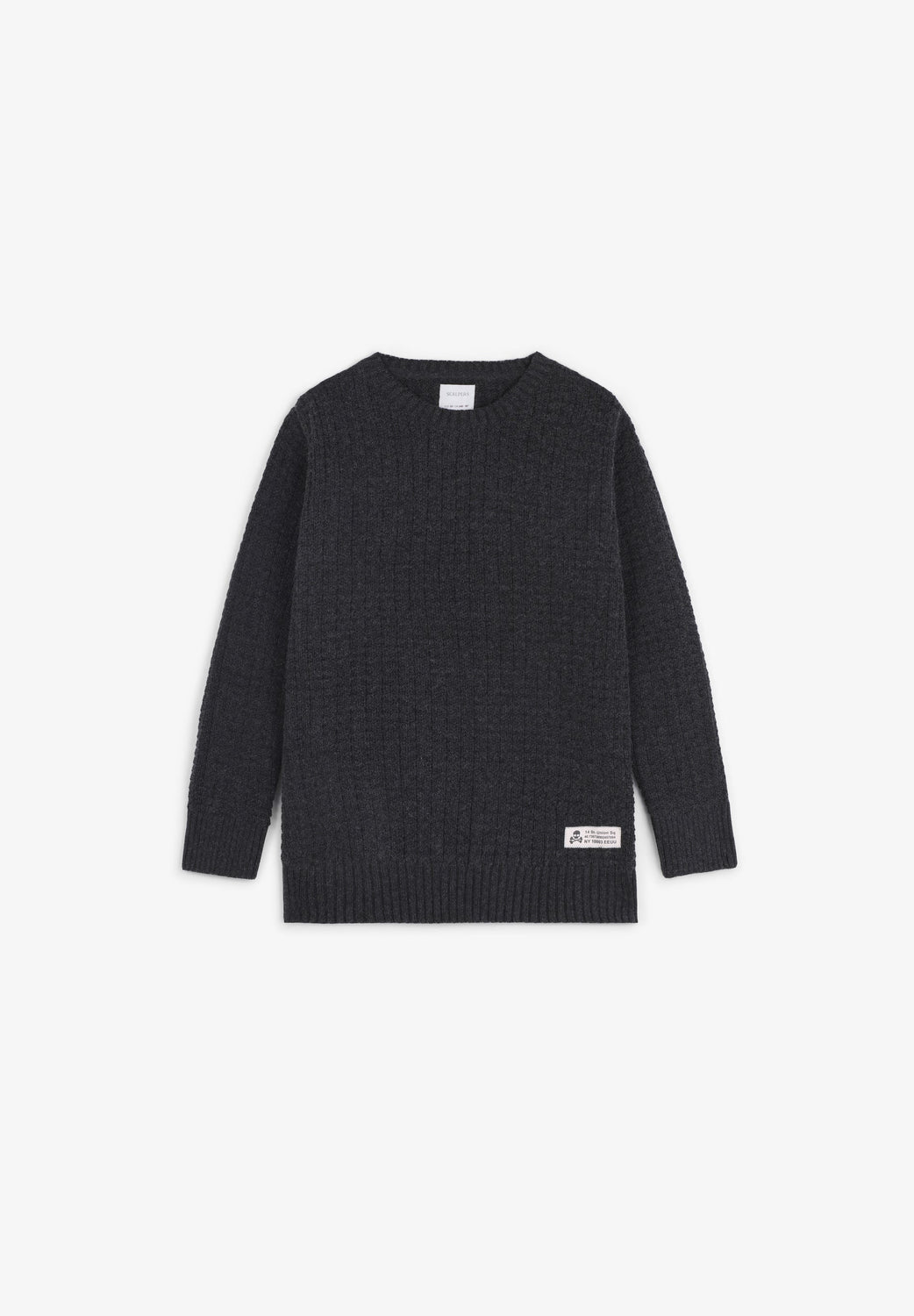 Round neck sweater Long sleeves. Ribbed trim. Embroidered logo detail at the bottom.