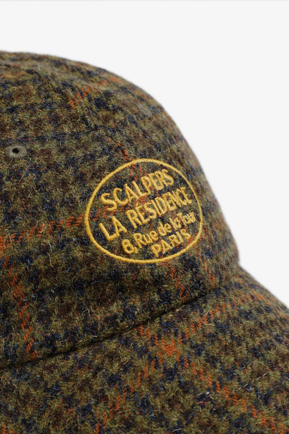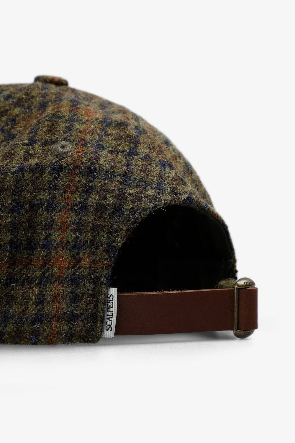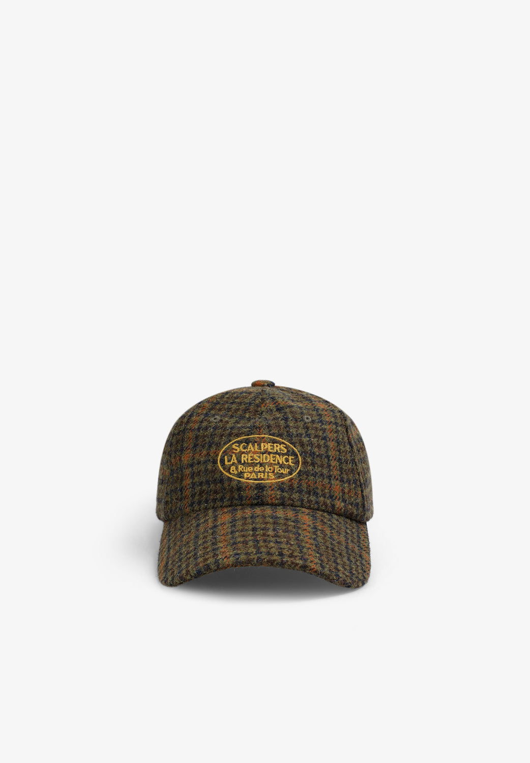 Cap made of wool. Tartan print. Embroidery on front. Adjustable fastening.