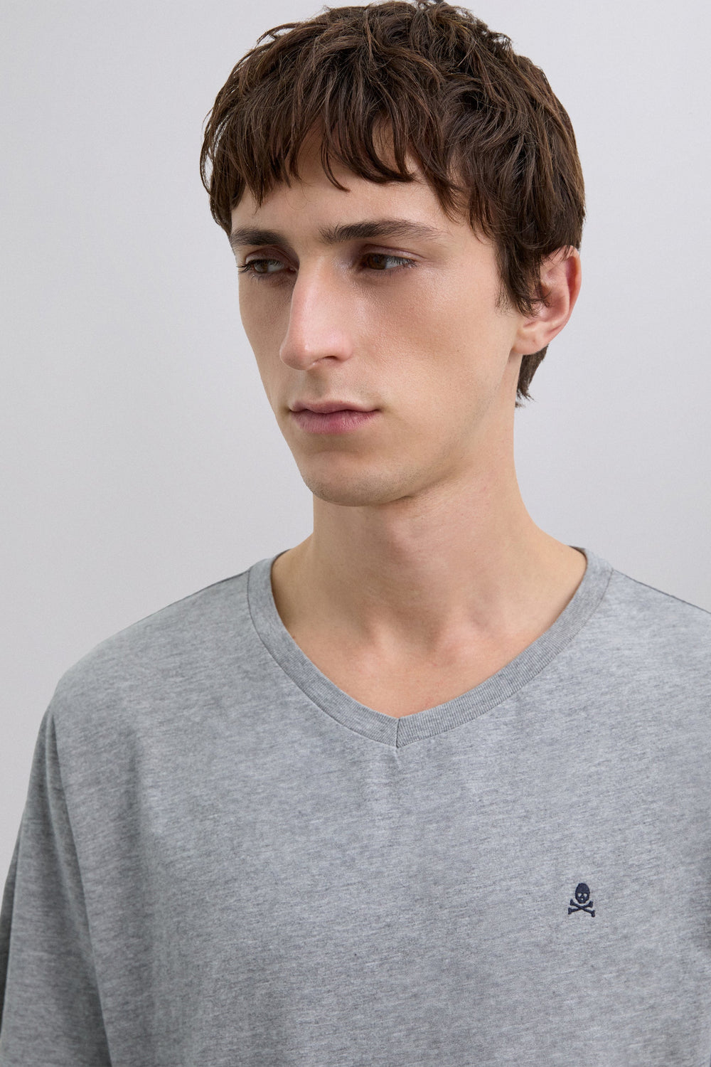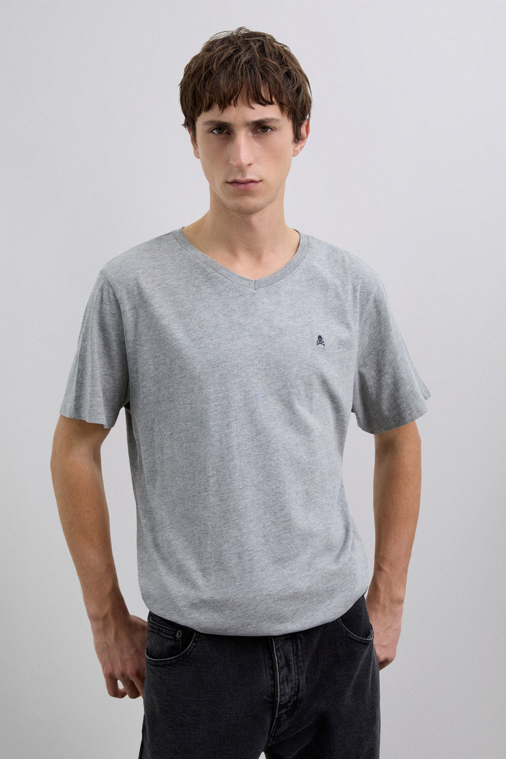 Camiseta básica con calavera bordada. Confeccionada en 100% algodón BCI. Corte Regular Fit. Cuello en pico. Manga corta.