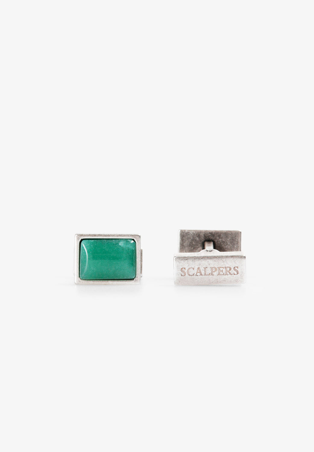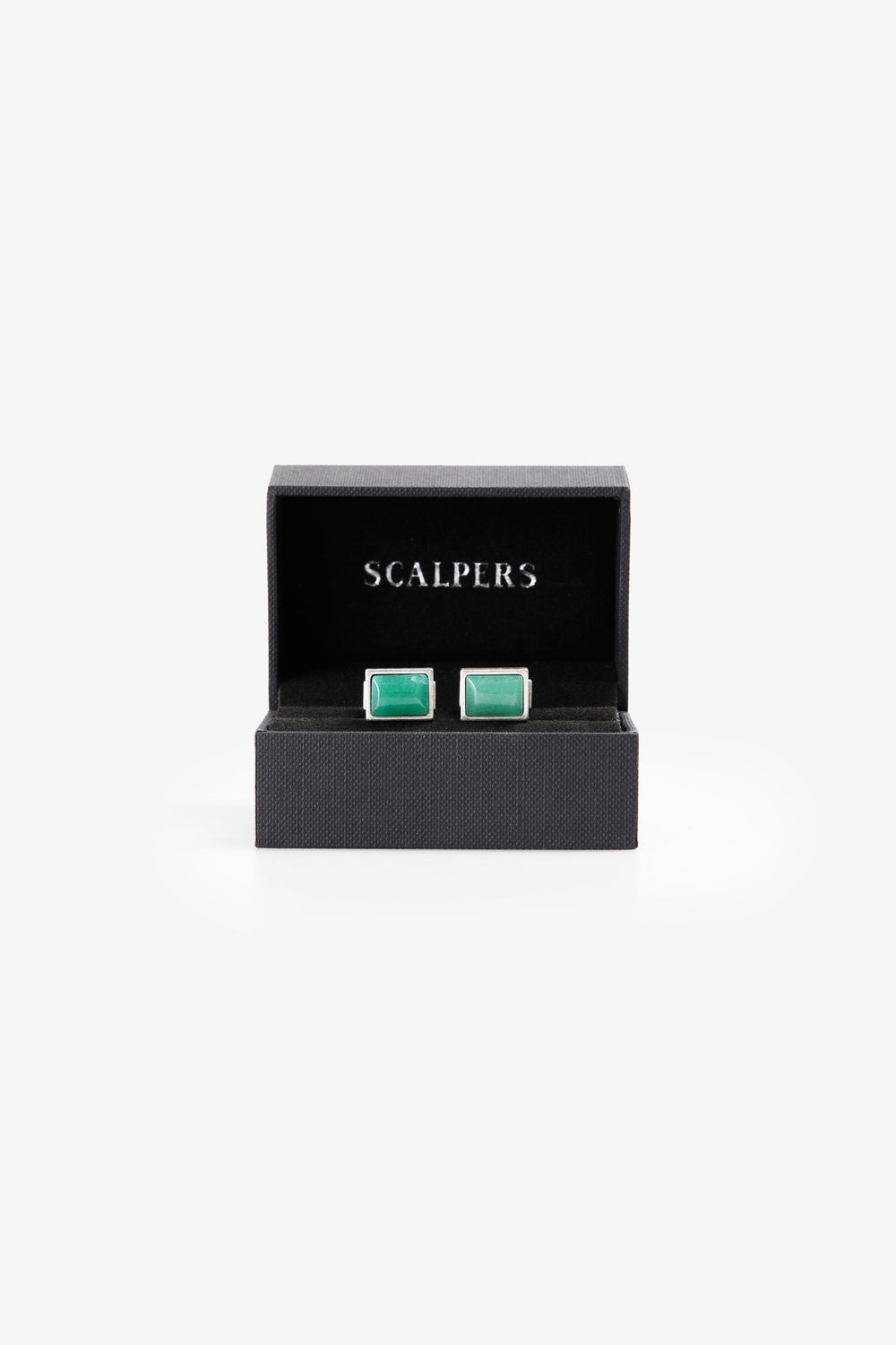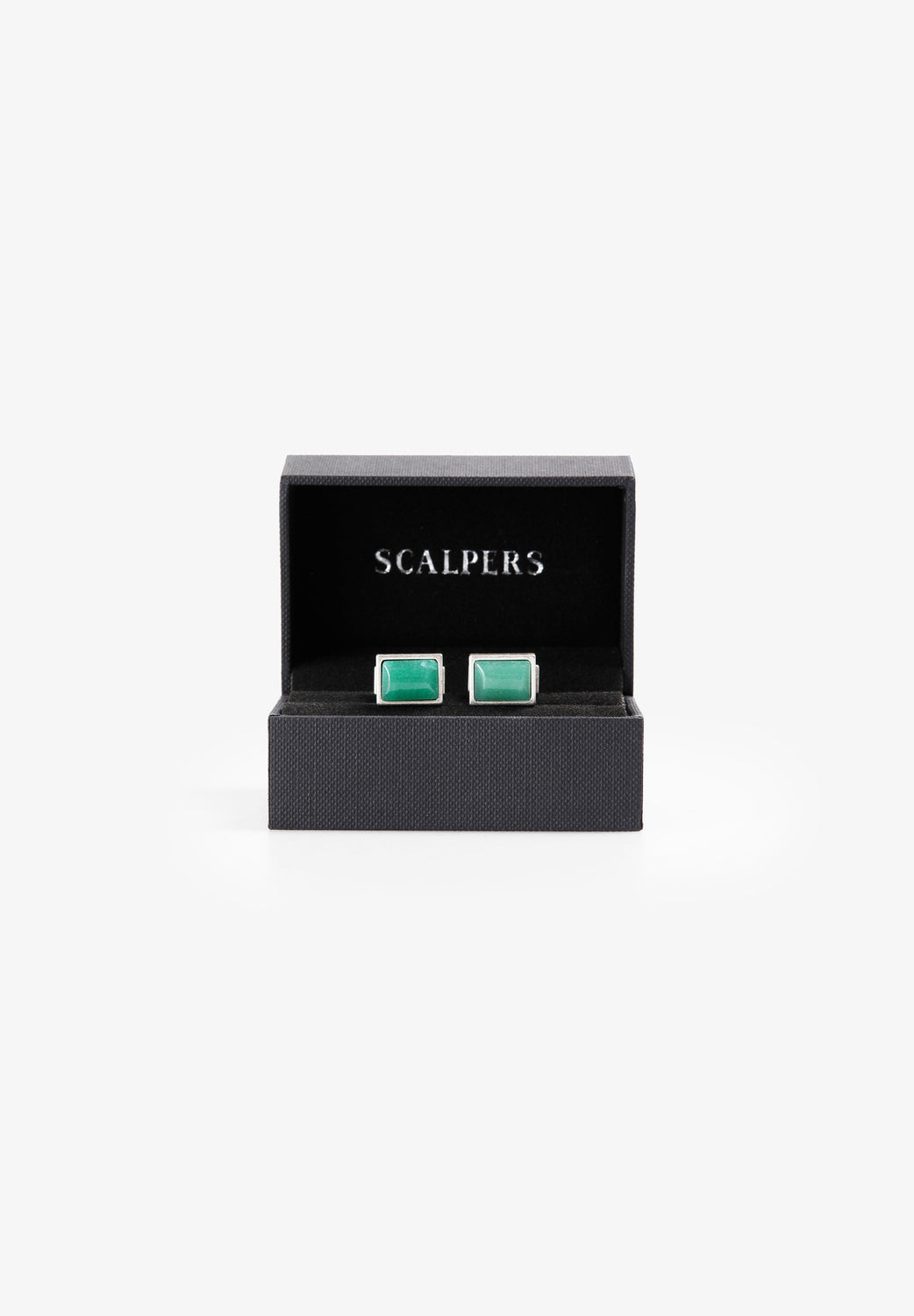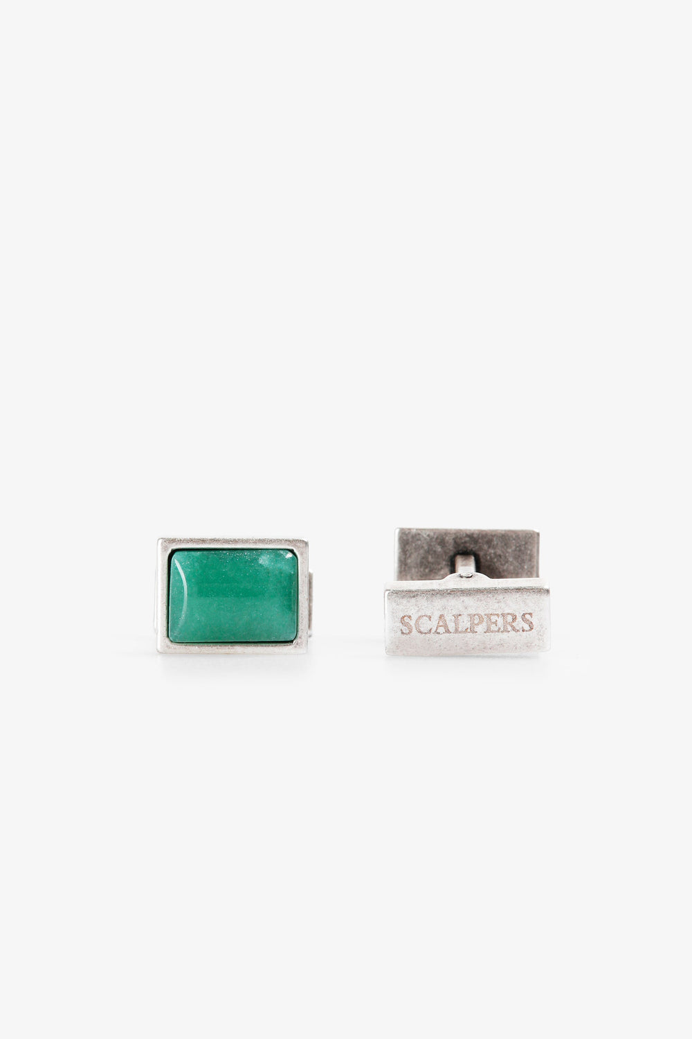 Square cufflinks in silver-plated brass with natural stone. Logo detail on the back.