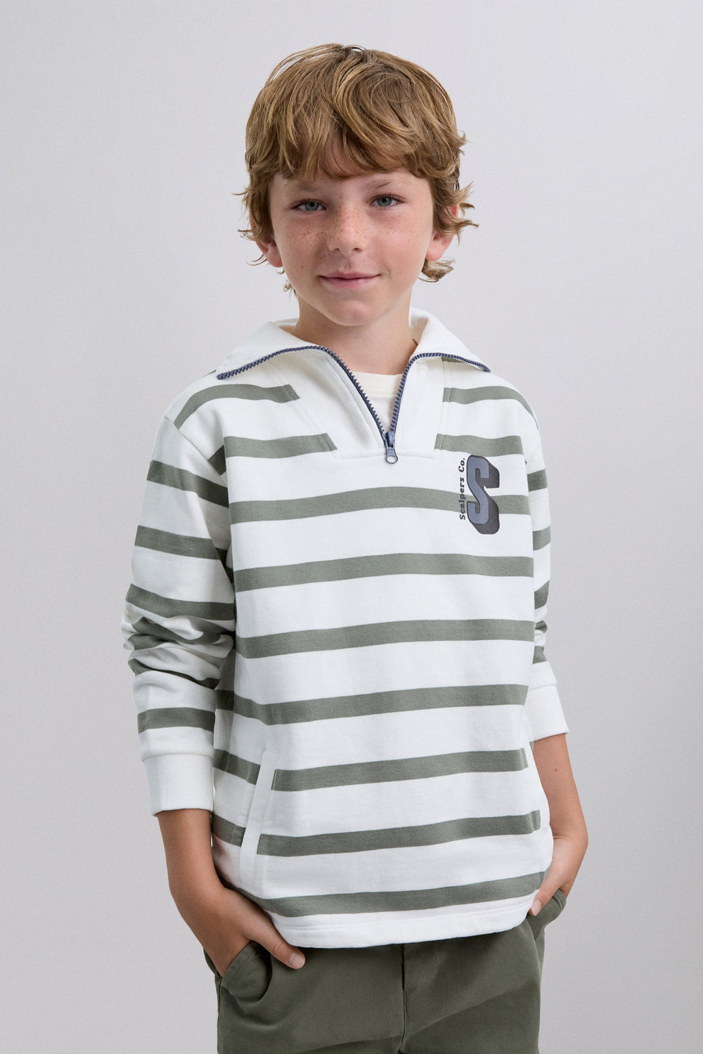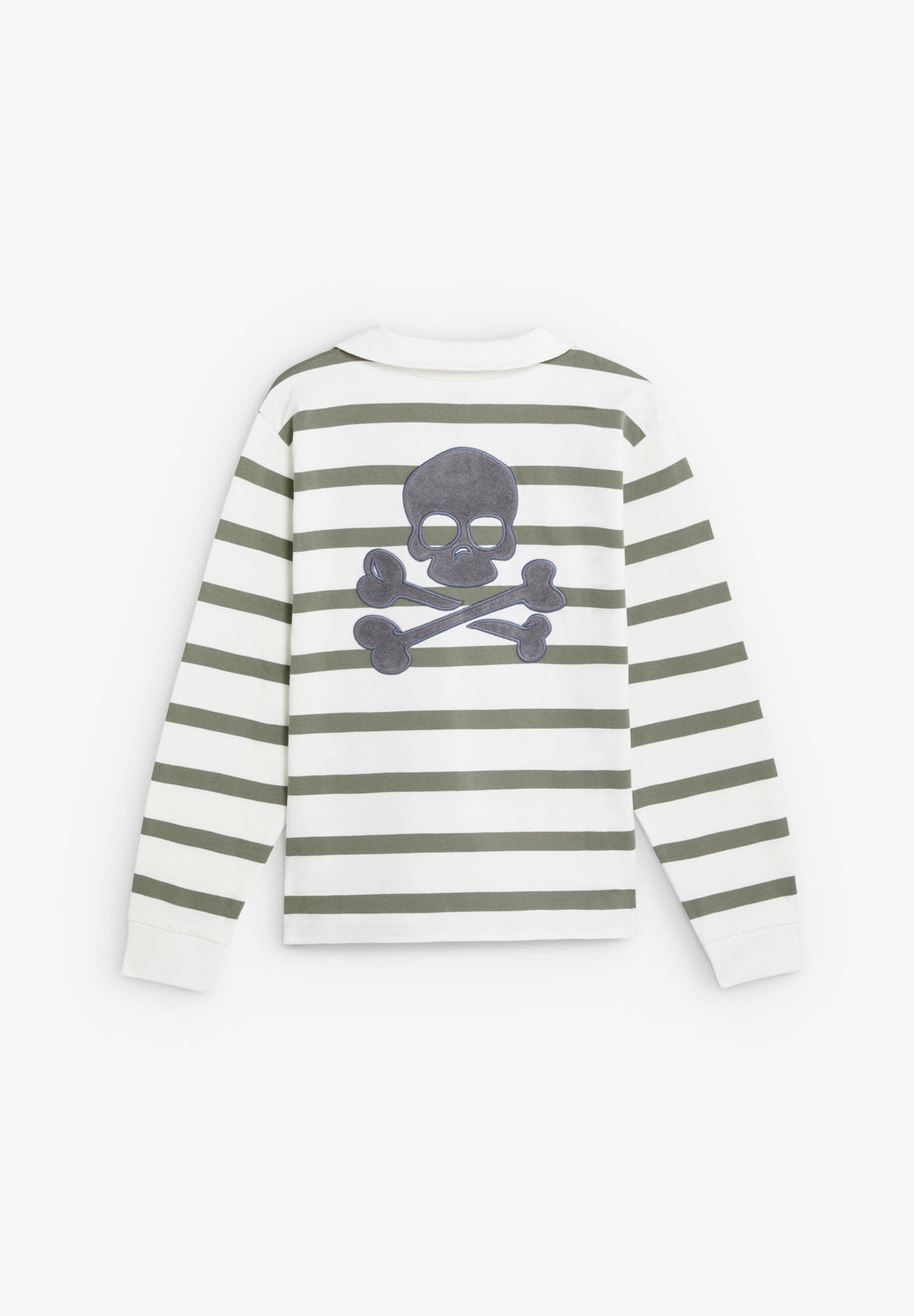 Striped print sweatshirt made of 100% BCI cotton. Collar with half zip fastening. Regular fit. Long sleeves. Two front pockets. Embroidered motif on chest and skull on back. Ribbed trim.