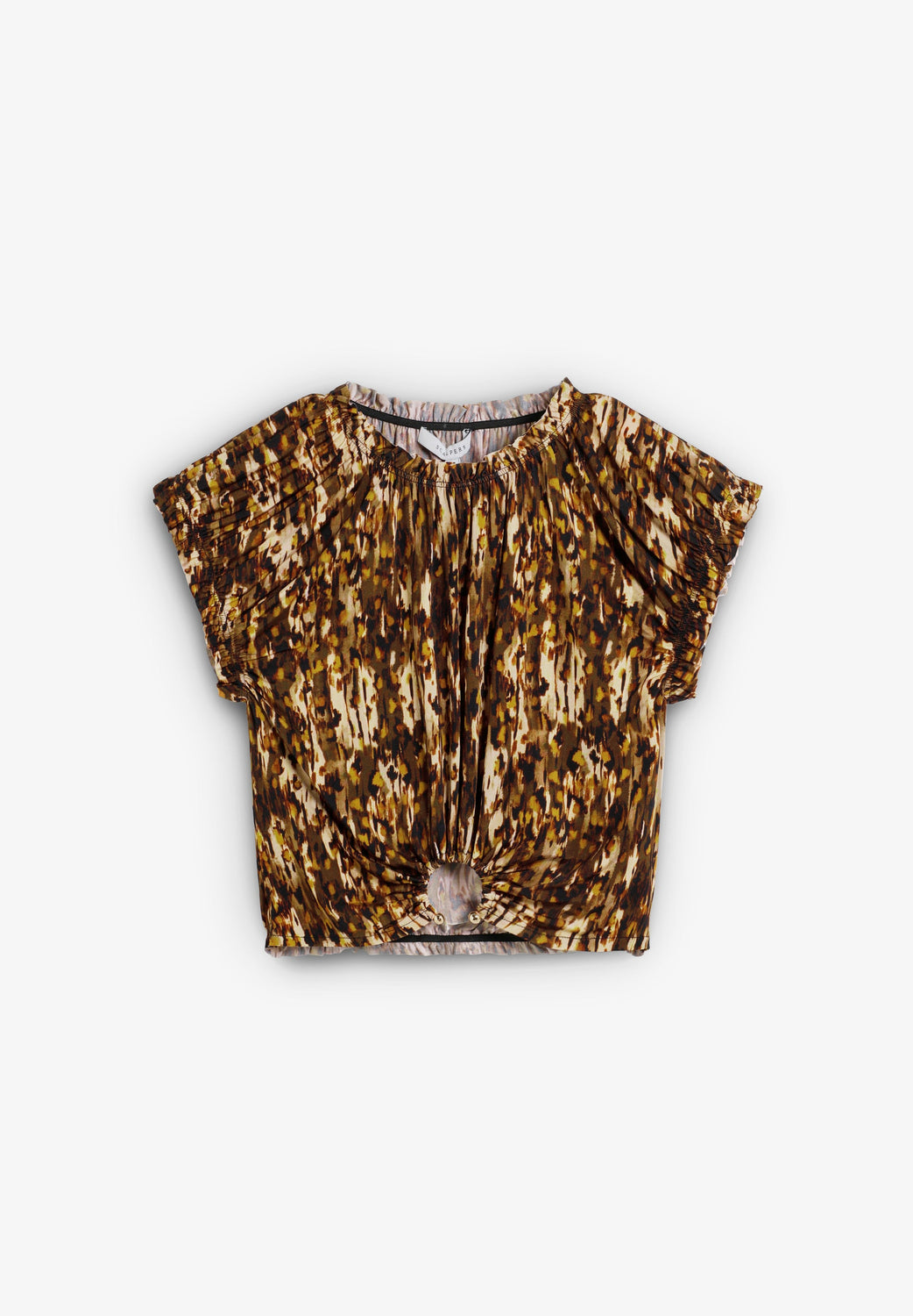 Printed top with metal buckle detail on the front. Short sleeve. Round neck.