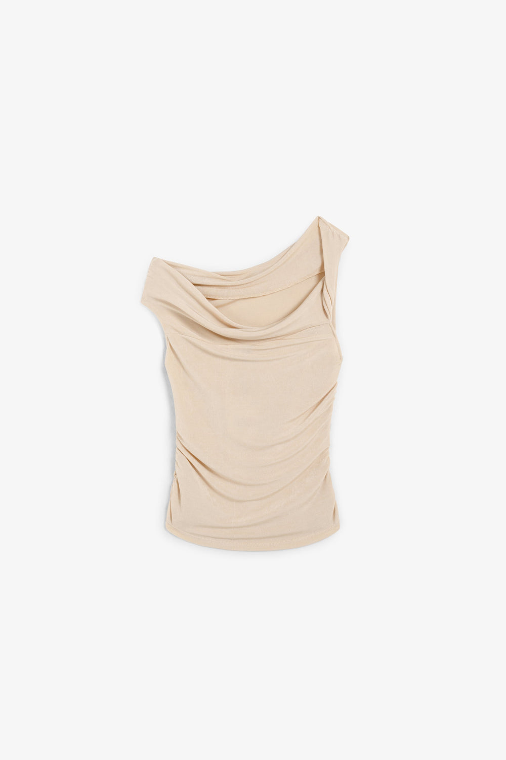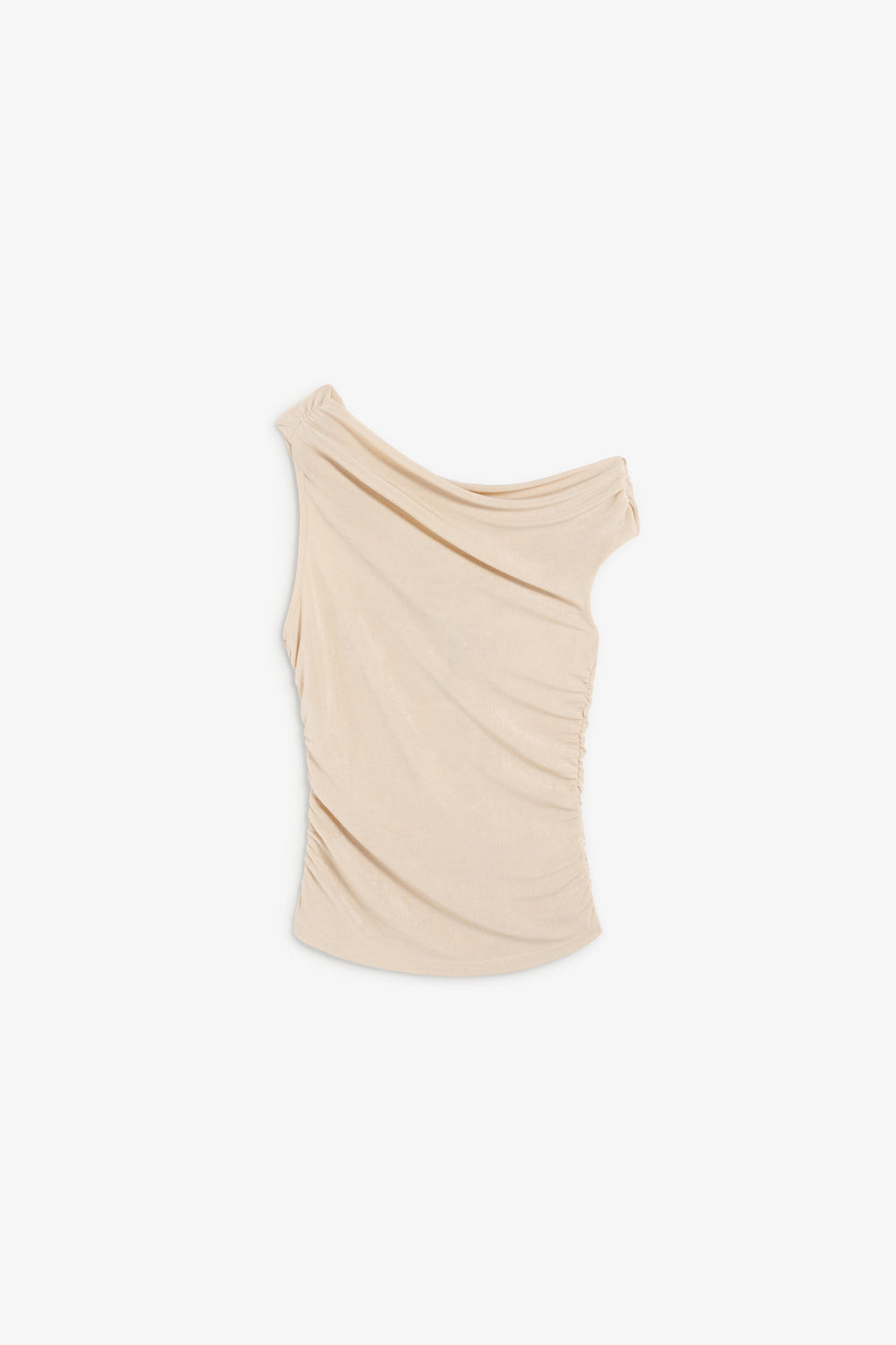 Top made of slightly stretchy fabric. Slim fit, Off The Shoulder, asymmetric neckline with gathers on the sides.