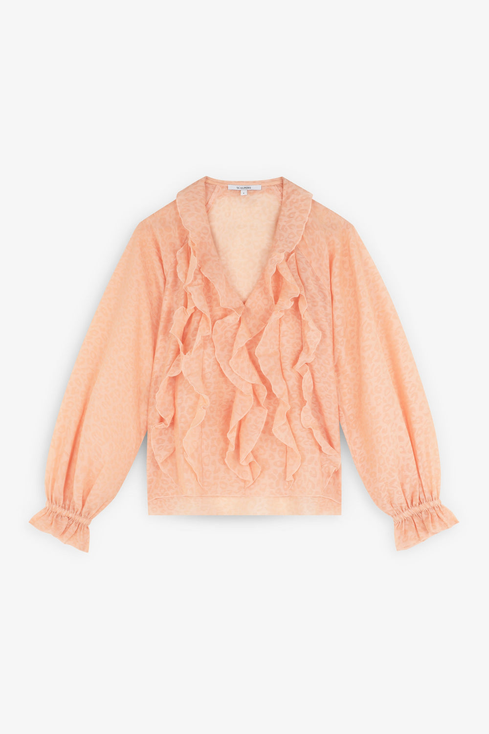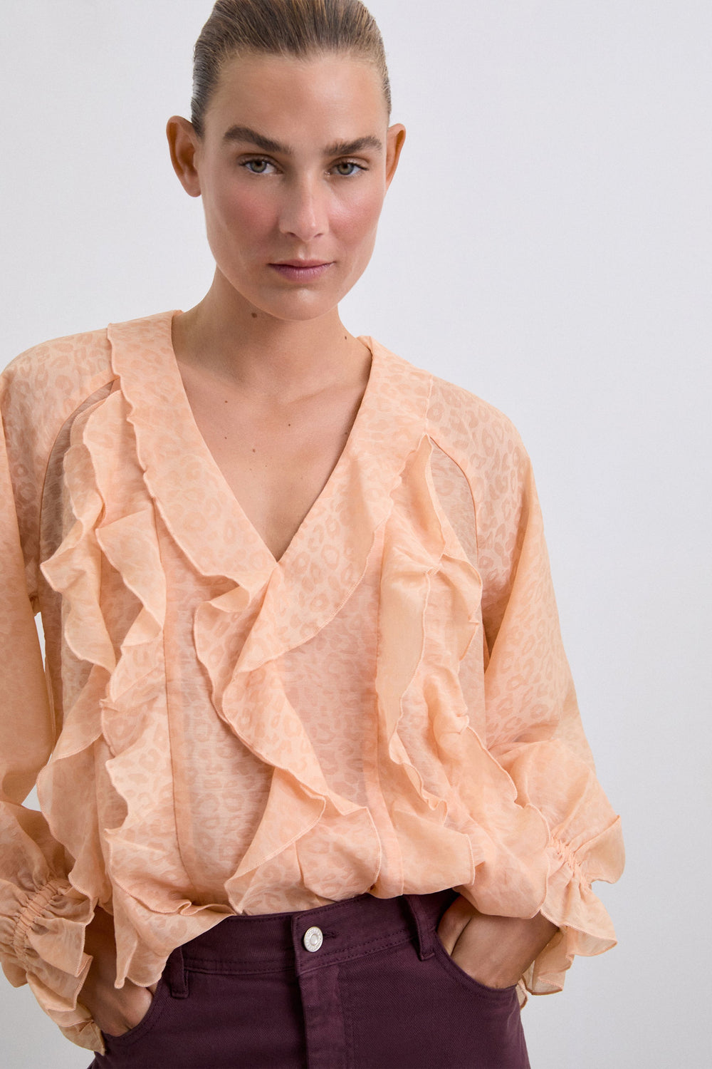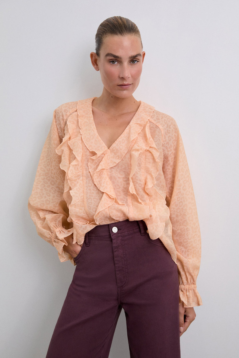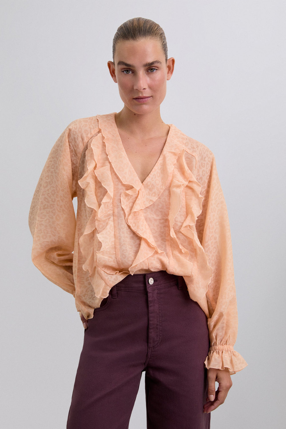 Flowing fabric blouse with ruffle details and matching animal print. Regular fit, V-neck and long puffed sleeves with ribbed cuffs with ruffle.