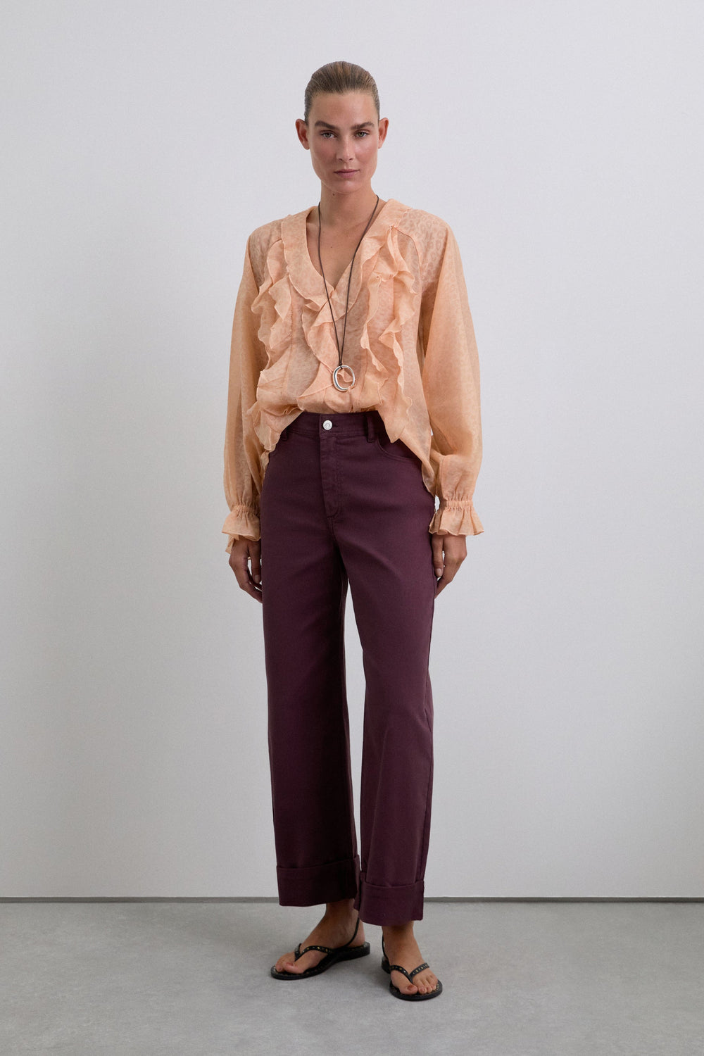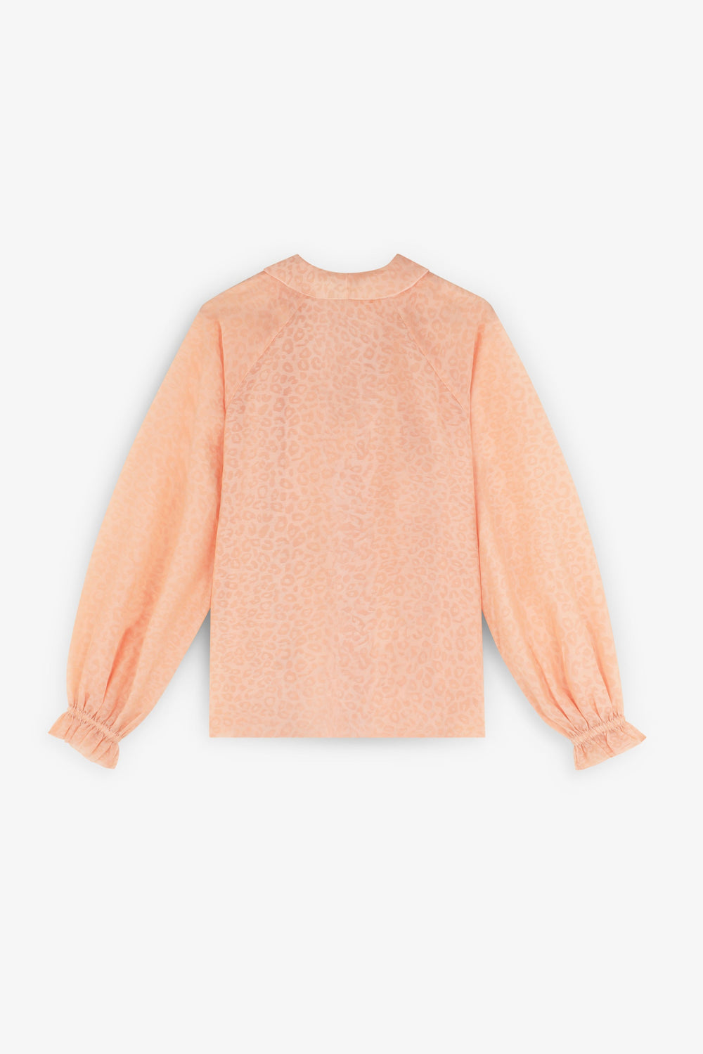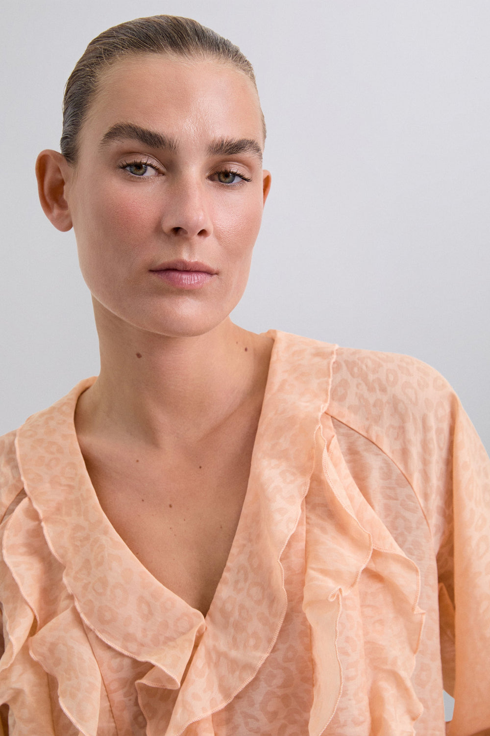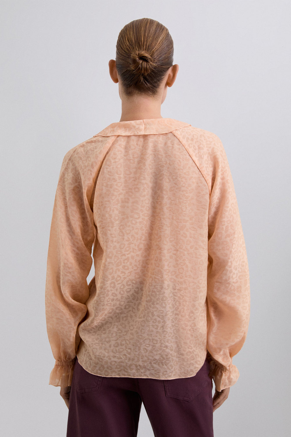 Flowing fabric blouse with ruffle details and matching animal print. Regular fit, V-neck and long puffed sleeves with ribbed cuffs with ruffle.