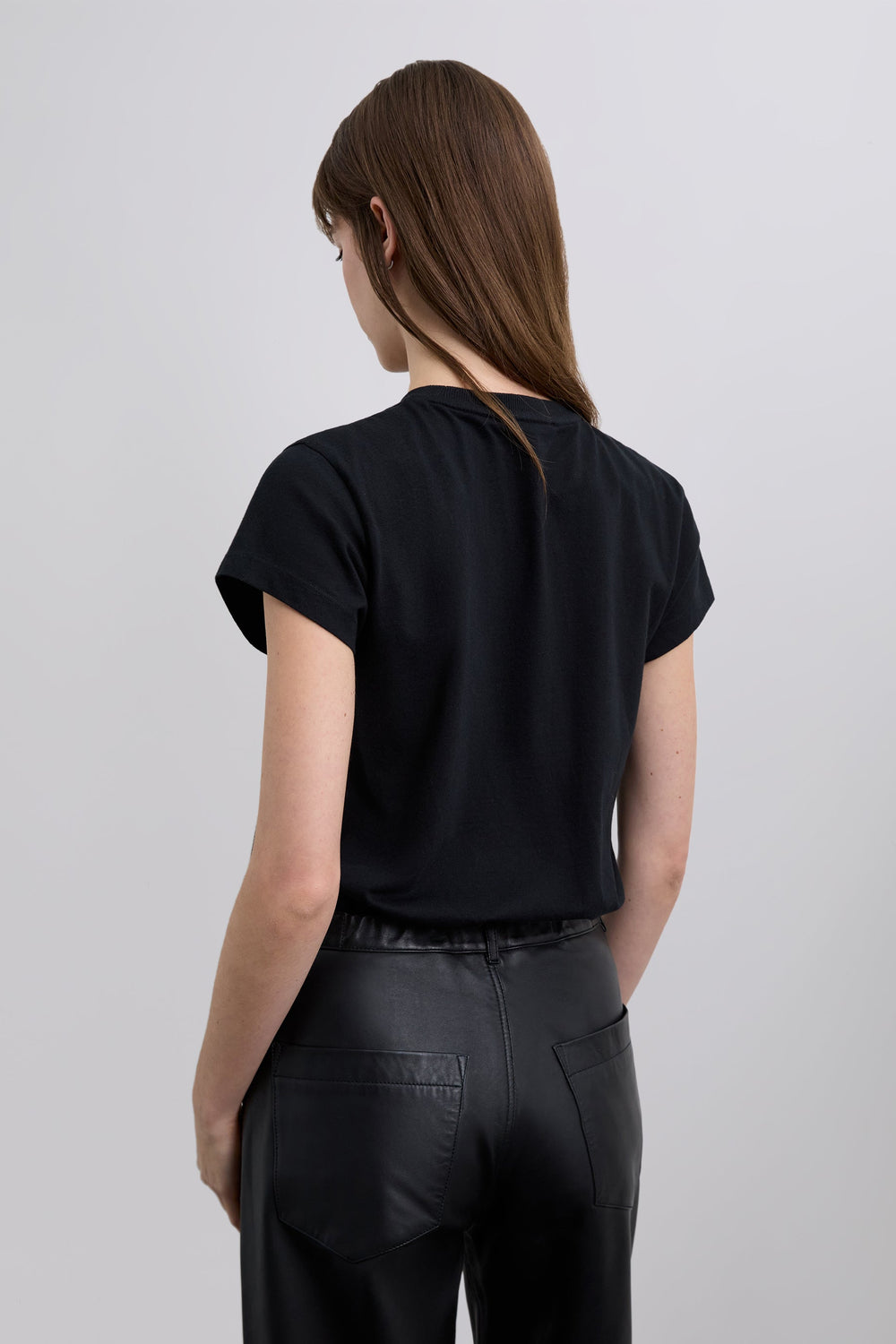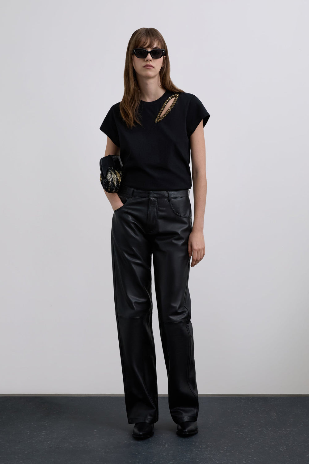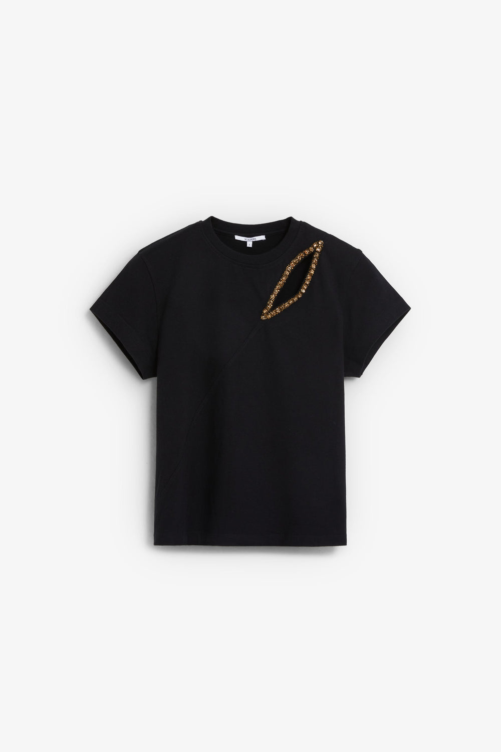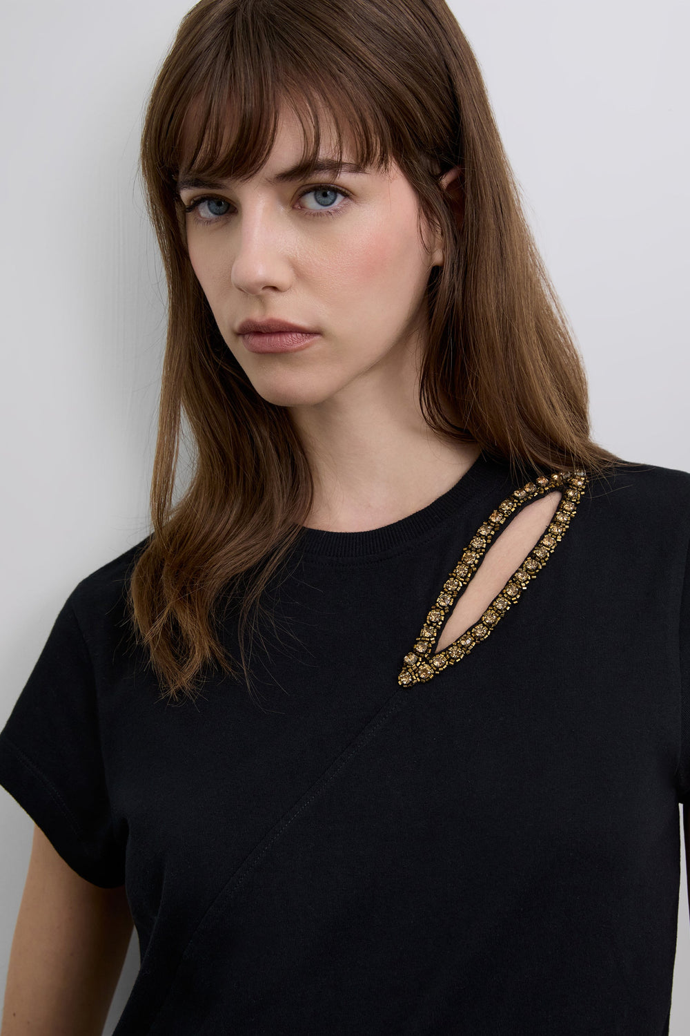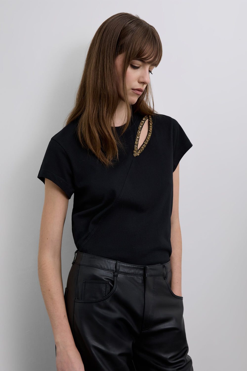 Regular fit T-shirt with round neck and short sleeves. Cut-out detail with embellishment on the front.