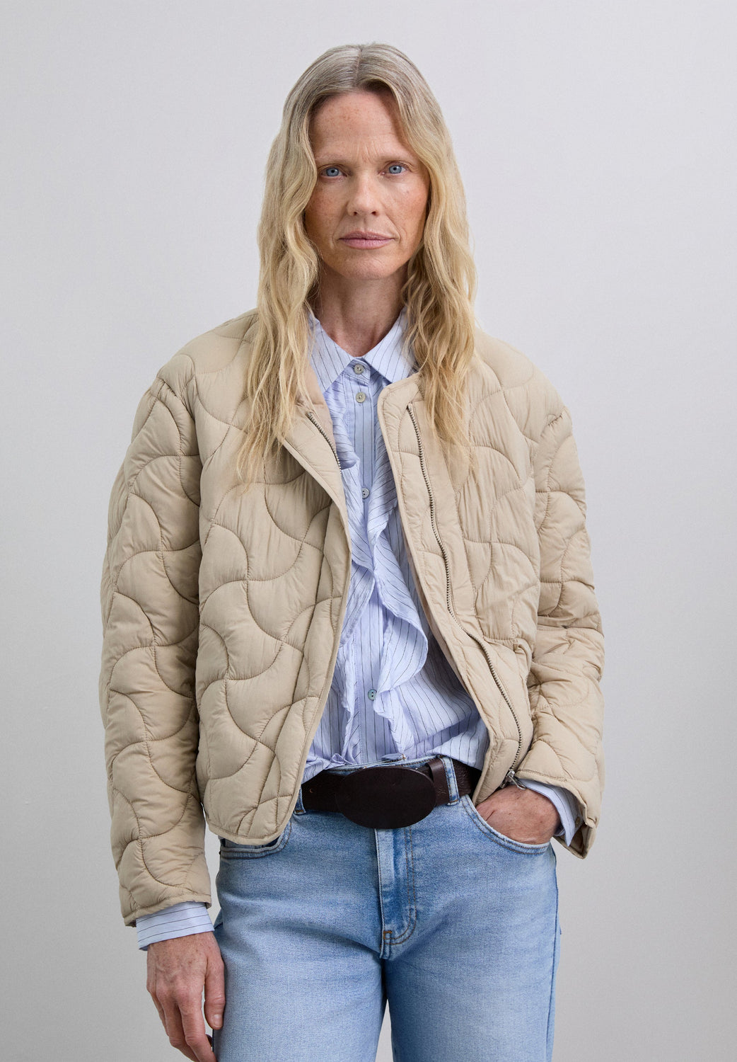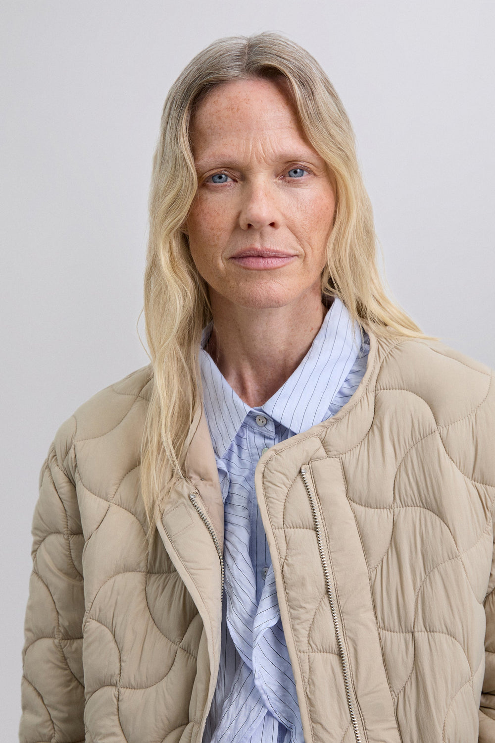 Regular fit puffer jacket. Round neck. Long sleeves. Snap-button fastening and zip at front. Rounded hem. Piped detailing around sleeves, pockets and hem.