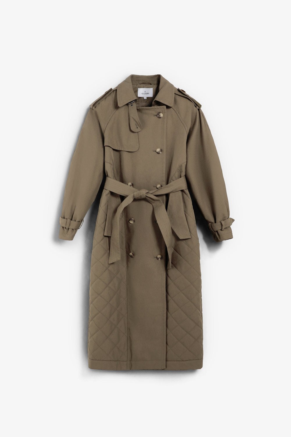 Coat quilted, waterproof trench coat made of cotton. Quilted detail at the bottom. Voluminous sleeves and cuff tabs. Front button fastening and adjustable belt.