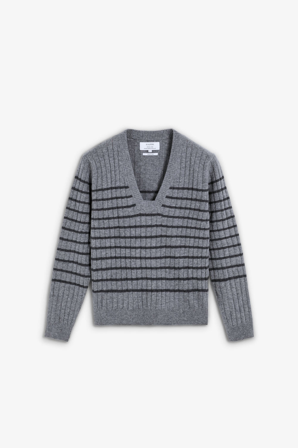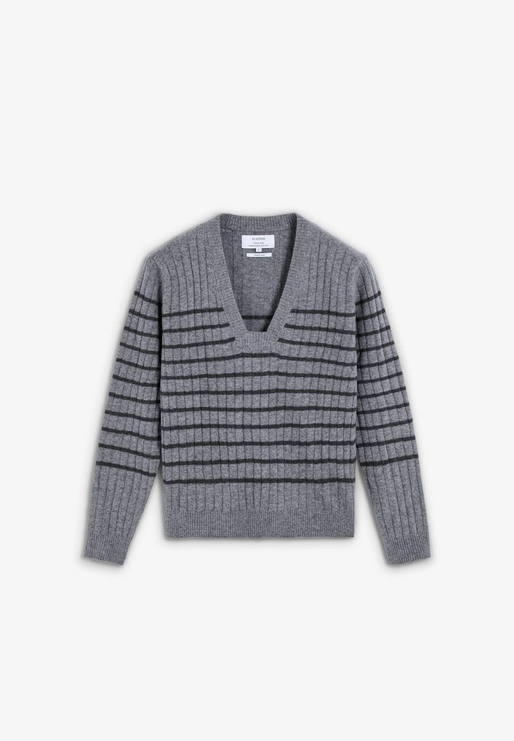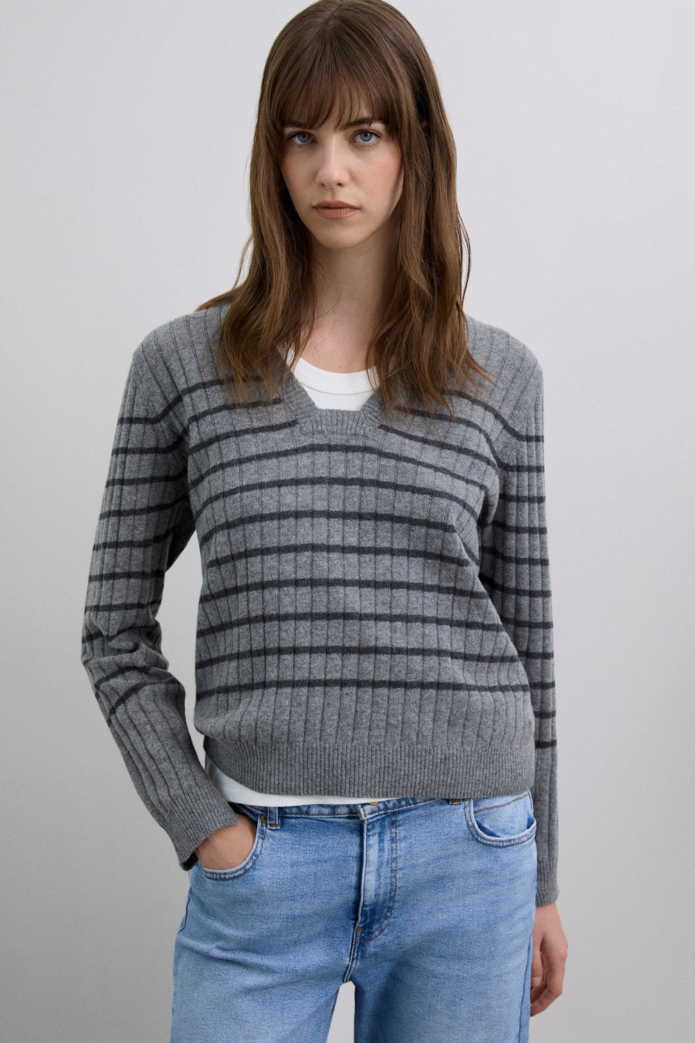 Sweater made of ribbed wool blend with striped print. Regular fit, slightly squared V-neck design. Long sleeves.