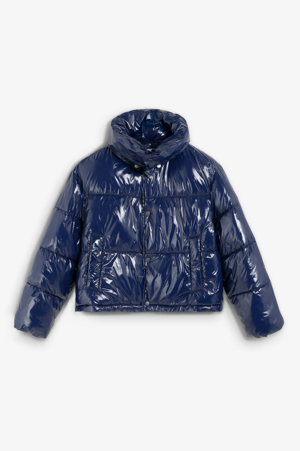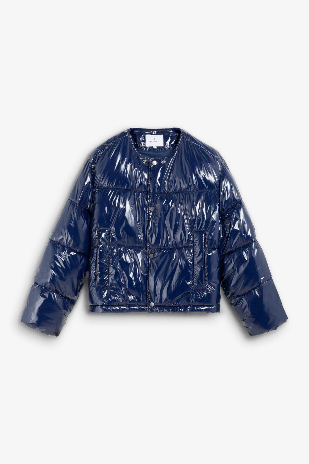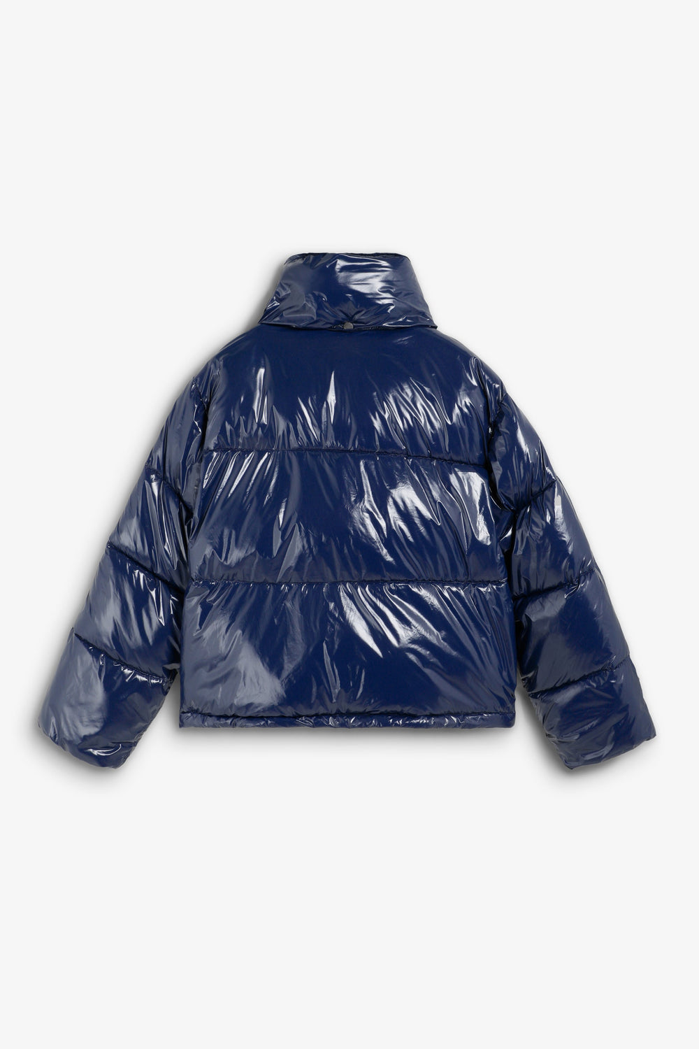 Quilted down jacket made of nylon with shiny finish. Regular fit. High collar. Long sleeves. Side slant pockets. Snap button fastening.