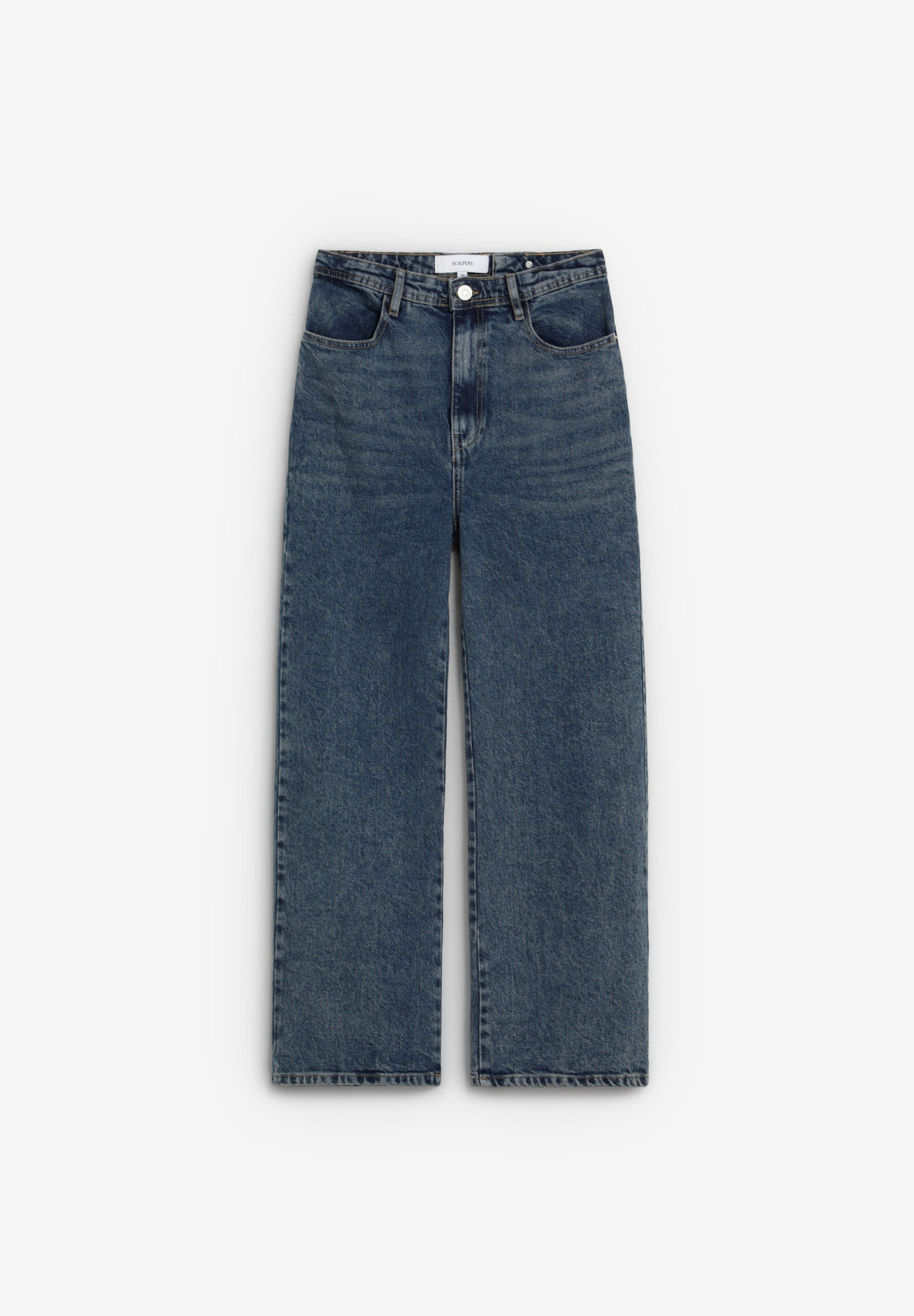 Denim trousers made of slightly stretch cotton fabric. Relaxed fit Belt loops. High-rise with zip and button fastening. Triple back button detail on the side and back seams.
