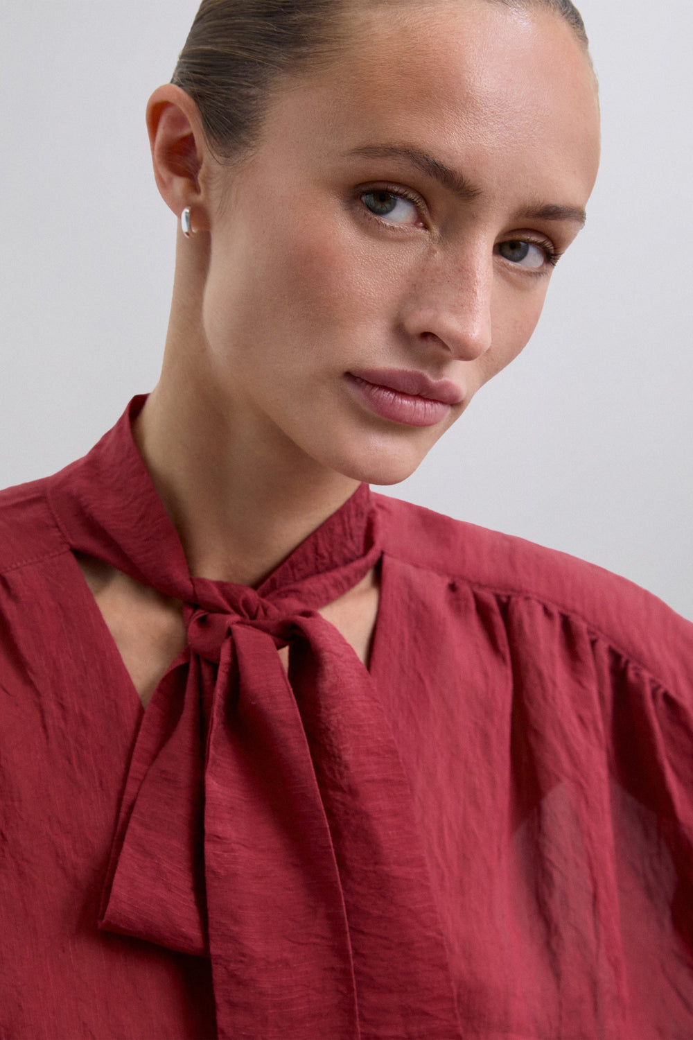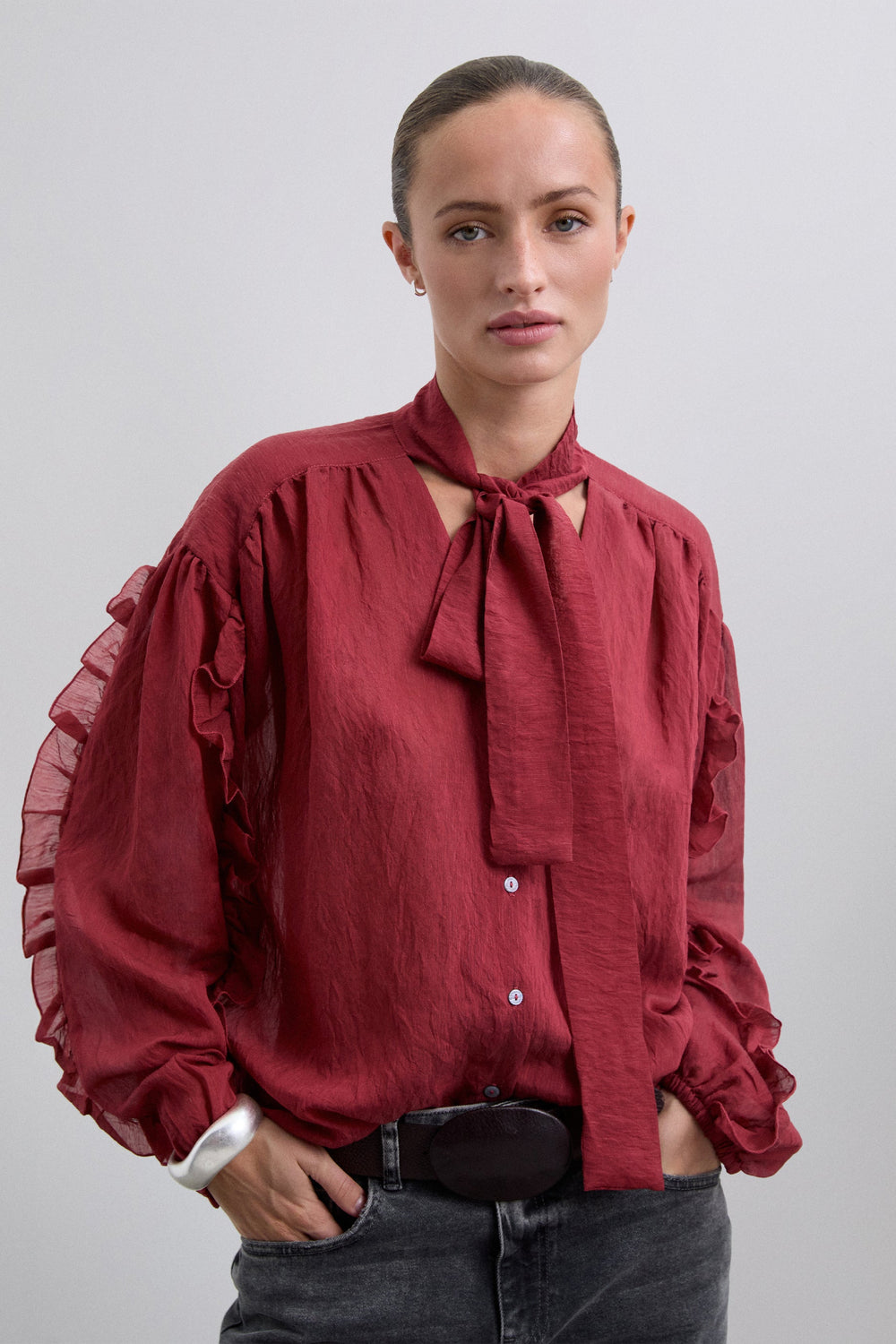 Blouse made of flowing fabric with linen and rayon. Regular Fit. Neckline with tie detail. Front button fastening. Long slightly puffed sleeves with cuffs. Ruffle detailing on the sleeves.