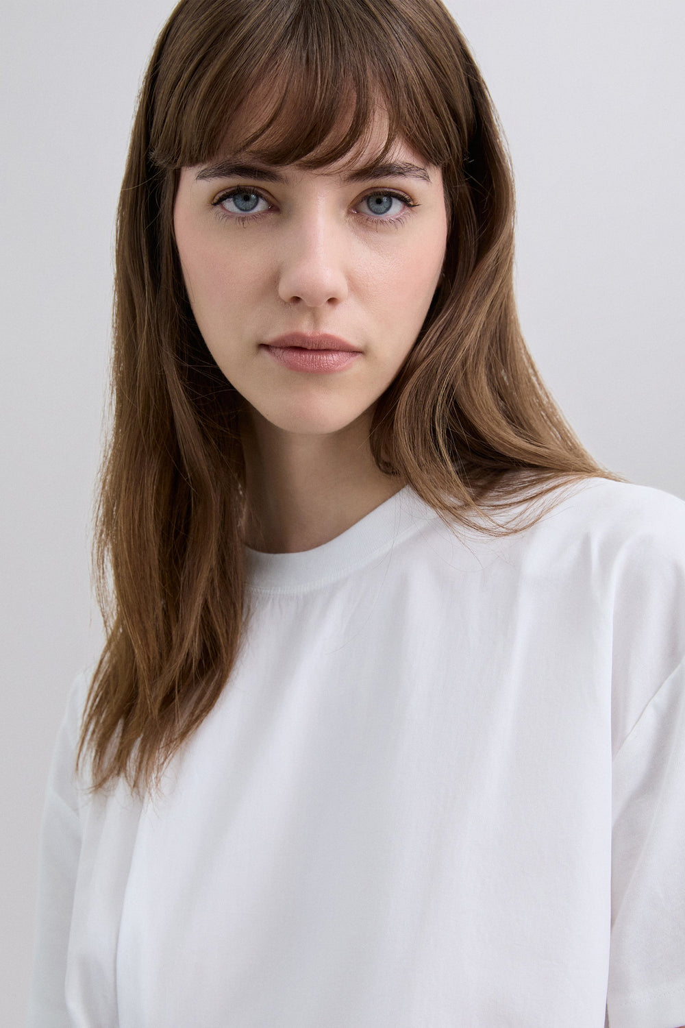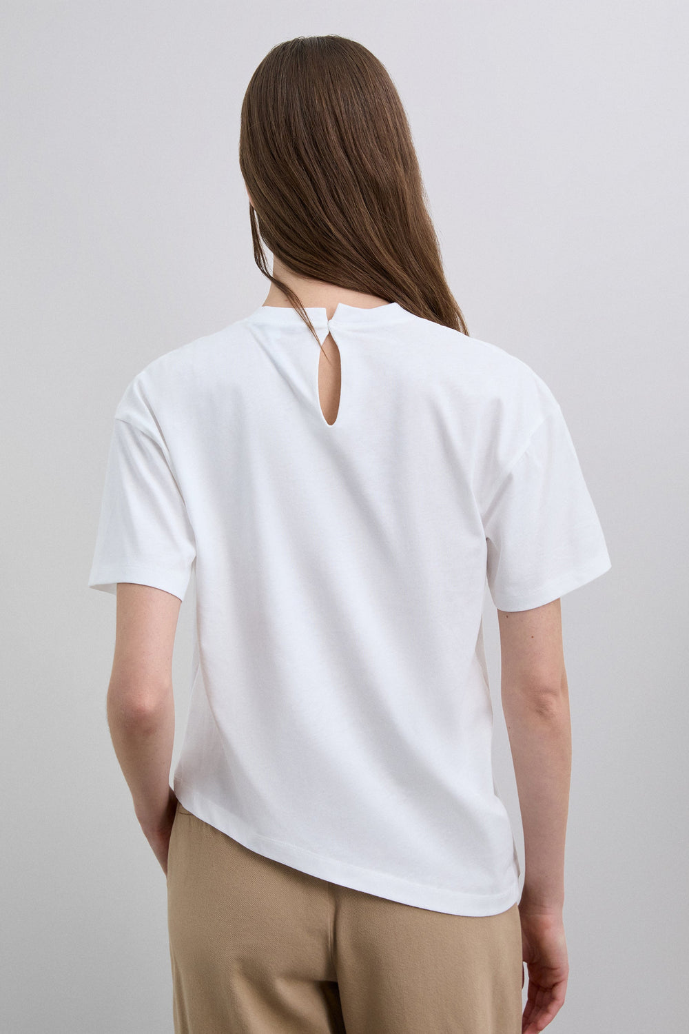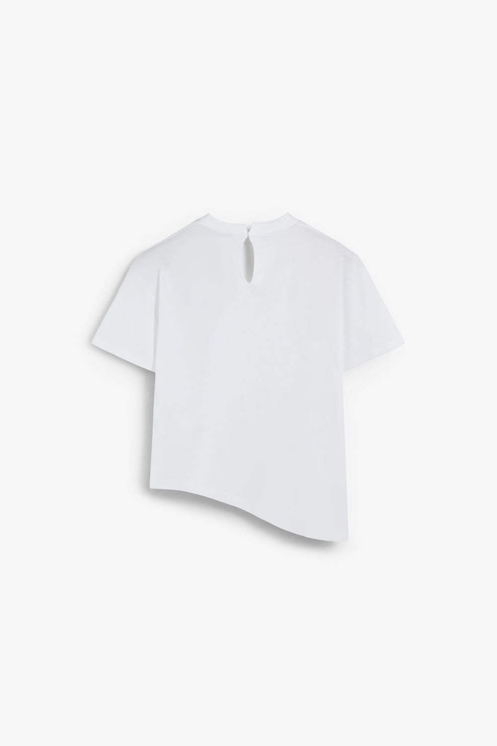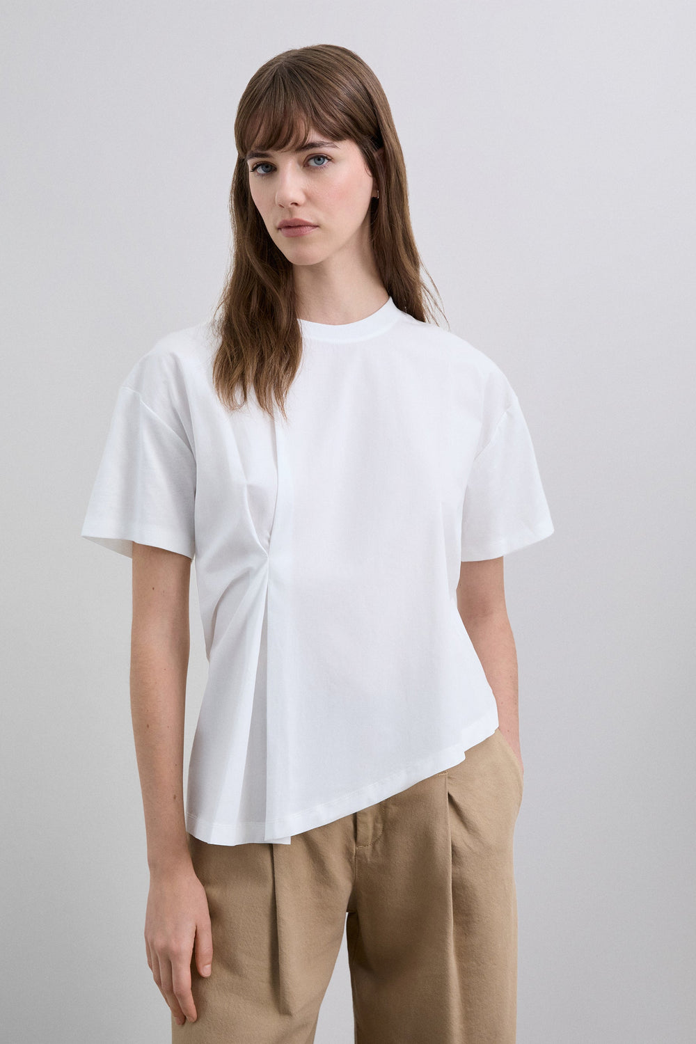 Short sleeve asymmetric-style T-shirt made of 100% BCI cotton. It features a round neck and an overlapping front panel that creates a draped side effect. Back fastening with small opening.