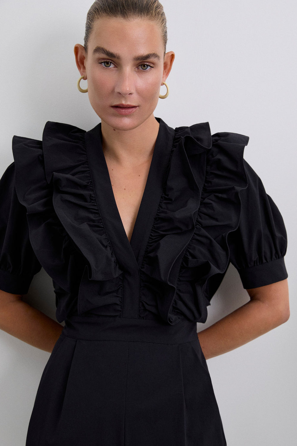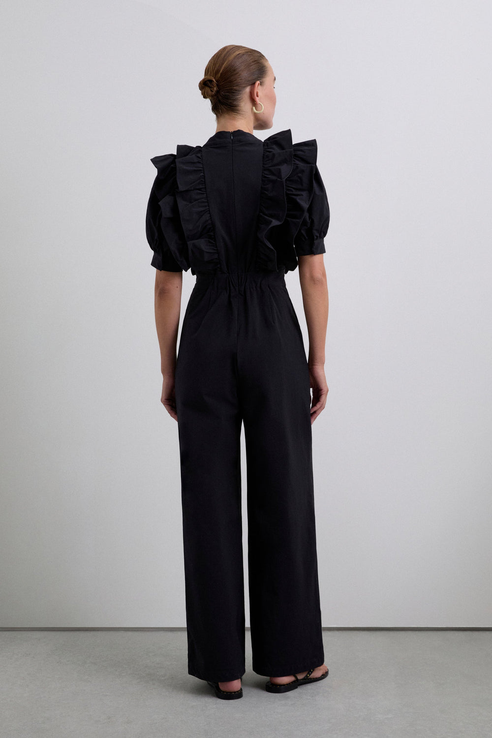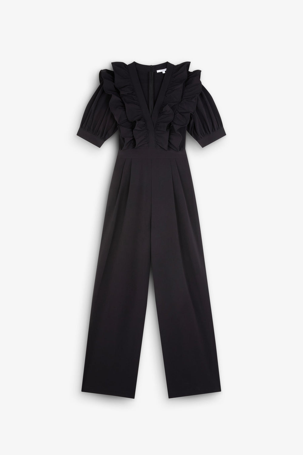 Black jumpsuit. Regular fit, V-neck with ruffle detail, puff sleeves with trim, fitted waist and full length trousers. Back zip fastening.
