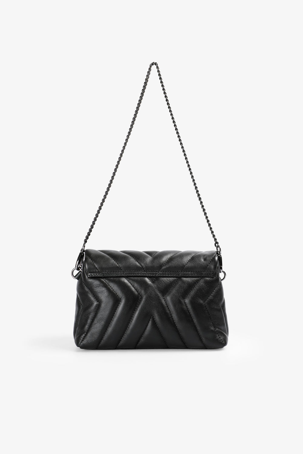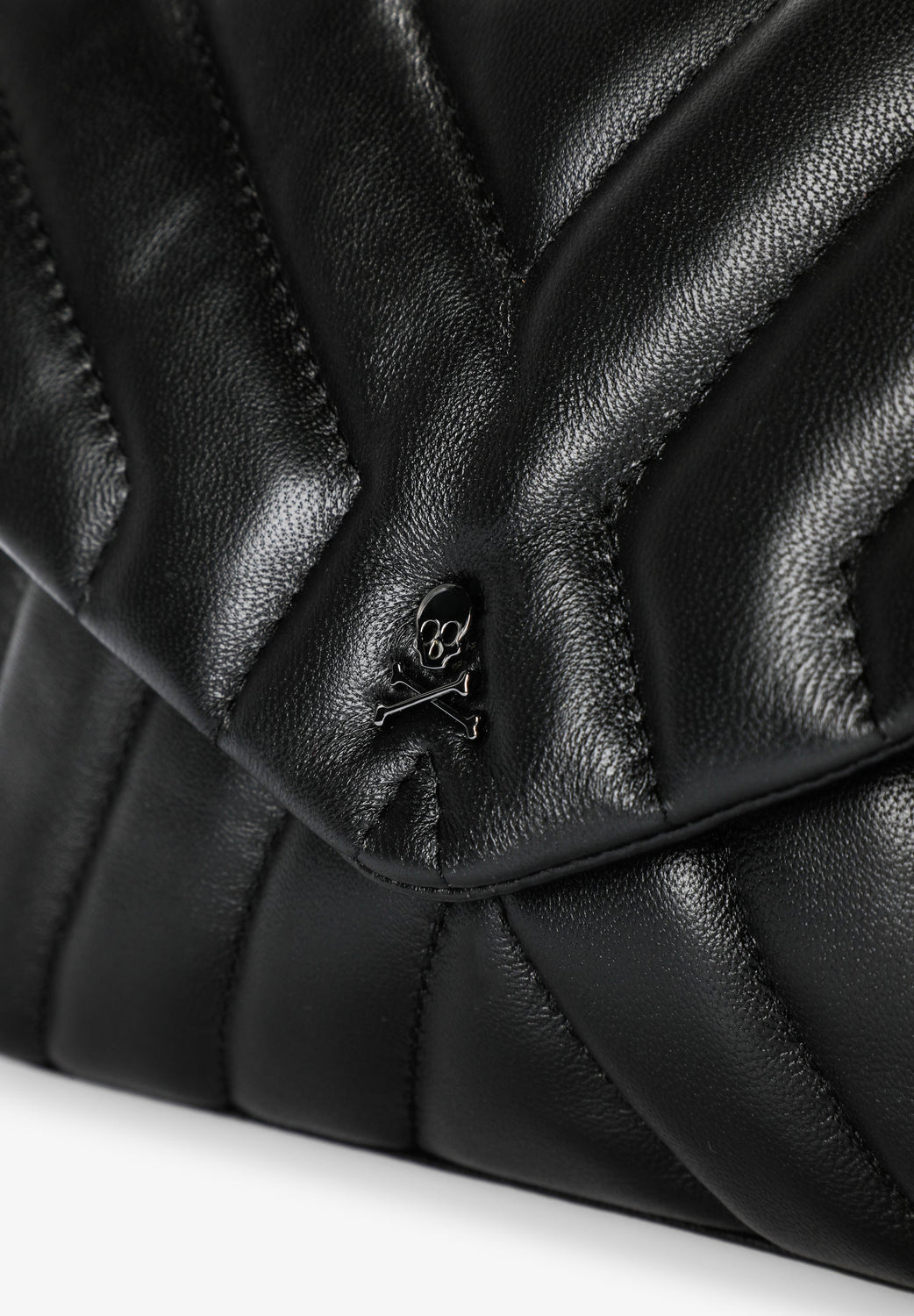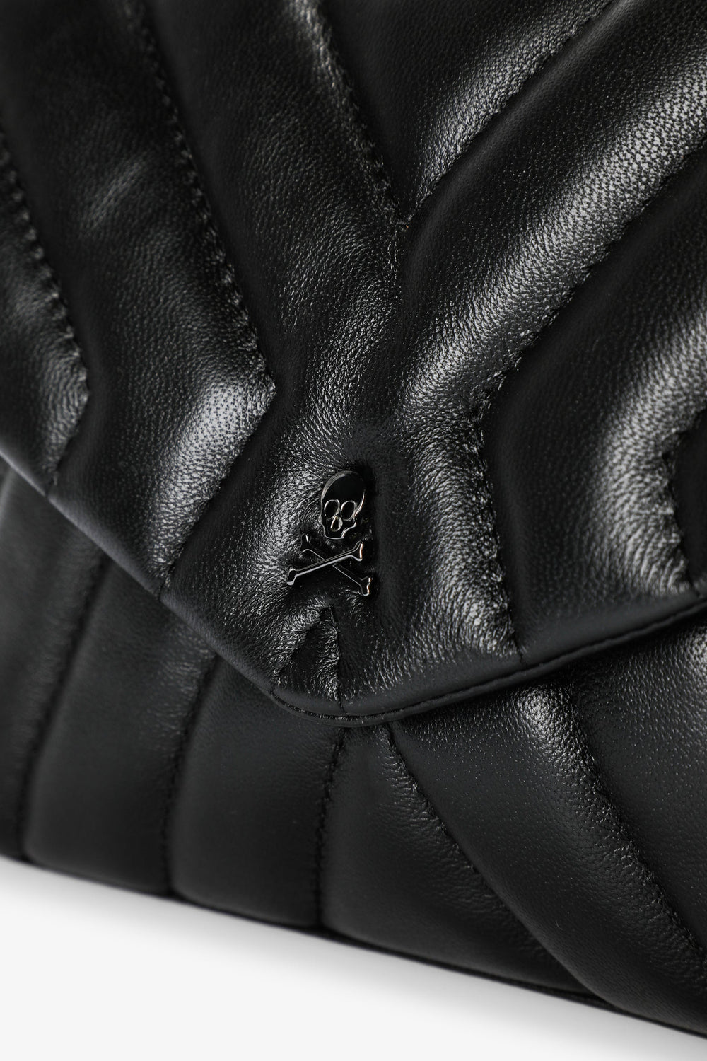 Mini bag made of quilted 100% leather. Magnetic fastening with a flap, chain strap or adjustable leather handle and inner compartments. Metallic skull on the front.