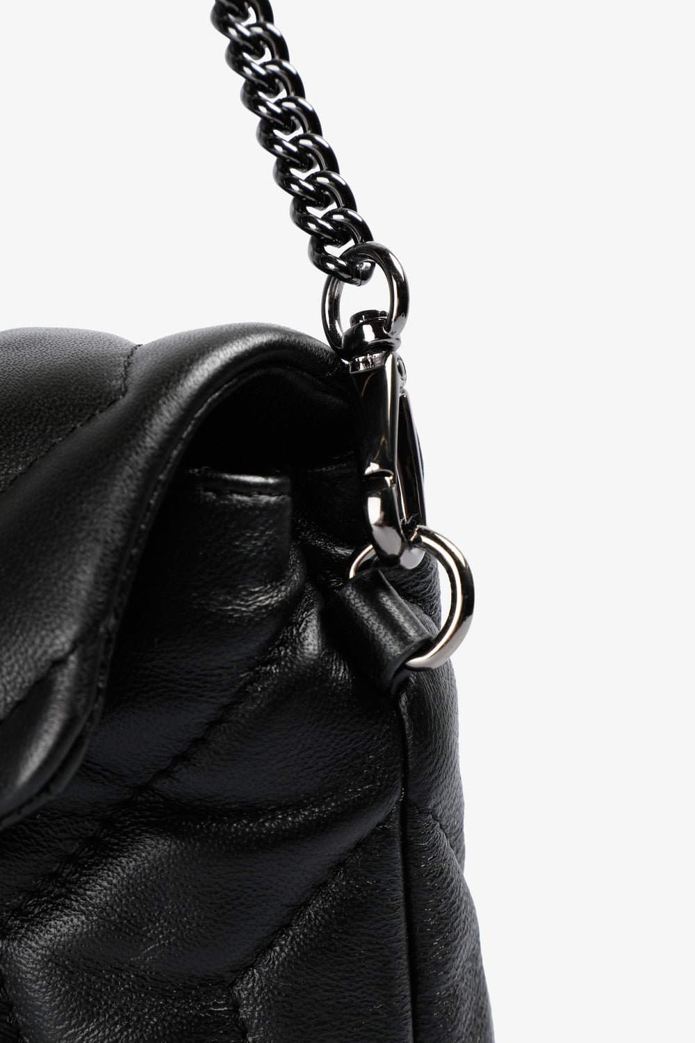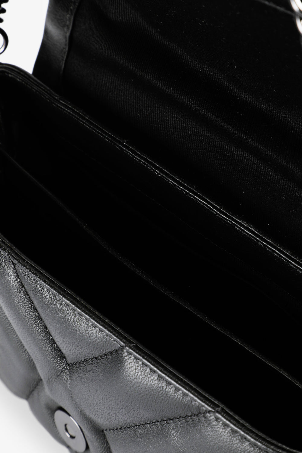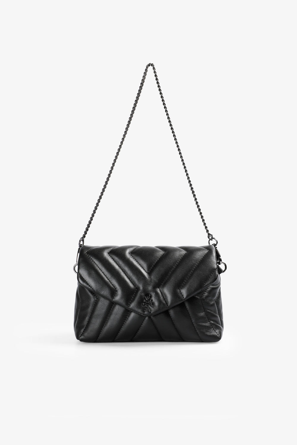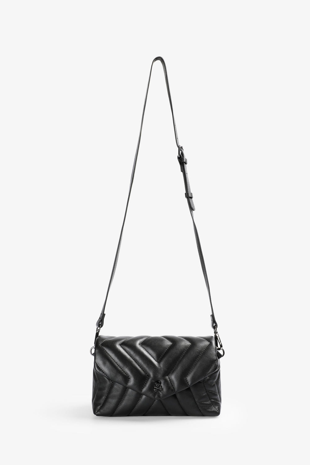 Mini bag made of quilted 100% leather. Magnetic fastening with a flap, chain strap or adjustable leather handle and inner compartments. Metallic skull on the front.
