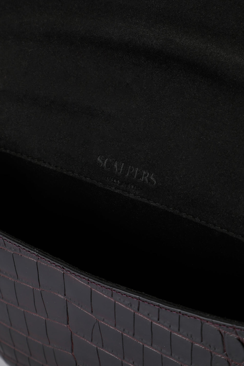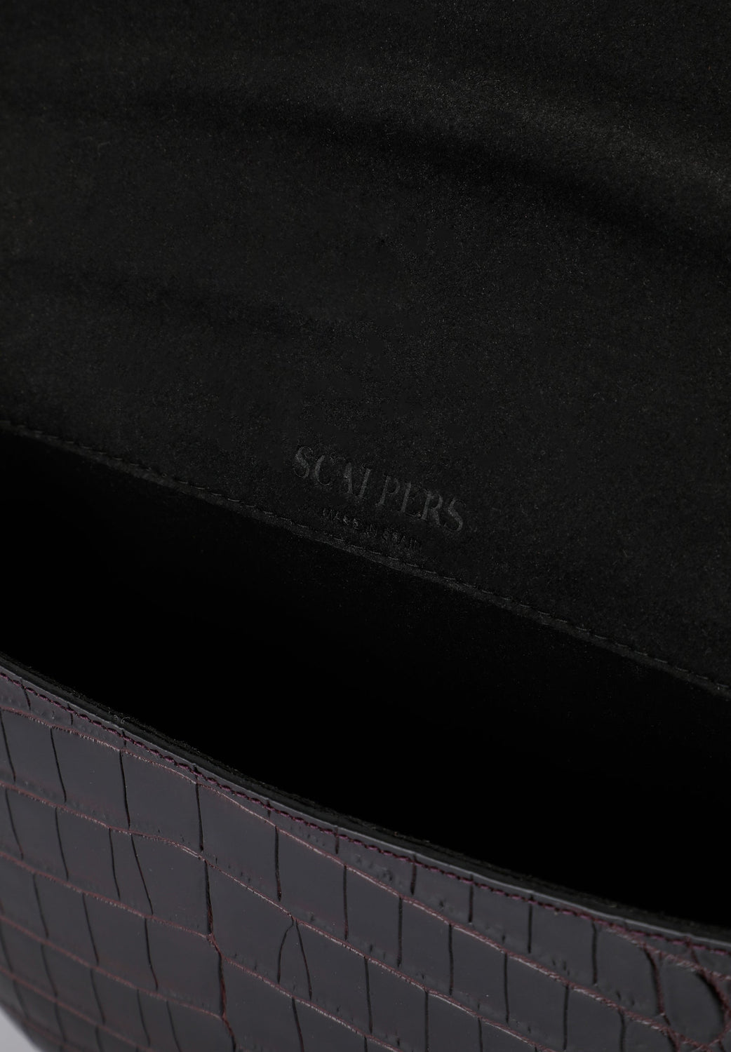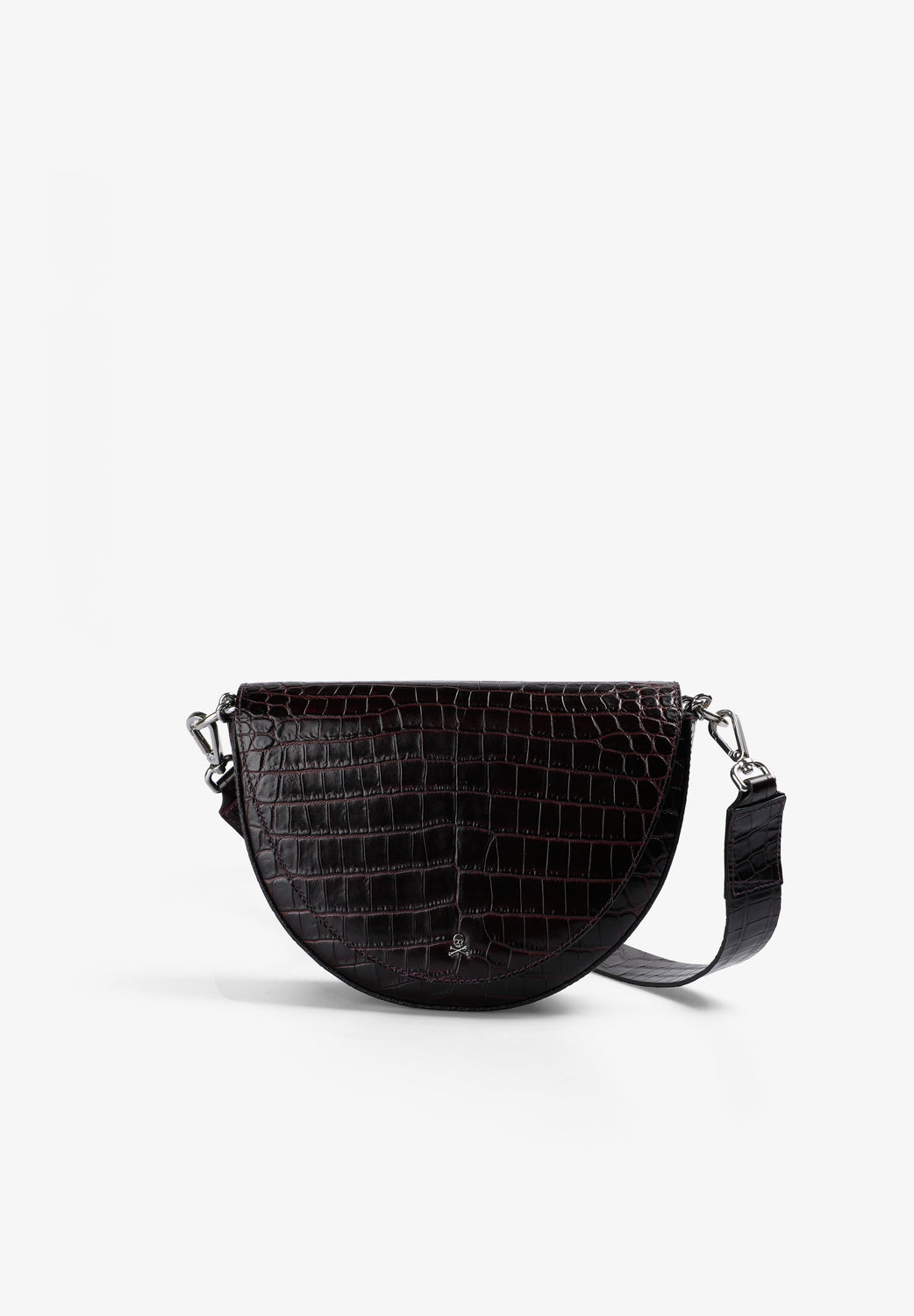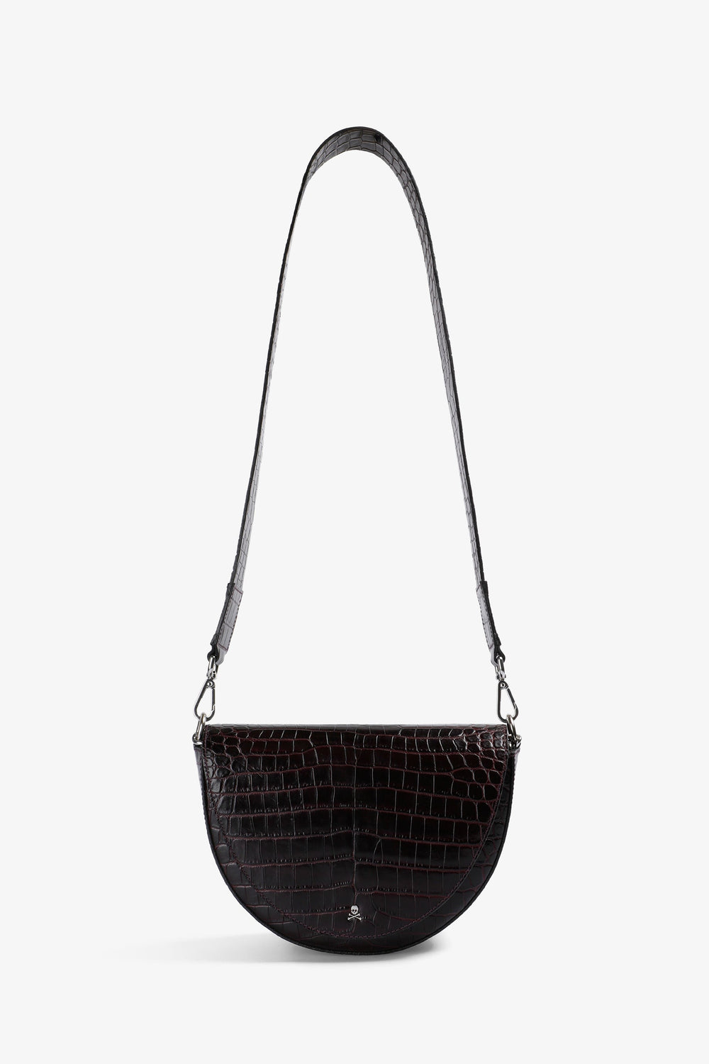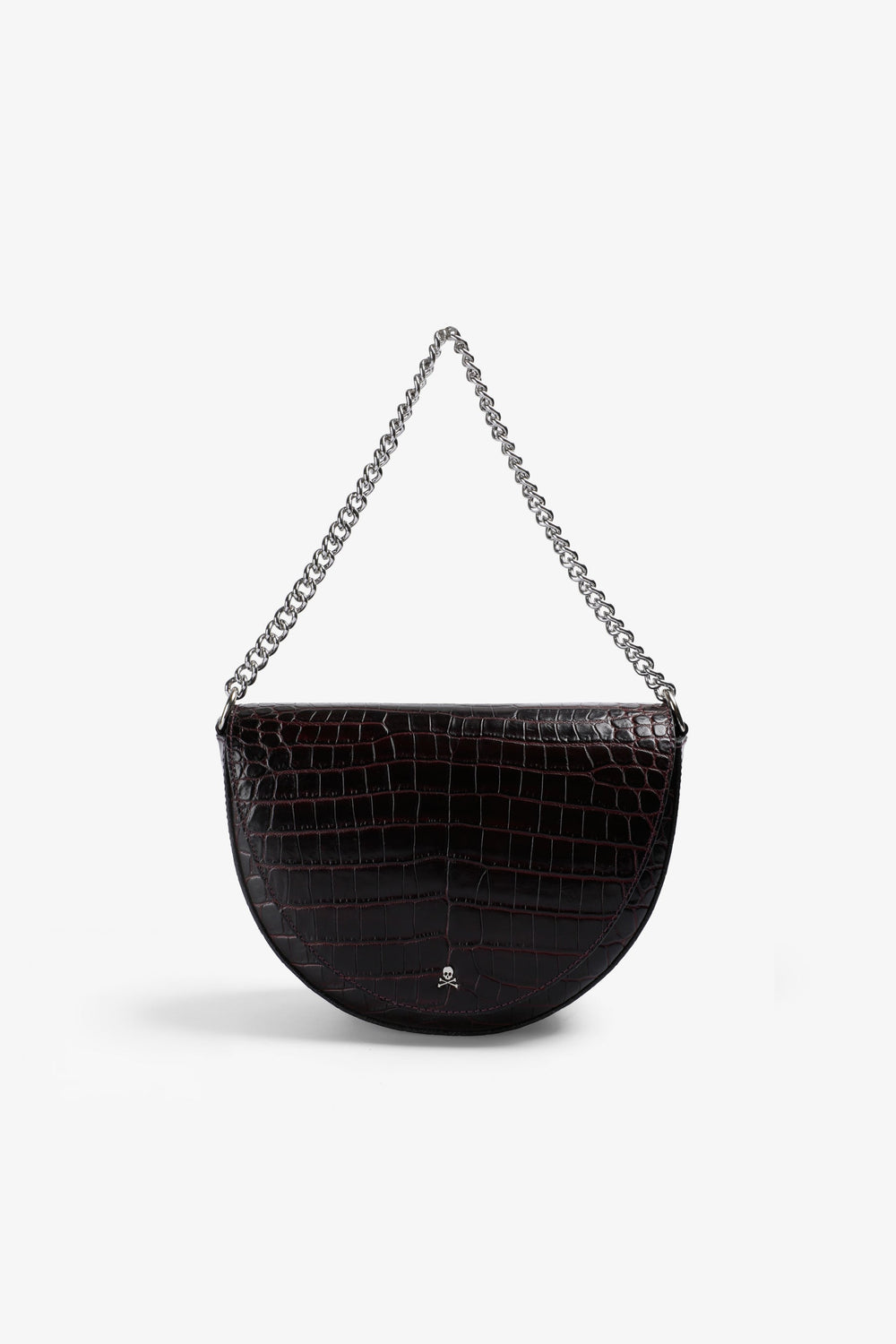 Engraved leather bag. Made of 100% leather. Magnetic closure with flap. Long detachable strap. Chain detail as short handle