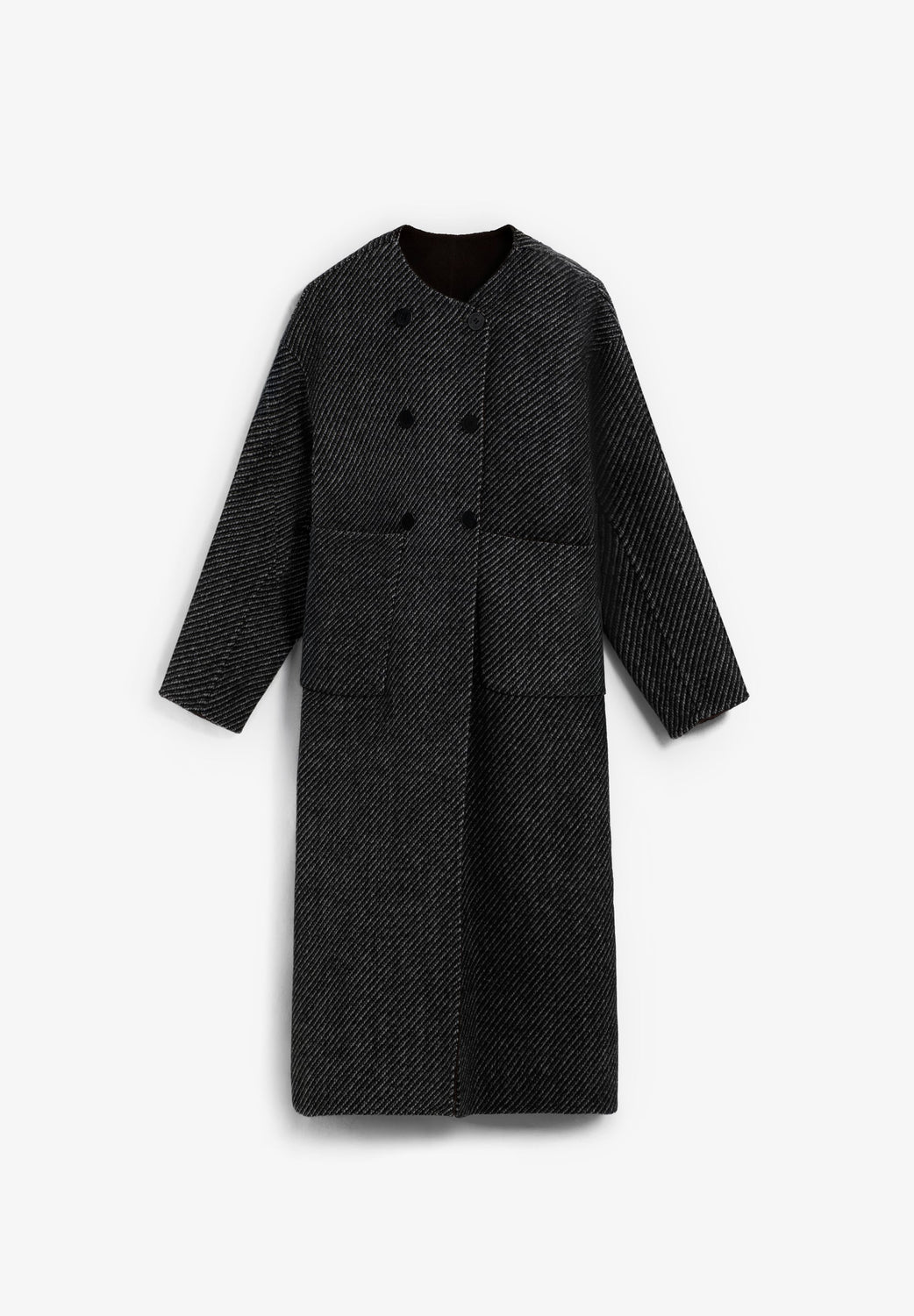 Long coat made of a reversible wool blend. Regular fit. Round collar with no lapels. Grey herringbone print and plain brown options. Patch pockets on the herringbone option and slanted pockets on the plain reverse side.
