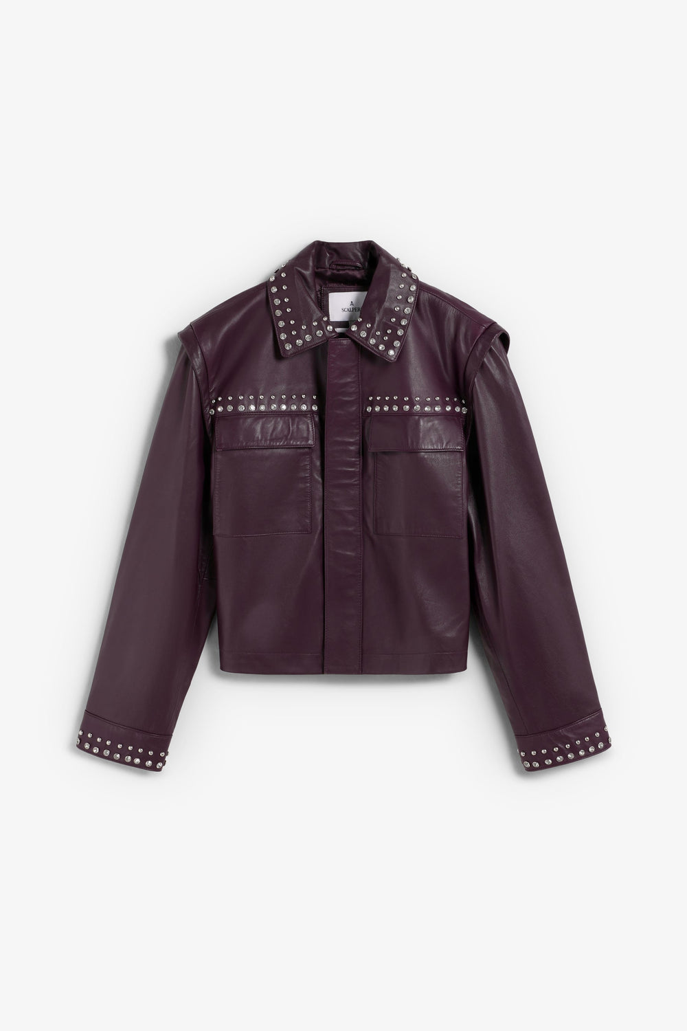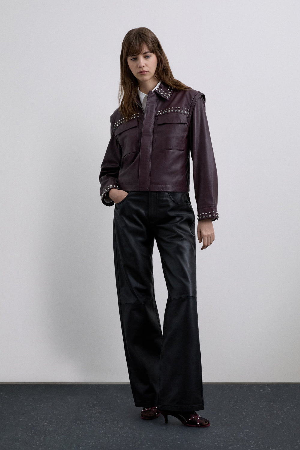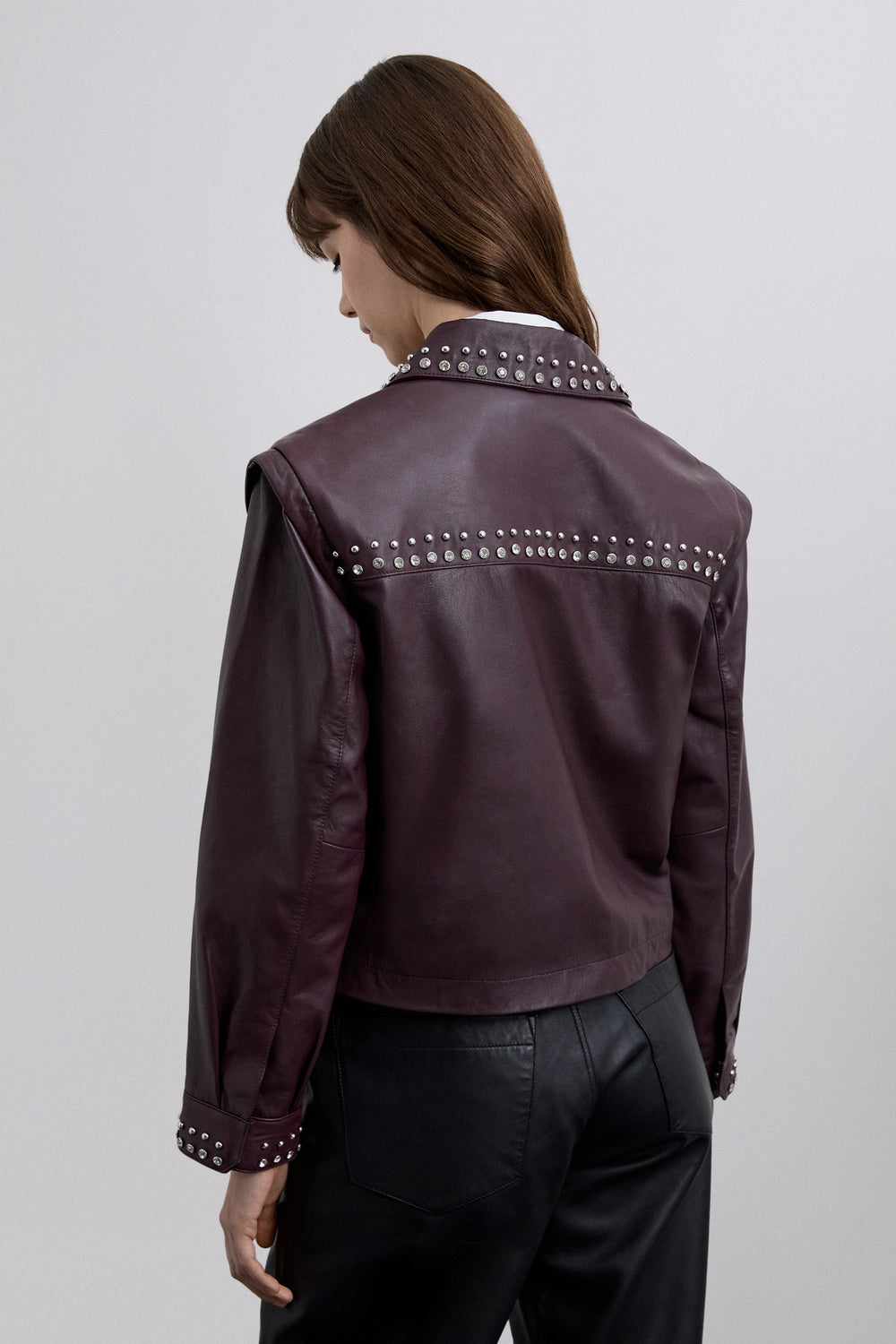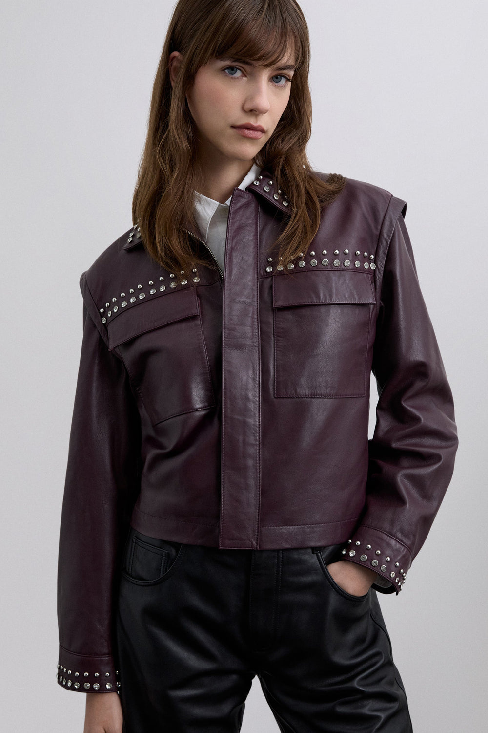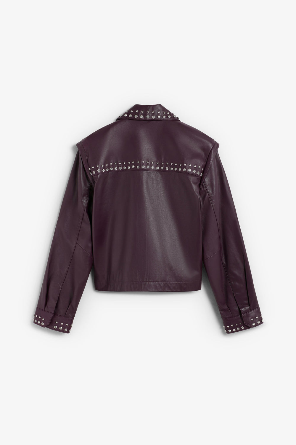 Jacket made of 100% leather. Regular fit. Classic collar. Embroidered details with studs and rhinestones. Front zip and press stud fastening. Front patch pockets. Long straight sleeves with buttoned cuffs.