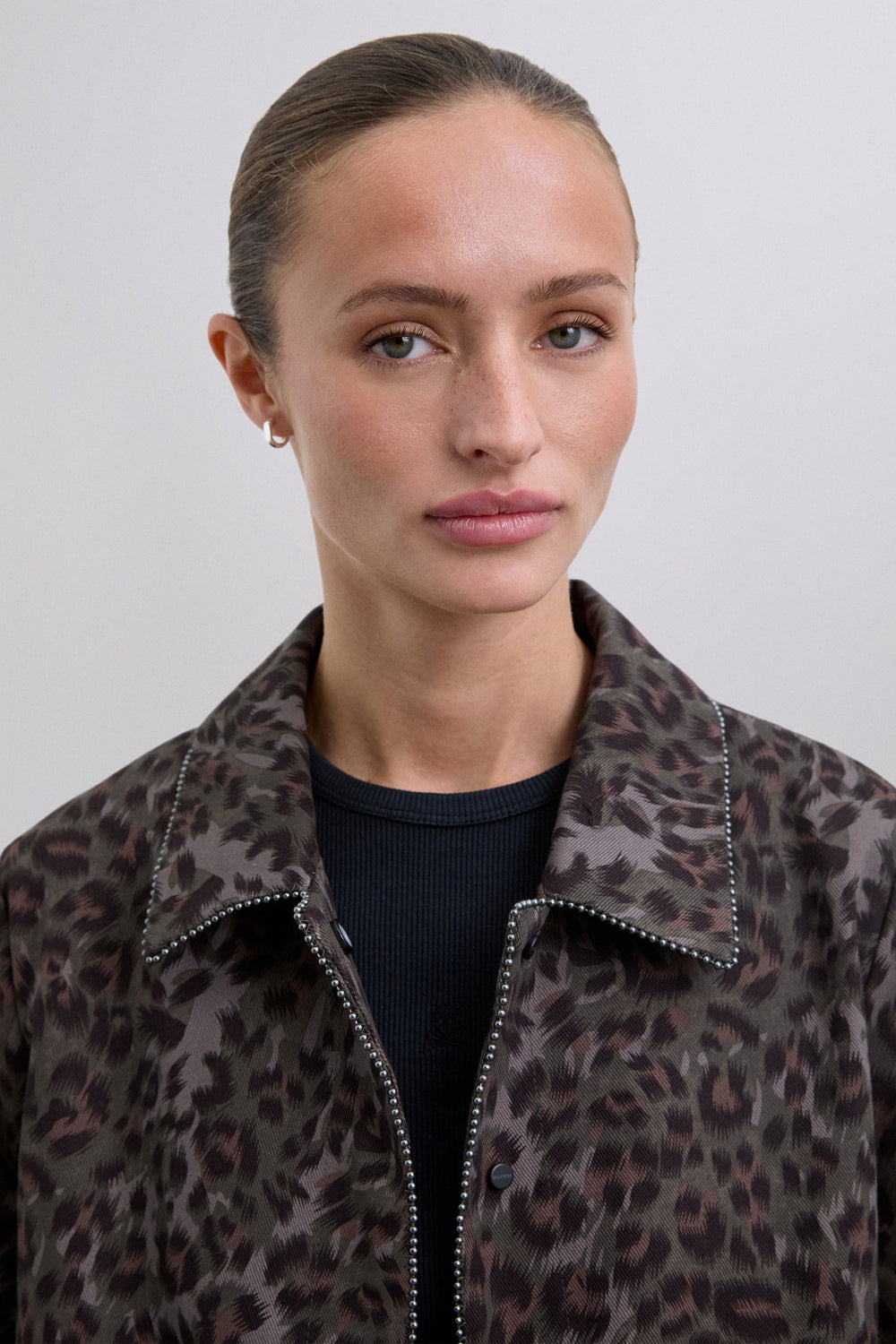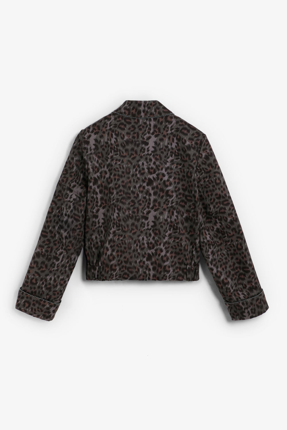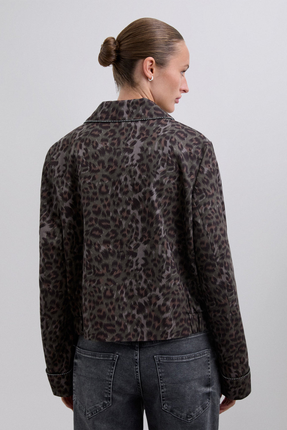 Jacket made of 100% cotton with animal print. Lining detail with metallic studs. Long sleeves with turn-back cuffs. Shirt collar. Button fastening concealed by a placket and a visible button. Two flap pockets. Elastic tabs on the sides of the hem.